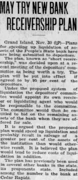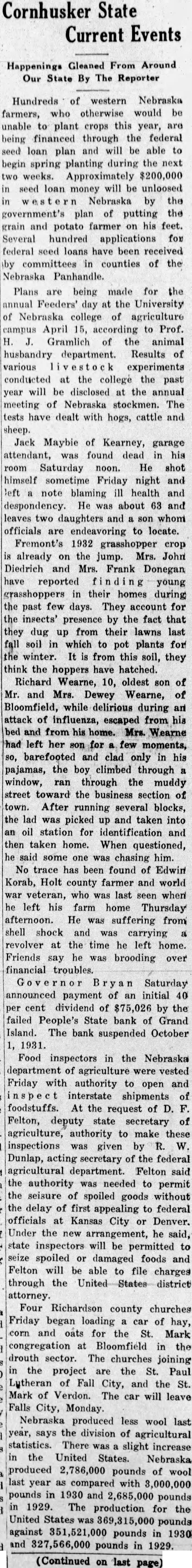 Plans are being made for the annual Feeders' day at the University of Nebraska college of agriculture campus April 15, according to Prof. Gramlich of the animal husbandry department. Results of various experiments conducted at the college the past year will be disclosed at the annual meeting of Nebraska stockmen. The tests have dealt with hogs, cattle and sheep. Jack Maybie of Kearney, garage attendant, was found dead in his room Saturday noon. He shot himself sometime Friday night and left note blaming ill health and despondency. He was about 63 and leaves two daughters and son whom officials are endeavoring to locate. Fremont's 1932 grasshopper crop already on the jump. Mrs. John Diedrich and Mrs. Frank Donegan have reported young grasshoppers in their homes during the past few days. They account for the insects' presence by the fact that they dug up from their lawns last soil in which to pot plants for winter. It is from this soil, they think the hoppers have hatched. Richard Wearne, 10, oldest son of Mr. and Mrs. Dewey Wearne, of Bloomfield, while delirious during an attack of influenza, escaped from his bed and from his home. Mrs. Wearne had left her few moments, so, barefooted and clad only in his pajamas, the boy climbed through window, ran through the muddy street toward the business section of town. After running several blocks, lad was picked up and taken into oil station for identification and then taken home. When questioned, said some one was chasing him. No trace has been found of Edwin Korab, Holt county farmer and world veteran, who was last seen when he left his farm home Thursday afternoon. He was suffering from shell shock and was carrying revolver at the time he left home. Friends say he was brooding over financial troubles. Saturday announced payment of an initial 40 per cent dividend of by the failed People's State bank of Grand Island. The bank suspended October 1931. Food inspectors in the Nebraska department of agriculture were vested Friday with authority to open and interstate shipments of foodstuffs. At the request of Felton, deputy state secretary of agriculture, authority to make these inspections was given by W. Dunlap, acting secretary of the federal agricultural department. Felton said the authority was needed to permit the seisure of spoiled goods without delay of first appealing to federal officials at Kansas City or Denver. Under the new arrangement, he said, state inspectors will be permitted to spoiled or damaged foods and Felton will be able to file charges through the attorney. Four Richardson county churches Friday began loading a car of hay, corn and oats for the St. Mark congregation at Bloomfield in the drouth sector. The churches joining the project are the St. Paul Lutheran of Fall City, and the St. Mark of Verdon. The car will leave Falls City, Monday. Nebraska produced less wool last year, says the division of agricultural statistics. There slight increase in the United States. Nebraska produced 2,786,000 pounds of wool last year as compared with pounds in 1930 and pounds in 1929. The for production the United States pounds against pounds in 1930 and pounds in 1929.