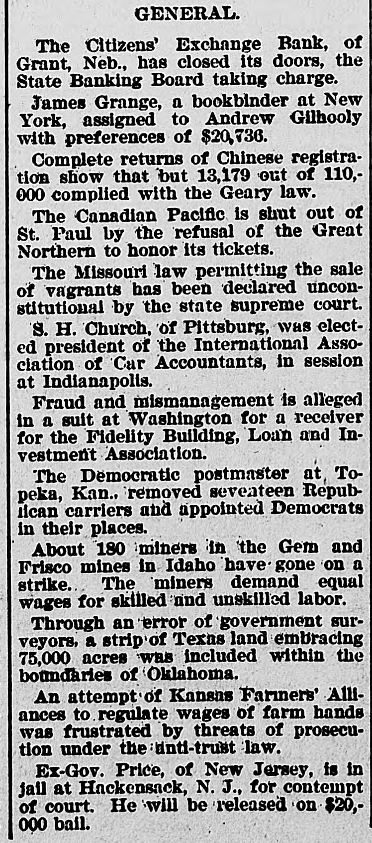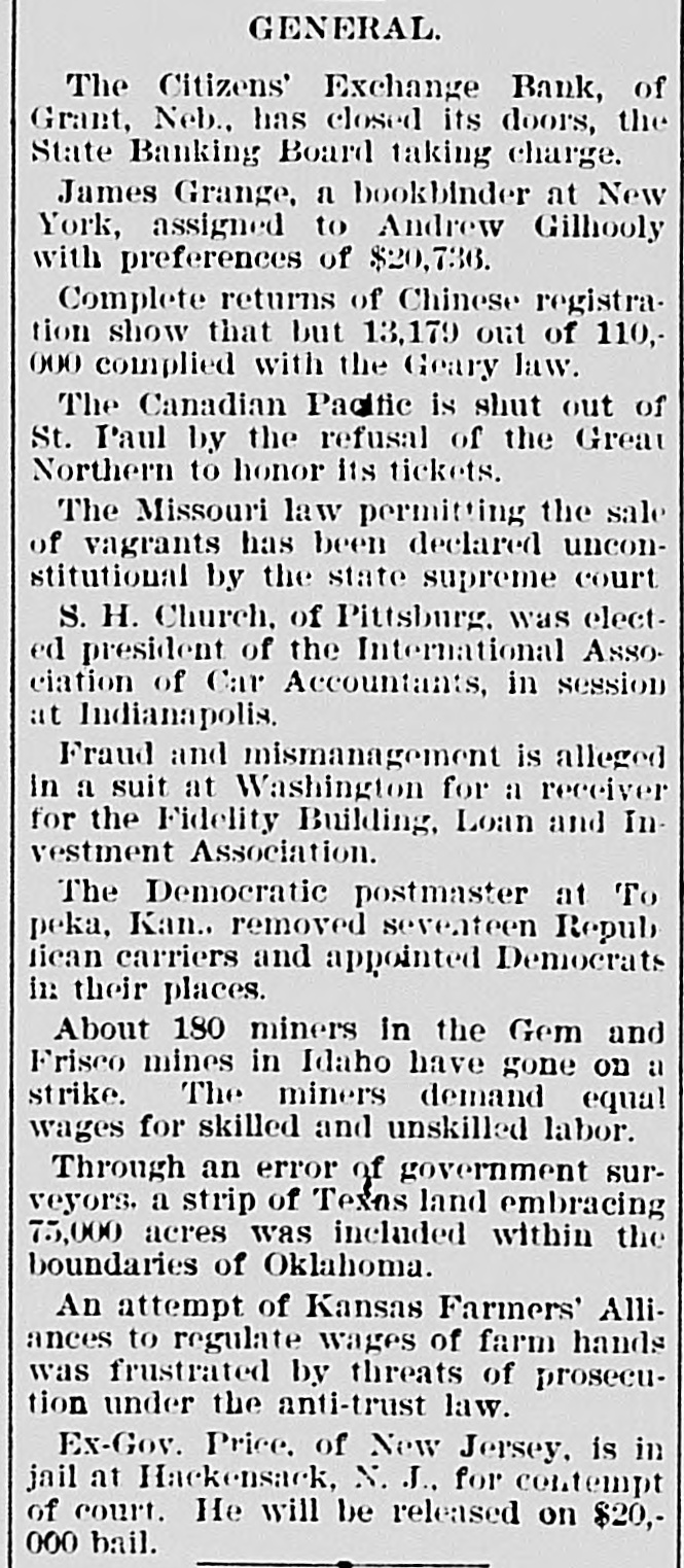 A 5-YEAR-OLD son of William Atherton, of Guthrie, O. T., while playing the about some building stone, pulled pile down on himself and was killed. ANDY MULDOON, an oil well shooter, was hauling 200 quarts of glycerine to Guffey Station, Pa. The wagon was overturned and an explosion ensued, which left nothing of Muldoon and his horses but shreds of flesh. PRINCESS EULALIA has presented to Robert A. Parke of the Pennsylvania Railroad, a beautiful and costly dagger, highly ornamented and inlaid with jewels. Mr. Parke had personal charge of the train in which the Princess traveled. A NEW YORK dispatch says that Mrs. Eleanor Fletcher Bishop, the mother of the late Washington Irving Bishop, the famous mind-reader, masannounced her marriage to Lucius Langdon Nicholas, whoi is said to be a great-great-grandson of an emperor of Russia. JOHN CRAMER and Charles Kennel tempted to drive across the tracks of the Reading Railroad Company at Philadelphia in front of an express train. The engine struck their wagon, demolishing it and instantly killing Cramer. Kennel's leg was broken and he was terribly bruised. MGR SATOLLI, papal delegate, is in St. Paui. THE People's Bank at Pomona, Cal., has closed. CONGRESS will be asked to establish a national board of health. THE Bank of Commerce at San Francisco has closed its doors. THE First National Bank of New Whateom, Wash., has failed. A RECEIVER has been appointed for the Omaha & St. Louis Railroad. THE armored cruiser Maine was launched at Brooklyn navy yard on June 22. LETTERS of credit on Europe SO far are not more than 20 percent of the amount last year. THE City National Bank of Greenville, Mich., has failed. The deposits are $210,000. A CORRESPONDENT in Rio Janeiro telegraphs that the Vatican envoy there has been removed. TYPUS FEVER has broken out in the garrison at Munich. It is due to the quality of the food. THE Reading and Grand Trunk roads have formed a close traffic arrangement. The alliance is important. WILLIAM KLINE, of Brightwood, Ind. was murdered while asleep at his home. A hatchet was the weapon. ALNIN G. CLARKE, missing from Home City, O., has been found in Chicago. Creditors will be paid in full. BURGLAR HENDERSON has confessed to the murder of John Tarpin at Haughville, Ind. He is under arrest. POPULIST railway commissioners in Kansas are preparing for an onslaught upon freight tariffs in that state. DECATUR'S grand jury caused surprise by returning no indictment against the lynchers of Sam Bush, the negro. THE Rev. Rodney Edwards, formerly pastor of Trinity Church in San embez- Francisco, was arrested charged with zling $1,200 trust funds. IT is said Justice Fitzgerald, of the California supreme court, will be named by Gov. Markham as United States senator to succeed Mr. Stanford. SEWARD A. SIMONS, a lawyer of Buffalo, is on trial for violating the alien labor law. He is accused of sending to Canada for a coachman and a gardener. PETITIONS have been addressed to Flower, of New York, declaring Tonathat Gov. troops are not needed at wanda and asking their withdrawal. THE Duke of Veragua has sent a letter to Secretary Gresham thanking the government for the manner in which he was entertained while in the United States. RAINMAKER MELBOURNE has made a contract with Senator Warren and other citizens of Laramie County, Wyo., to produce one-half inch of rain within the next five days. THE Iowa Republican convention will meet at Des Moines August 15. NINETEEN persons were prostrated by heat in New York on the 20th. JAMES GRANGE, a bookbinder at New York, assigned to Andrew Gilhooly with preferences of $20,736. THE Citizens' Exchange Bank, the of Grant, Neb., has closed its doors, State Banking Board taking charge. RATES of $51 first class and $33 second were St. Paul to San Francisco, class, announced by the Great Northern. JAMES McCLAY, charged with placing Centies the tracks of the Michigan tral Railroad with a view of wrecking a train, was convicted at Saginaw, Mich A STEADY improvement in the condiof labor is shown by the report of a tion sub-committee of the Senate committee on finance on prices and wages for fifty years. THE death is announced at New York of Mareschal Jose Simeaode Oliveria, of Brazil, president of the Brazilian com- Exmission to the World's Columbian position. JUSTICE BEACH, of New York, granted Blanc a decree of absolute Frederick from Elizabeth Blanc, the divorce "Baroness." She is enjoined from the use of his name. IT has been learned that Ralph E. Gaylord, who left Omaha, Neb., sixty have days ago, and who was thought to He insane, is in financial distress. debts. has been probably fled to escape his PHIL Eddy, who was to have been to the beautiful and accommarried plished Widow Davis, at Columbus, is said to have robbed her of $300, which Ind., she had intrusted to his keeping. WALTER BESANT, the English novelist, has arrived at New York. Miss LOUISE ESTLING committed suicide at Sedalia, Mo., by hanging. MGR. SATOLLI' attitude on the school Pope. question is again indorsed by citizen the of PHILLIP GRAVER, a wealthy Allegheny City, Pa., committed suicide
