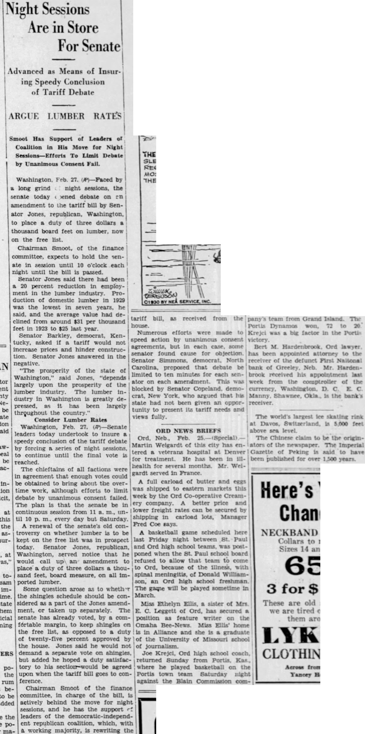 Sessions in Senate Advanced as Means of InsurSpeedy Conclusion Tariff Debate ARGUE LUMBER RATES Smoot Has Support of Leaders Coalition in His Move for Night To Limit Debate by Unanimous Consent Washington, Feb. by long grind night sessions, the senate today ened debate on on amendment to the tariff bill by Senator Jones, republican, Washington, to place duty of three dollars thousand board feet on lumber, now on the free list. Chairman Smoot, of the finance committee, expects to hold the senate in session until 10 o'clock each night until the bill passed. Senator said there had been 20 percent reduction in employment in the lumber industry. Production of domestic lumber in 1929 the lowest in seven years, he said, and the average value had detariff clined from around $31 per thousand house. feet in 1923 to $25 last year. Senator Barkley, democrat, Kenspeed tucky, asked tariff would not increase prices and hinder construction. Senator Jones answered in the negative. prosperity of the state of Washington," said Jones, "depends ator largely upon the prosperity of the lumber industry. The lumber industry in Washington is greatly depressed, as has been largely throughout the country." views Consider Lumber Rates Washington, Feb. 27. leaders today undertook to insure Ord, speedy conclusion of the tariff debate Martin by forcing series of night sessions, tered to continue until the final vote reached. The chieftains of all factions were agreement that enough votes could be obtained to bring about the overtime work, although efforts to limit debate by unanimous consent failed. The plan is that the senate be in from 11 until every day but Saturday. Fred Coe A renewal of the senate's old controversy on whether lumber to be kept the free list was in prospect today. Senator Jones, republican, Washington, served notice that he would call amendment place duty of three dollars thousand feet, board measure, on all imported lumber. Some question arose as to whether The the shingles schedule should be con- March. sidered part of the Jones amendment, taken up separately. The senate has already voted, by comfortable margin, to keep shingles on Omaha the free list, as opposed to duty in of percent approved by the the house. Jones said he would not demand separate vote on shingles, but added he hoped duty satisfactory to his be agreed upon when the tariff bill goes to con- Portis ference. against Chairman Smoot of the finance committee. in charge of the bill, actively behind the move for night sessions, and he has the support leaders of the ent republican coalition, which, with working majority, is rewriting the bill, as received from the Numerous efforts were made action by unanimous consent agreements, but in each case, some senator found cause for objection. Senator Simmons, democrat, North Carolina, proposed that debate be limited to ten minutes for each seneach amendment. This was blocked by Senator Copeland. democrat, New York, who argued that his state had not been given an opportunity to present its tariff needs and fully. ORD NEWS BRIEFS Neb., Feb. The Chinese claim to Weigardt of this city has ators the newspaper. veterans hospital at Denver Gazette of Peking for treatment. He has been in been published for over health for several months. Mr. Welgardt served in France. A full carload of butter and eggs was shipped to eastern markets this week by the Ord Co-operative Creamcompany. better price and lower freight rates can be secured by shipping in carload lots, Manager says. basketball game scheduled here NECKBAND last Friday night between St. Paul and Ord high school teams. was postSizes 14 and poned when the St. Paul school board refused to allow that team to come to Ord, because of the illness, with spinal meningitis, of Donald Williaman Ord high school freshman. game will be played sometime in for These are old Miss Ethelyn Ellis, sister of Mrs. E. Leggett of Ord, has secured are tired position as feature writer on the them Bee-News. Miss Ellis' home Alliance and she graduate University of Missouri school journalism. Joe Krejci, Ord high school coach, CLOTHING returned Sunday from Portis, Kas where he played basketball the from town team Saturday night Yancey Hotel the Blain Commission com- team from Grand Island. The Dynamos won, 72 to Krejci big factor in the Portis victory. Bert M. Hardenbrook, Ord lawyer. has been appointed attorney to the receiver the defunct First Naitonal bank of Greeley, Neb. Mr. Hardenbrook received his appointment week from the comptroller the currency, Washington, Manny, Shawnee, Okla., the receiver. The world's largest ice skating rink Davos, Switzerland, feet above sea level. the originThe Imperial said have years.