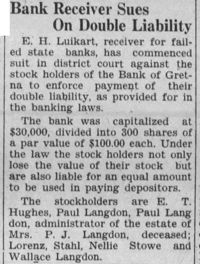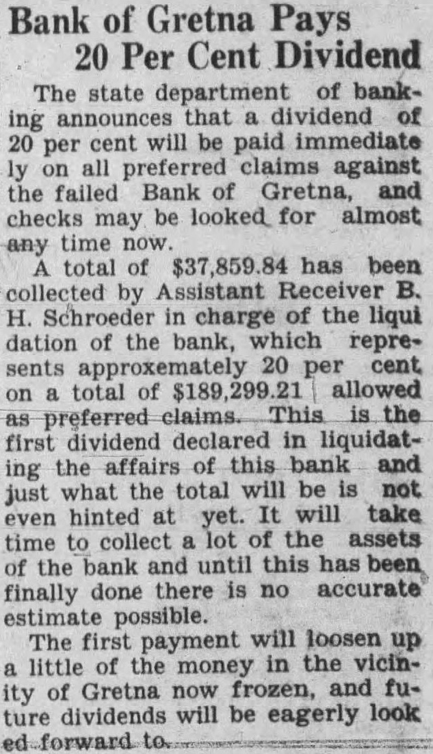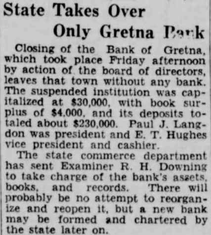 failure of banks in the state caused the failure of the Bank of Gretna. There was no run on the bank, as such are known, but steady abnormal withdraw als extending over a period of time prevented officials from weathering the storm. It is hoped by the state department, now in charge of the bank, that orderly liquidation can be made.