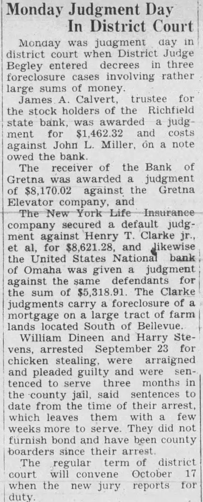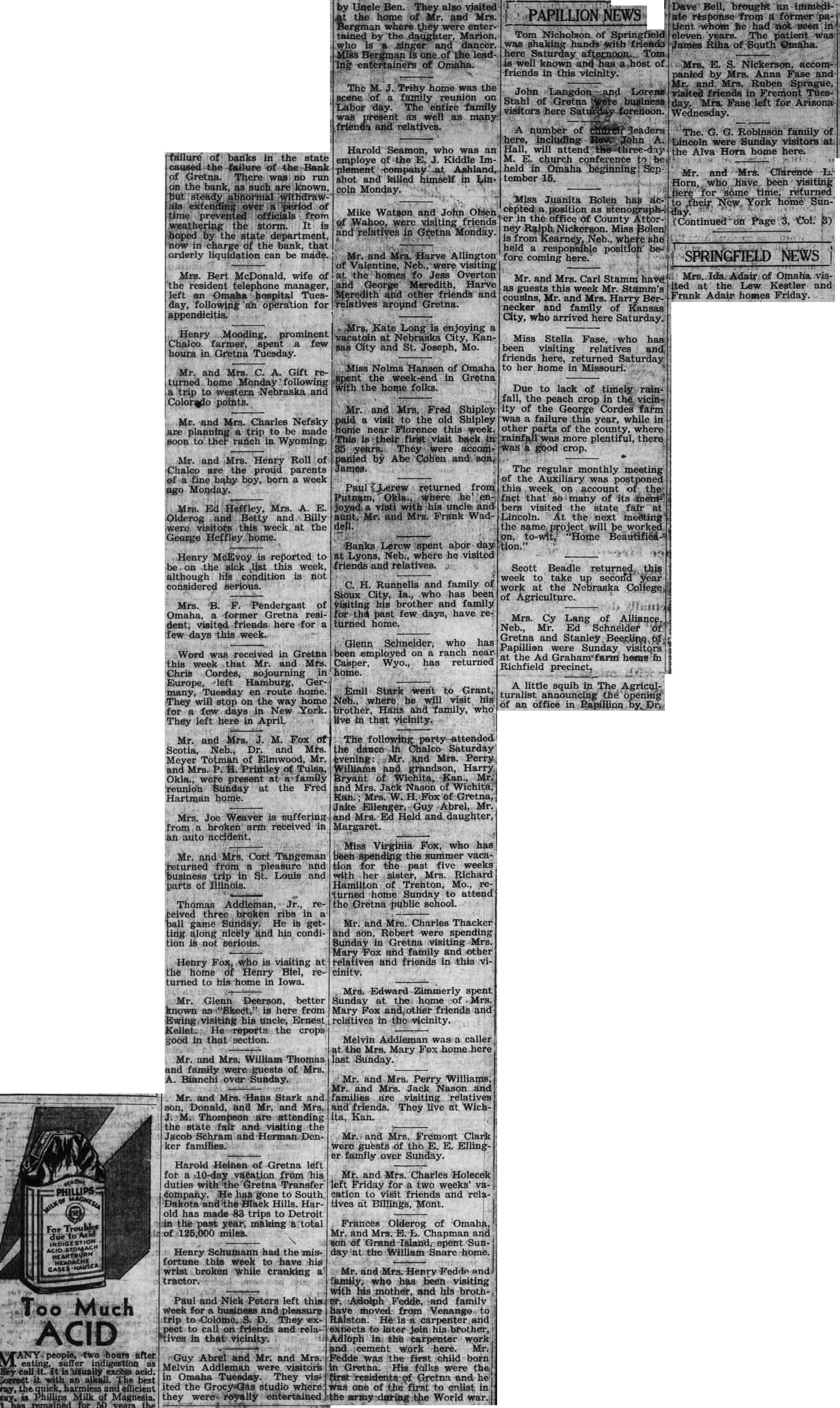 Mr. and Mrs. Henry Fedde and family, who has been visiting with his mother, and his brother. Adolph Fedde, and family have moved from Venango to Râlston. He is a carpenter and expects to later join his brother, Adloph in the carpenter work and cement work here. Mr. Fedde was the first child born in Gretna. His folks were the first residents of Gretna and he was one of the first to enlist in the army during the World war.