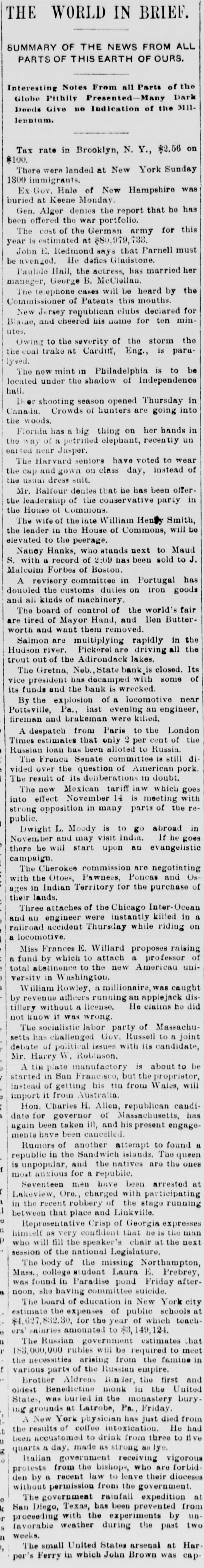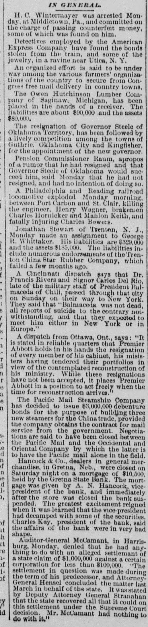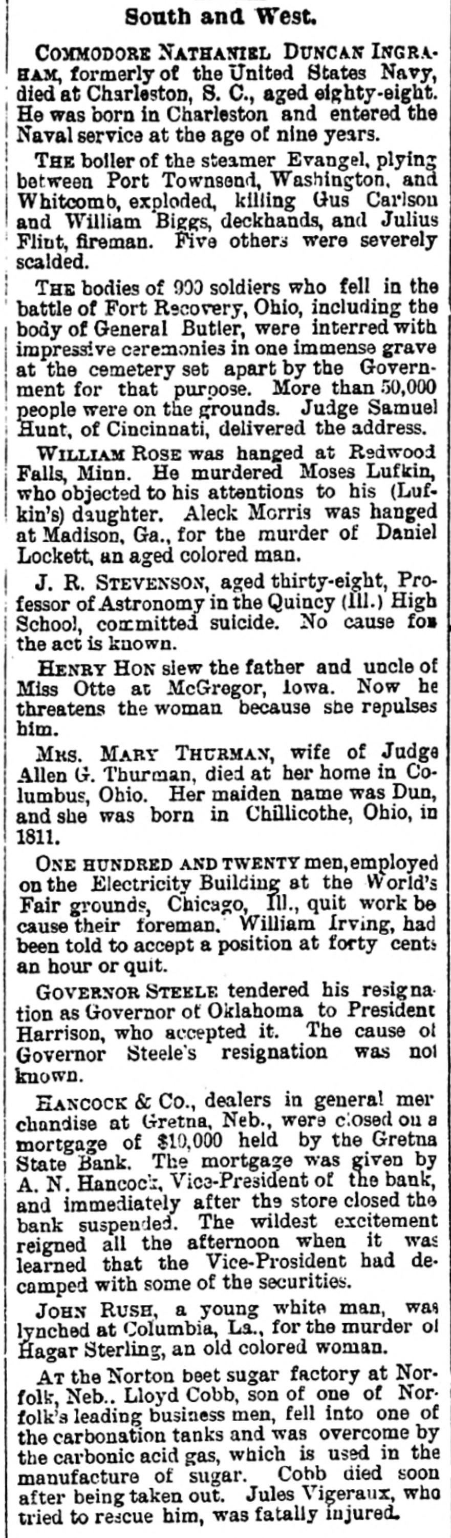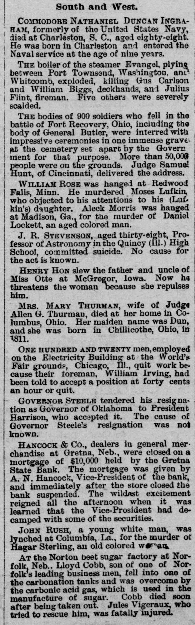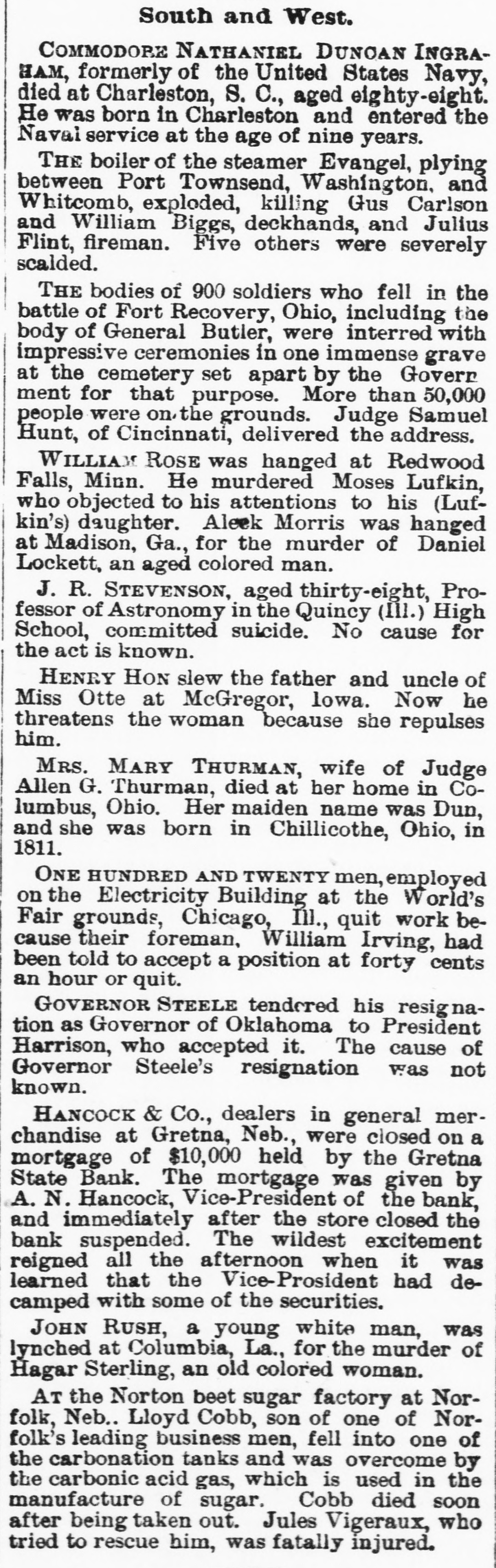 South and West. COMMODORE NATHANIEL DUNCAN INGRAHAM, formerly of the United States Navy, died at Charleston, S. C., aged eighty-eight. He was born in Charleston and entered the Naval service at the age of nine years. THE boiler of the steamer Evangel, plying between Port Townsend, Washington, ant Whitcomb, exploded, killing Gus Carlson and William Biggs, deckhands, and Julius Flint, fireman. Five others were severely scalded. THE bodies of 900 soldiers who fell in the battle of Fort Recovery, Ohio, including the body of General Butler, were interred with impressive ceremonies in one immense grave at the cemetery set apart by the Govern ment for that purpose. More than 50,000 people were on the grounds. Judge Samuel Hunt, of Cincinnati, delivered the address. WILLIAM ROSE was hanged at Redwood Falls, Minn. He murdered Moses Lufkin, who objected to his attentions to his (Luf. kin's) daughter. Aleck Morris was hanged at Madison, Ga., for the murder of Daniel Lockett, an aged colored man. J. R. STEVENSON, aged thirty-eight, Professor of Astronomy in the Quincy (III.) High School, committed suicide. No cause for the act is known. HENRY HON slew the father and uncle of Miss Otte at McGregor, lowa. Now he threatens the woman because she repulses him. MRS. MARY THURMAN, wife of Judge Allen G. Thurman, died at her home in Columbus, Ohio. Her maiden name was Dun, and she was born in Chillicothe, Ohio, in 1811. ONE HUNDRED AND TWENTY men, employed on the Electricity Building at the World's Fair grounds, Chicago, III., quit work because their foreman, William Irving, had been told to accept a position at forty cents an hour or quit. GOVERNOR STEELE tendered his resig nation as Governor of Oklahoma to President Harrison, who accepted it. The cause of Governor Steele's resignation was not known. HANCOCK & Co., dealers in general mer. chandise at Gretna, Neb., were closed on a mortgage of $10,000 held by the Gretna State Bank. The mortgage was given by A. N. Hancock, Vice-President of the bank, and immediately after the store closed the bank suspended. The wildest excitement reigned all the afternoon when it was learned that the Vice-Prosident had decamped with some of the securities. JOHN RUSH, a young white man, was lynched at Columbia, La., for the murder of Hagar Sterling, an old colored went AT the Norton beet sugar factory at Norfolk, Neb.. Lloyd Cobb, son of one of Norfolk's leading business men, fell into one of the carbonation tanks and was overcome by the carbonic acid gas, which is used in the manufacture of sugar. Cobb died soon after being taken out. Jules Vigeraux, who tried to rescue him, was fatally injured.