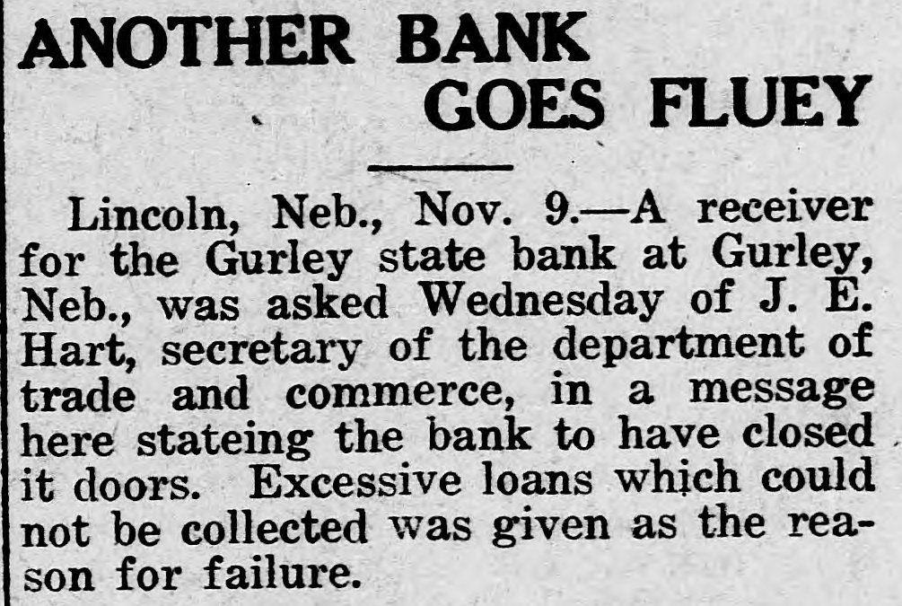 ANOTHER BANK GOES FLUEY Lincoln, Neb., Nov. 9.-A receiver for the Gurley state bank at Gurley, Neb., was asked Wednesday of J. E. Hart, secretary of the department of trade and commerce, in a message here stateing the bank to have closed it doors. Excessive loans which could not be collected was given as the reason for failure.