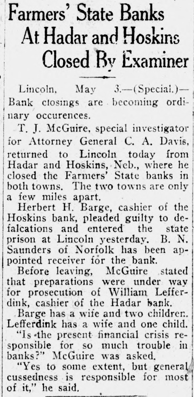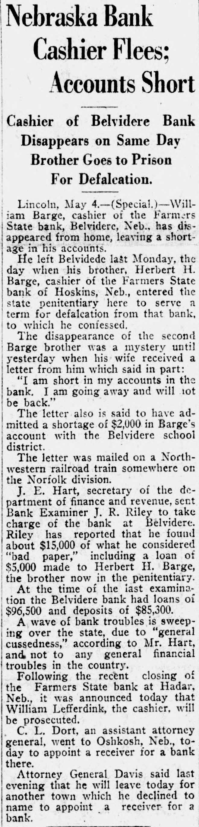Nebraska Bank Cashier Flees; Accounts Short Cashier of Belvidere Bank Disappears on Same Day Brother Goes to Prison For Defalcation. Lincoln, May 4.-(Special.)--William Barge, cashier of the Farmers State bank, Belvidere, Neb., has disappeared from home, leaving a shortage in his accounts. He left Belvidede last Monday, the day when his brother, Herbert H. Barge, cashier of the Farmers State bank of Hoskins, Neb., entered the state penitentiary here to serve a term for defalcation from that bank, to which he confessed. The disappearance of the second Barge brother was a mystery until yesterday when his wife received a letter from him which said in part: "I am short in my accounts in the bank. I am going away and will not be back." The letter also is said to have admitted a shortage of $2,000 in Barge's account with the Belvidere school district. The letter was mailed on a Northwestern railroad train somewhere on the Norfolk division. J. E. Hart, secretary of the department of finance and revenue, sent Bank Examiner J. R. Riley to take charge of the bank at Belvidere. Riley has reported that he found about $15,000 of what he considered "bad paper," including a loan of $5,000 made to Herbert H. Barge, the brother now in the penitentiary. At the time of the last examination the Belvidere bank had loans of $96,500 and deposits of $85,300. A wave of bank troubles is sweeping over the state, due to "general cussedness," according to Mr. Hart, and not to any general financial troubles in the country. Following the recent closing of the Farmers State bank at Hadar, Neb., it was announced today that William Lefferdink, the cashier. will be prosecuted. C. L. Dort, an assistant attorney general, went to Oshkosh, Neb., today to appoint a receiver for a bank there. Attorney General Davis said last evening that he will leave today for another town which he declined to name to appoint a receiver for a bank.