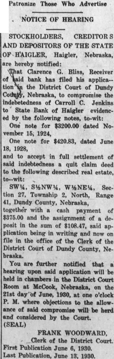 Patronize Those Who Advertise NOTICE OF HEARING STOCKHOLDERS, CREDITORS AND DEPOSITORS OF THE STATE OF HAIGLER, Haigler, Nebraska, are hereby notified: That Clarence G. Bliss, Receiver of said bank has filed his applica-tion in the District Court of Dundy County, Nebraska, to compromise the indebetedness of Carroll C. Jenkins to State Bank of Haigler evidenced by the following notes, to-wit: One note for $3200.00 dated November 15, 1924, One note for $420.83, dated June 18, 1928, and to accept in full settlement of said indebtedness a quit claim deed to the following described real estate, to--wit: tion 27, Township 2, North, Range 41, Dundy County, Nebraska, together with a cash payment of $375.00 and the assignment of a deposit in the sum of $108.47, said application being in writing and now on file in the office of the Clerk of the District Court of Dundy County, Nebraska. You are further notified that a hearing upon said application will be held in chambers in the District Court Room at McCook, Nebraska, on the 21st day June, 1930, at one o'clock P. M. where objections to the allowance of said compromise will be herd and considered by the Court. (SEAL) FRANK WOODWARD, Clerk of the District Court. First Publication June 6, 1930. Last Publication, June 13, 1930.