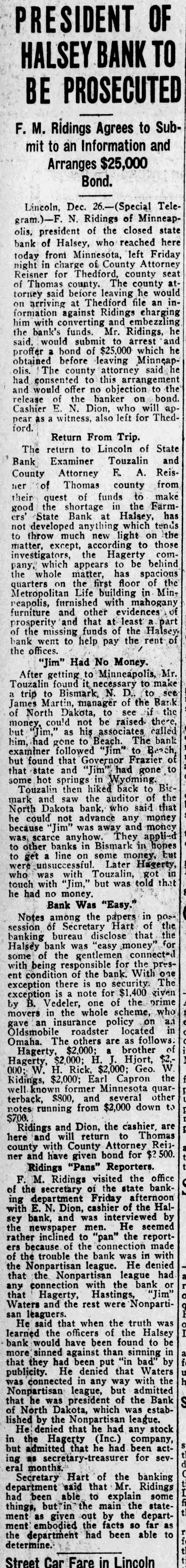 PRESIDENT OF HALSEY BANK TO BE PROSECUTED F. M. Ridings Agrees to Submit to an Information and Arranges $25,000 Bond. Lincoln, Dec. 26.-(Special Telegram.)-F. N. Ridings of Minneapolis, president of the closed state bank of Halsey, who reached here today from Minnesota, left Friday night in charge of County Attorney seat Reisner for Thedford, county atof Thomas county. The county would torney said before leaving he inon arriving at Thedford file an formation against Ridings charging him with converting and embezzling he the bank's funds. Mr. Ridings, and said, would submit to arrest he proffer a bond of $25,000 which obtained before leaving Minneap- he olis. The county attorney said had consented to this arrangement the and would offer no objection to bond. release of the banker on Cashier E. N. Dion, who will apford. pear as a witness, also left for ThedReturn From Trip. The return to Lincoln of State Bank Examiner Touzalin and County Attorney F. A. Reisher of Thomas county from their quest of funds to make good the shortage in the Farm- has crs' State Bank at Halsey, tenus not developed anything which the throw much new light on those matter, to except, according to cominvestigators, the Hagerty behind pany, which appears to be the whole matter, has spacious the quarters on the first floor of Metropolitan Life building in Minreapolis, furnished with mahogany of furniture and other evidences prosperity and that at least Halsey a part of the missing funds of the of bank went to help pay the rent the offices. "Jim" Had No Money. After getting to Minneapolis, make Mr. Touzalin found it, necessary to see trip to Bismark, N. D., to Bank a James Martin, manager of the the of North Dakota, to see if there, money. could not be raised- called but "Jim," as his Beach. associates The bank examiner him, had gone followed to "Jim" to Beach, of but found that Governor Frazier to that state and "Jim" had gone some hot springs in Wyoming. Touzalin then hiked back to Bis- the mark and saw the auditor of that North Dakota bank, who said money he could not advance any money because "Jim" anyhow. was away They and applied was other scarce banks in Bismark in hopes but to some were Hagerty, got in touch with "Jim," but was told that he had no money. Bank Was "Easy." Notes among the papers in pos- the session of Secretary Hart of the bureau disclose that for banking Halsey bank was "easy money" connect of the gentlemen the with some being responsible for pres- one ent condition of the bank. security. With The exception there is no given exception is a note for $1,400 prime B. Vedeler, one of the who by movers in the whole scheme, a.1 an insurance policy on in Oldsmobile gave roadster located Omaha. The others are a brother as follows: of Hagerty, $2,000; $2,000; H. J. Hjort, $2.Hagerty, W. H. Rick, $2,000; Geo. the W 000; Kidings, $2,000; Earl Capron quarknown former Minnesota other well $800, and several to notes terback, running from $2,000 down $700. Ridings and Dion, the cashier, Thomas are and will return to Reishere with County Attorney $2 500. ner county and have given bond for Ridings "Pans" Reporters. F. M. Ridings visited the bank- office the secretary of the state of department Friday afternoon Haling E. N. Dion, cashier of the by with bank, and was interviewed sey newspaper men. He seemed the rather inclined to "pan" the report- made ers because of the connection with of the trouble the bank was in denied Nonpartisan league. He had the that the Nonpartisan league connection with the bank or any Hagerty, Hastings, "Jim" Waters that and the rest were Nonpartisan leaguers. He said that when the truth was learned the officers of the Halsey be bank would have been found to more sinned against than sinning by in that they had been put "in bad h publicity. He denied that Waters the was connected in any way admitted with Nonpartisan league, but S that he was president of the Bank of North Dakota, which was established by the Nonpartisan league. He denied that he had any stock the Hagerty (Inc.) company, in but admitted that he had been acting as secretary-treasurer for several months. Secretary Hart of the banking department said that Mr. Ridings been able to explain some had things, but the main the statement as given out by the depart- far as ment embodied the facts so to the department had been able determine. Street Car Fare in Lincoln