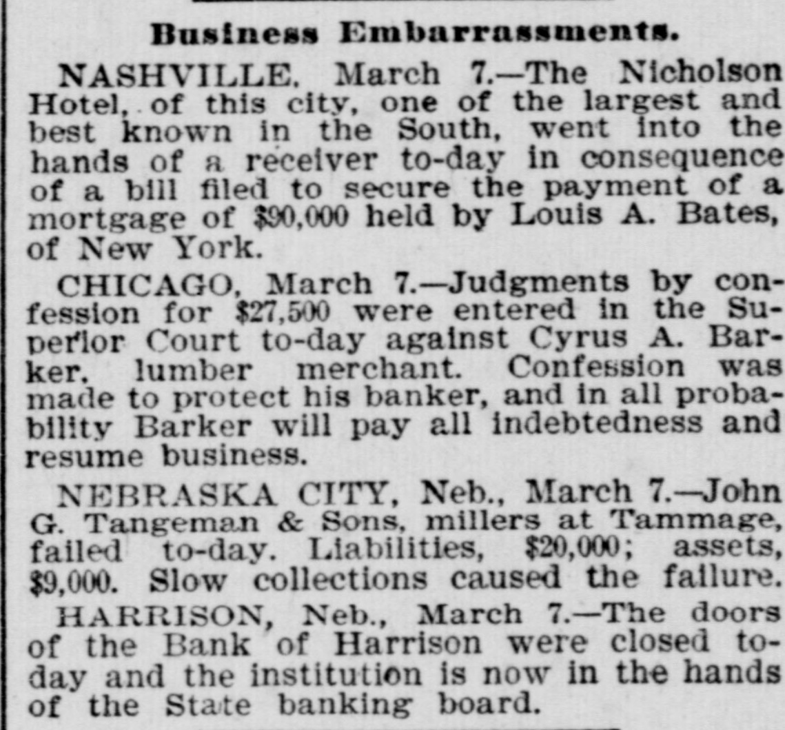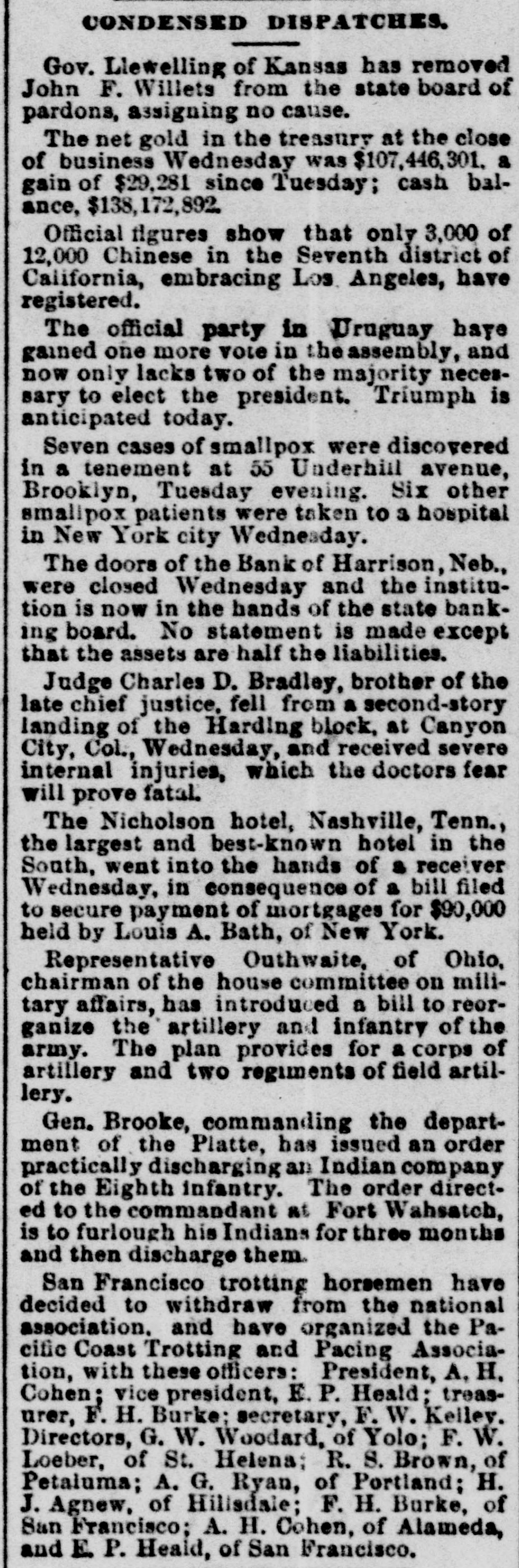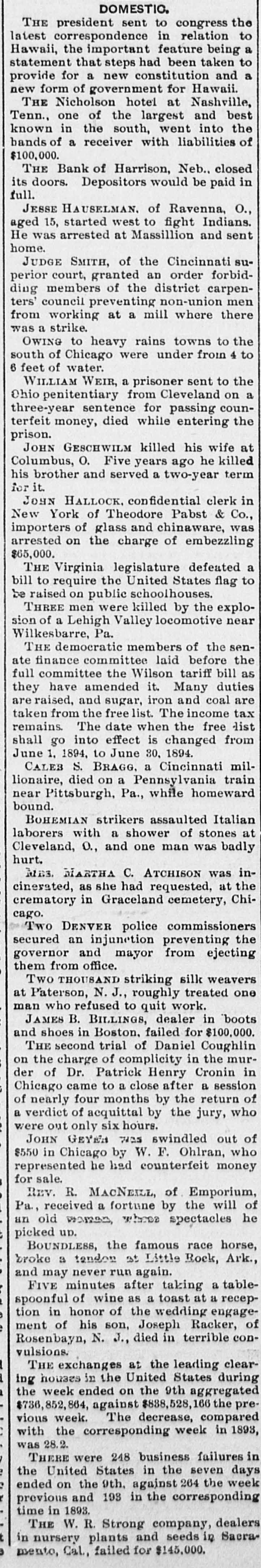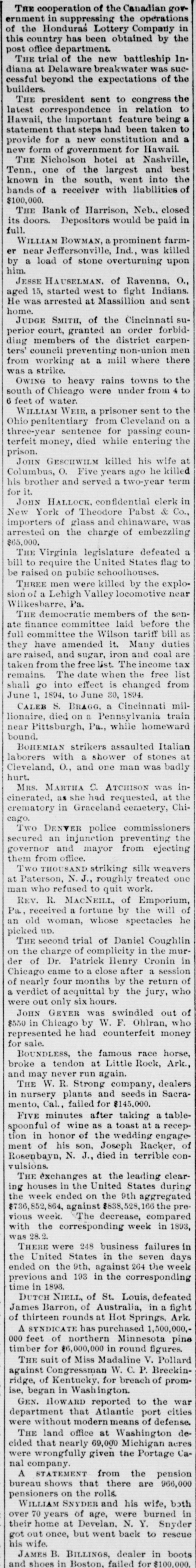 DOMESTIC. THE president sent to congress the latest correspondence in relation to Hawaii, the important feature being a statement that steps had been taken to provide for a new constitution and a new THE form Nicholson of government hotel at for Nashville, Hawaii. Tenn., one of the largest and best known in the south, went into the bands of a receiver with liabilities of $100,000. THE Bank of Harrison, Neb., closed its doors. Depositors would be paid in full. JESSE HAUSELMAN, of Ravenna, O., aged 15, started west to fight Indians. He was arrested at Massillion and sent home. JUDGE SMITH, of the Cincinnati superior court, granted an order forbidding members of the district carpenters' council preventing non-union men from working at a mill where there was a strike. OWING to heavy rains towns to the south of Chicago were under from 4 to 6 feet of water. WILLIAM WEIR, a prisoner sent to the Ohio penitentiary from Cleveland on a three-year sentence for passing counterfeit money, died while entering the prison. JOHN GESCHWILM killed his wife at Columbus, O. Five years ago he killed his brother and served a two-year term for it. JOHN HALLOCK, confidential clerk in New York of Theodore Pabst & Co., importers of glass and chinaware, was arrested on the charge of embezzling $65,000. THE Virginia legislature defeated a bill to require the United States flag to be raised on public schoolhouses. THREE men were killed by the explosion of a Lehigh Valley locomotive near Wilkesbarre, Pa. THE democratic members of the senate finance committee laid before the full committee the Wilson tariff bill as they have amended it. Many duties are raised, and sugar, iron and coal are taken from the free list. The income tax remains. The date when the free list shall go into effect is changed from June 1. 1894, to June 30, 1894. CALEB S. BRAGG. a Cincinnati millionaire, died on a Pennsylvania train near Pittsburgh, Pa., while homeward bound. BOHEMIAN strikers assaulted Italian laborers with a shower of stones at Cleveland, O., and one man was badly hurt. MRS. MARTHA C. ATCHISON was incinerated, as she had requested, at the crematory in Graceland cemetery, Chicago. Two DENVER police commissioners secured an injunction preventing the governor and mayor from ejecting them from office. Two THOUSAND striking silk weavers at Paterson, N.J., roughly treated one man who refused to quit work. JAMES B. BILLINGS, dealer in boots and shoes in Boston, failed for $100,000. THE second trial of Daniel Coughlin on the charge of complicity in the murder of Dr. Patrick Henry Cronin in Chicago came to a close after a session of nearly four months by the return of a verdict of acquittal by the jury, who were out only six hours. JOHN GEYEA was swindled out of $550 in Chicago by W. F. Ohlran, who represented he had counterfeit money for sale. REV. R. MACNEILL, of Emporium, Pa., received a fortune by the will of an old WOMEN, whose spectacles he picked un. BOUNDLESS, the famous race horse, broke a tendon 3t Little Rock, Ark., and may never run again. FIVE minutes after taking a tablespoonful of wine as a toast at a reception in honor of the wedding engagement of his son, Joseph Racker, of Rosenbayn, N. J., died in terrible convulsions. THE exchanges at the leading clearing houses in the United States during the week ended on the 9th aggregated $736,852,864, against $888,528,166 the previous week. The decrease, compared with the corresponding week in 1893, was 28.2. THERE were 248 business failures in / the seven e ended c United on the States 9th, against in the 264 the week days r previous and 193 in the corresponding time in 1893. THE W. R. Strong company, dealers t in nursery plants and seeds in Sacramento, Cal, failed for $145,000.
