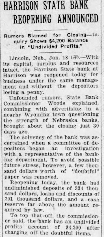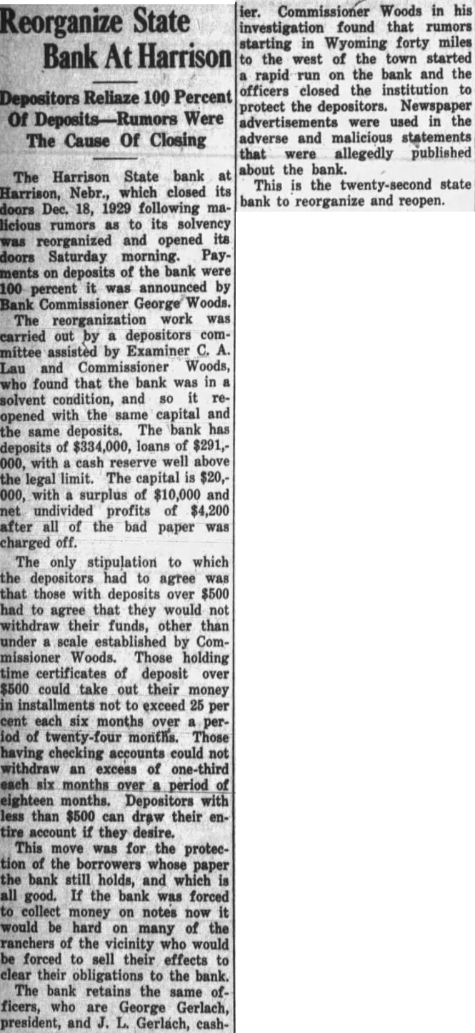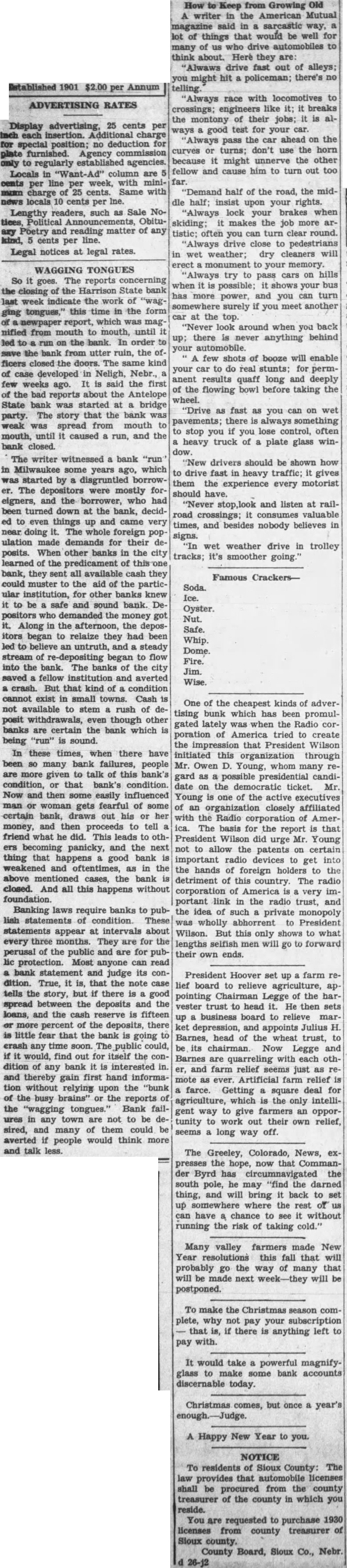 Established 1901 per Annum ADVERTISING RATES Display advertising, 25 cents per Inch each insertion. Additional charge for special position; no deduction for plate furnished. Agency commission only to regularly established agencies. Locals in "Want-Ad" column are cents per line per week, with miniman charge of 25 cents. Same with news locals 10 cents per Ine. Lengthy readers, such as Sale Notices, Political Announcements, Obituary Poetry and reading matter of any kind, 5 cents per line. Legal notices at legal rates. WAGGING TONGUES So it goes. The reports concerning the closing of the Harrison State bank last week indicate the work of ging tongues," this time in the form of a newpaper report, which was magnified from mouth to mouth, until led to run on the In order save the bank from utter ruin, the officers closed the doors. The same kind of case developed in Neligh, Nebr., few weeks It is said the first ago. of the bad reports about the Antelope State bank was started at bridge party. The story that the bank was weak was spread from mouth to mouth, until it caused run, and the bank closed. The writer witnessed bank "run" in Milwaukee some years ago, which was started by disgruntled borrower. The depositors were mostly foreigners, and the borrower, who had been turned down at the bank, decided to even things up and came very near doing it. The whole foreign population made demands for their deposits. When other banks in the city learned of the predicament of bank, they sent all available cash they could muster to the aid of the particular institution, for other banks knew it to be safe and sound bank. Depositors who demanded the money got it. Along in the afternoon, the depositors began to relaize they had been led to believe an untruth, and steady stream of re-depositing began to flow into the bank. The banks of the city saved fellow institution and averted crash. But that kind of a condition cannot exist in small towns. Cash is not available to stem rush of deposit withdrawals, even though other banks are certain the bank which is being "run" is sound. In these times, when there have been so many bank failures, people are more given to talk of this bank's condition, that bank's condition. Now and then some easily influenced man or woman gets fearful of some certain bank, draws out his or her money, and then proceeds to tell friend what he did. This leads to others becoming panicky, and the next thing that happens good bank weakened and oftentimes, as in the above mentioned cases, the bank is closed. And all this happens without foundation. Banking laws require banks to publish statements of condition. These statements appear at intervals about every three months. They are for the perusal of the public and are for public protection. Most anyone can read bank statement and judge its condition. True, it is, that the note case tells the story, but if there is a good spread between the deposits and the loans, and the cash reserve is fifteen or more percent of the deposits, there is little fear that the bank is going to erash any time soon. The public could, if it would, find out for itself the condition of any bank it is interested in. and thereby gain first hand information without relying upon the "bunk of the busy brains" or the reports of the "wagging tongues." Bank failures in any town are not to be desired, and many of them could be averted if people would think more and talk less. How from Growing Old A writer in the American Mutual magazine said in sarcastic way, lot of things that would be well for many of us who drive automobiles to think about. Here they are: "Alwaws drive fast out of alleys; might hit policeman; there's no telling. "Always race with locomotives to crossings; engineers like it; it breaks the montony of their jobs; it is always good test for your car. "Always pass the car ahead on the curves or turns; don't use the horn because it might unnerve the other fellow and cause him to turn out too far. 'Demand half of the road, the middle half; insist upon your rights. "Always lock your brakes when skiding; it makes the job more artistic; often you can turn clear round. "Always drive close to pedestrians in wet weather; dry cleaners will erect monument to your memory. "Always try to pass cars on hills when it possible; it shows your bus has more power, and you can turn surely if you meet another car at the top. "Never look around when you back up; there is never anything behind your automobile. A few shots of booze will enable your car to do real stunts; for permanent results quaff long and deeply of the flowing bowl before taking the wheel. "Drive as fast as you can on wet pavements; there is always something to stop you if you lose control, often heavy truck of plate glass window. "New drivers should be shown how to drive fast in heavy traffic; it gives them the experience every motorist should have. "Never and listen at railroad crossings; it consumes times, and besides nobody believes in signs. "In wet weather drive in trolley tracks; it's smoother going." One of the cheapest kinds of advertising bunk which has been promulgated lately was when the Radio corporation of America tried to create the impression that President Wilson initiated this organization through Mr. Owen D. Young, whom many gard as a possible presidential candidate on the democratic ticket. Mr. Young is one of the active executives of an organization closely affiliated with the Radio corporation of America. The basis for the report is that President Wilson did urge Mr. Young not to allow the patents on certain important radio devices get into the hands of foreign holders to the detriment of this country. The radio corporation of America is very im portant link in the radio trust, and the idea of such private monopoly was wholly abhorrent to President Wilson. But this only shows to what lengths selfish men will go to forward their own ends. President Hoover set up farm lief board to relieve agricultu