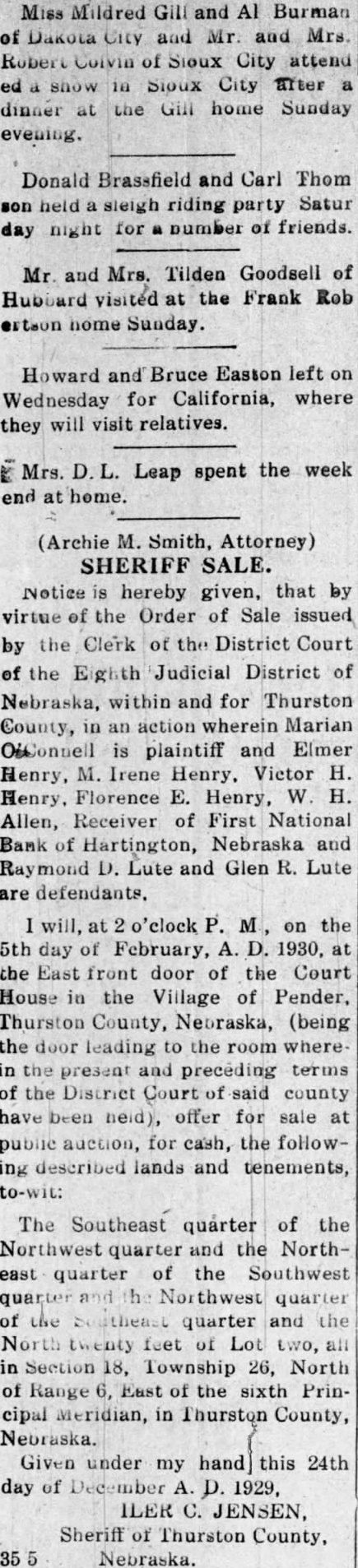 Miss Mildred Gill and Al Burman of Dakota City and Mr. and Mrs. Robert Colvin of Sioux City attend ed show 10 Sioux City after dinner at the Gill home Sunday evening. Donald Brassfield and Carl Thom son held sleigh riding party Satur day night for a number of friends. Mr. and Mrs. Tilden Goodsell of Hubbard visited at the Frank Rob ertson home Sunday. Howard and Bruce Easton left on Wednesday for California, where they will visit relatives. Mrs. Leap spent the week end at home. (Archie M. Smith, Attorney) SHERIFF SALE. Notice is hereby given, that by virtue of the Order of Sale issued by the Clerk of the District Court of the Eighth Judicial District of Nebraska, within and for Thurston County, an action wherein Marian O'Connell is plaintiff and Elmer Henry, M. Irene Henry. Victor H. Henry. Florence E. Henry, W. H. Allen, Receiver of First National Bank of Hartington, Nebraska and Raymond D. Lute and Glen R. Lute are defendants. will, at o'clock P. M, on the 5th day of February, A. D. 1930, at the East front door of the Court House in the Village of Pender, Thurston County, Neoraska, (being the door leading to the room wherein the present and preceding terms of the District Court of said county have been held), offer for sale at public auction, for cash, the following described lands and tenements, to-wit: The Southeast quarter of the Northwest quarter and the Northeast quarter of the Southwest quarter and Northwest quarter of the Southeast quarter and the Nor twenty feet of Lot two, all in Section 18, Township 26, North of Range 6, East of the sixth Principal Meridian, in Thurston County, Nebraska. Given under my hand this 24th day of December A. D. 1929, ILER C. JENSEN, Sheriff of Thurston County, Nebraska.