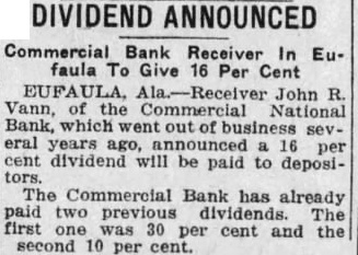 AT EUFAULA BANK CLOSED TODAY Withdrawals for of Commercial Closing National Bank the last 30 withdrawals closing of the about the brought National bank, offiCommercial financial institution of the failure to open the said here after business today. doors for meeting of the directors was It was decided night and last to open for business today. national bank examReed Dolan, the affairs of who took over the Houstono National bank at DoOctober than after its closing the Commercial in charge of National bank here today after the did not this morning. bank open Efforts will be made to reorganCommercial bank, it was the had deposits of said. The bank $124,000 on hand at the close of busofficials said. Deyesterday, the bank totalled $227,000, posits in to the July statement. according The bank is capitalized at $105,000, with $50,000 surplus. Humphrey Foy was president of the bank. Closing of the bank leaves Eubank, the Eufaula with only one Trust Co. The East faula Bank & Alabama National bank was closed here in 1929, John Vann, who liquidating the Houston National bank, being receiver.
