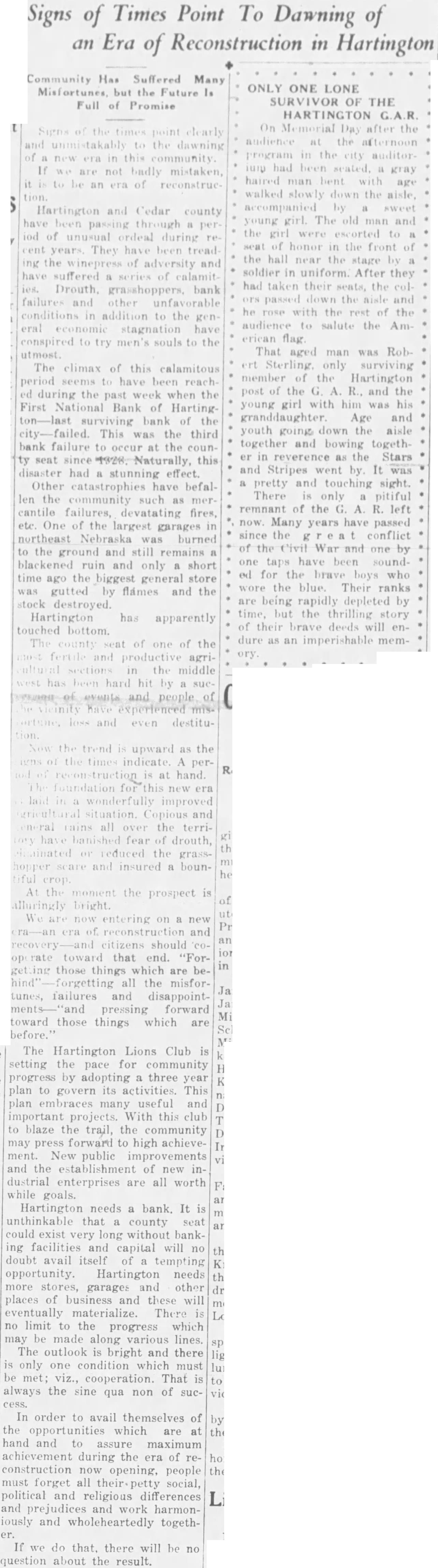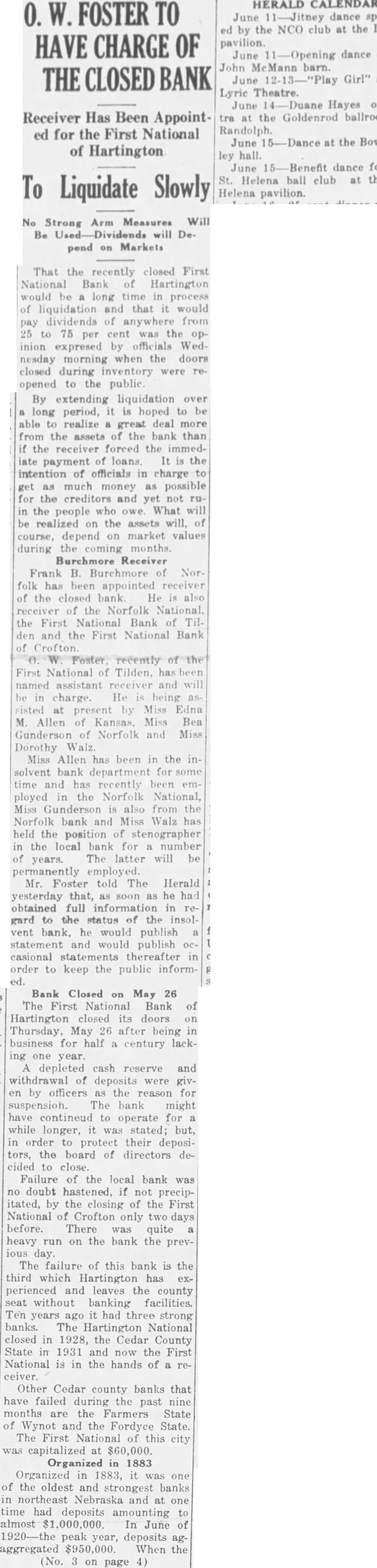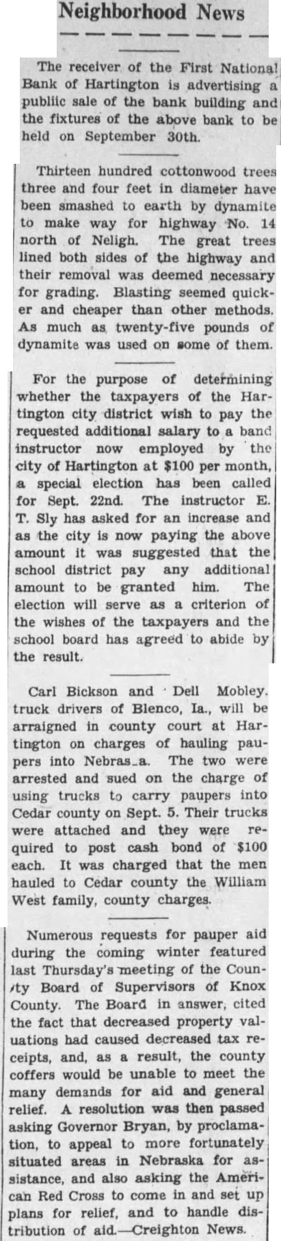 Neighborhood The receiver of the First National Bank of Hartington is advertising public sale of the bank building and the fixtures of the above bank to be held on September 30th. Thirteen hundred cottonwood trees three and four feet in diameter have been smashed to earth by dynamite to make way for highway No. 14 north of Neligh. The great trees lined both sides of the highway and their removal was deemed necessary for grading. Blasting seemed quicker and cheaper than other methods. As much as pounds of dynamite was used on some of them. For the purpose of determining whether the taxpayers of the tington city district wish to pay the requested additional salary to band instructor now employed by the city of Hartington at $100 per month, special election has been called for Sept. 22nd. The instructor Sly has asked for an increase and as the city is now paying the above amount was suggested that the school district pay any additional amount be granted him. The election will serve criterion of the wishes of the taxpayers and the school board has agreed to abide by the result. Carl Bickson and Dell Mobley. truck drivers of Blenco, Ia., will be arraigned in county court at Hartington on charges of hauling paupers into Nebras_a. The two were arrested and sued on the charge of using trucks to carry paupers into Cedar county on Sept. Their trucks were attached and they were quired to post cash bond of $100 each. It charged that the men hauled to Cedar county the William West family, county charges. Numerous requests for pauper aid during the coming winter featured last Thursday's meeting of the Coun,ty Board of Supervisors of Knox County. The Board in answer, cited the fact that decreased property valuations had caused decreased tax ceipts, and, result, the county coffers would be unable to meet the demands for aid and general many relief. A resolution was then passed asking Governor Bryan, by proclamation, to appeal to more fortunately situated areas in Nebraska for sistance, and also asking the American Red Cross to come in and set for relief, and to handle displans tribution of News.