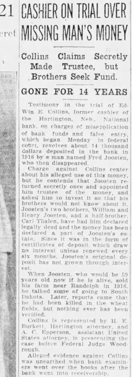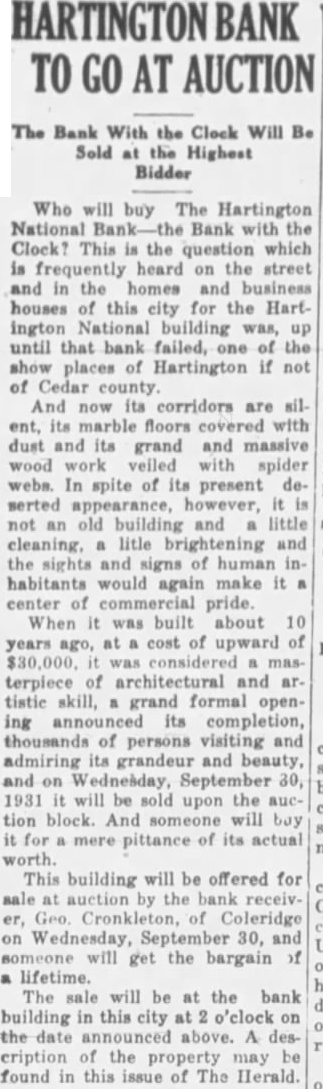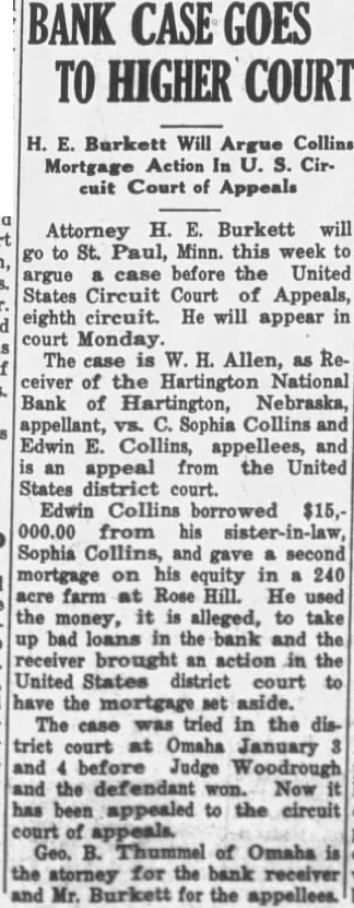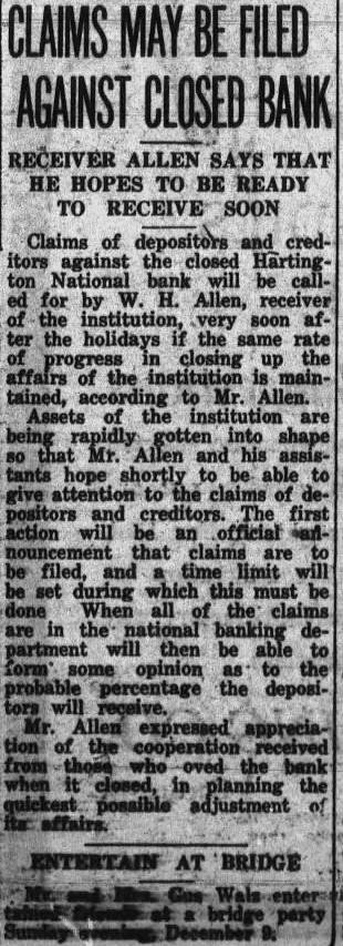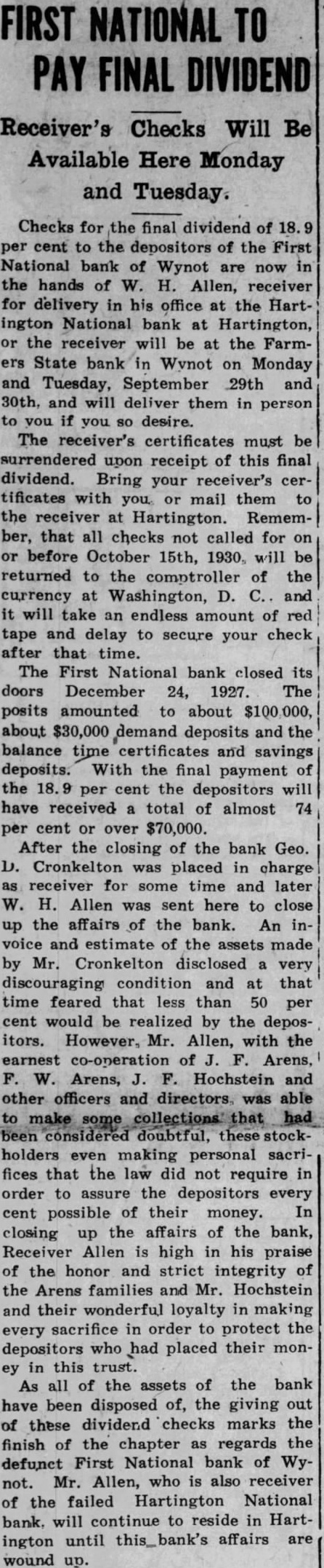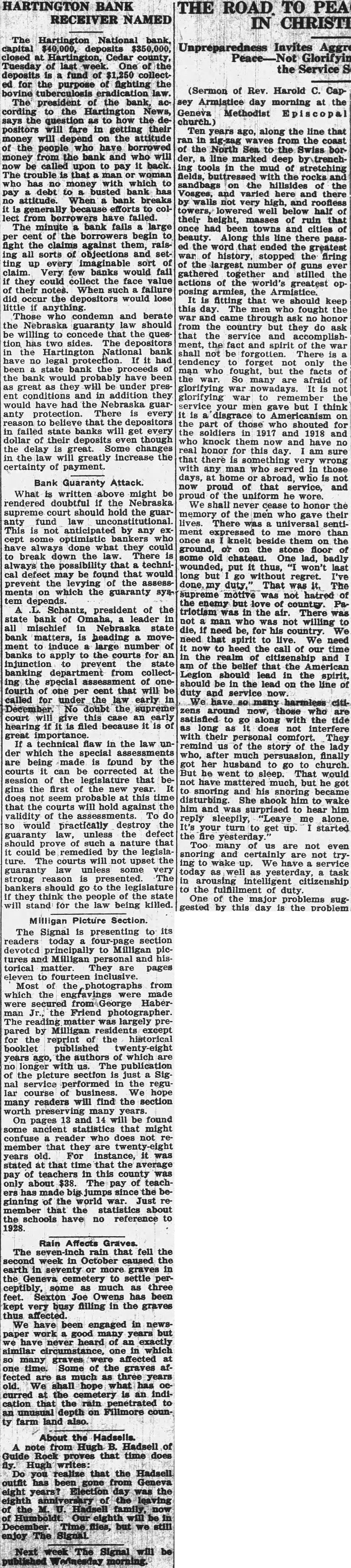 BANK RECEIVER NAMED The Hartington National bank, capital $40,000, deposits $350,000, closed Hartington, Cedar county, Tuesday last One deposits fund of collectpurpose of fighting The president the bank, the Hartington says as the positors fare getting their depend on the attitude the have the bank and who upon pay back. The that has with debt bank attitude. When bank because from borrowers failed. The bank fails large cent the borrowers begin fight claims against them, raising all sorts objections and ting imaginable sort claim. Very banks would they could collect the face value their notes. failure depositors would lose anything Those and berate the Nebraska guaranty should willing concede that the question has sides. The depositors Hartington National bank have protection. had been the the bank been great they under and addition they have guaranty There every believe that state banks get every dollar their deposits though greatly the certainty of payment. Bank Guaranty Attack. What written above might be proud the he rendered doubtful the Nebraska We to honor the supreme should hold the guar- the men who gave their fund lives. sentianticipated any than cept some knelt the what they could ground, on break There some badly that techniwounded, put thus, defect be found that would may long but without regret. levying assessThe which guaranty supreme motive Schantz, president of the triotism the There bank Omaha, leader willing mischief Nebraska state need for matters, heading need that spirit live. We need induce large now heed the time apply the the realm injunction state belief that American department Legion should lead in the spirit, special of should in the lead the line one cent that duty and service for law early have harmless December. doubt around now, those satisfied to along with the filed because long does not interfere their technical flaw in the us the story of the lady which much finally being found by to church. he to sleep. That would legislature he got the snoring snoring seem this shook courts will hold the to reply 'Leave me alone. would practically turn to get up. started guaranty unless the fire should of such that us are not could the legislasnoring not trycourts upset We guaranty unless very today task strong reason The bankers should go to legislature of they think the people state sugstand the law being killed. gested day the Milligan Picture Section. The Signal is presenting to its readers today devoted principally to Milligan pictures and personal torical matter. They pages eleven fourteen inclusive. Most from which the HaberFriend was largely preby except the reprint of the historical booklet published years ago, the authors of which the just course business hope readers find the section many pages and be found some statistics that might confuse does member that they years old. was stated that time that the average of county about $38. The pay of has since the beginning the world member statistics about the schools have no reference 1928. Rain Affects Graves. The rain that fell the earth more in the settle as feet. Joe Owens has been very filling in the graves We have engaged in newsbut heard which affected time. Some the fected much as three old. We hope has curred the that rain unusual depth Fillmore counfarm land also. About the Hadsells. from Hugh B. Hadsell Guide Rock proves that time Hugh realize that the Hadsell outfit gone eight years? Election day the Our be enjoy Signal The Signal