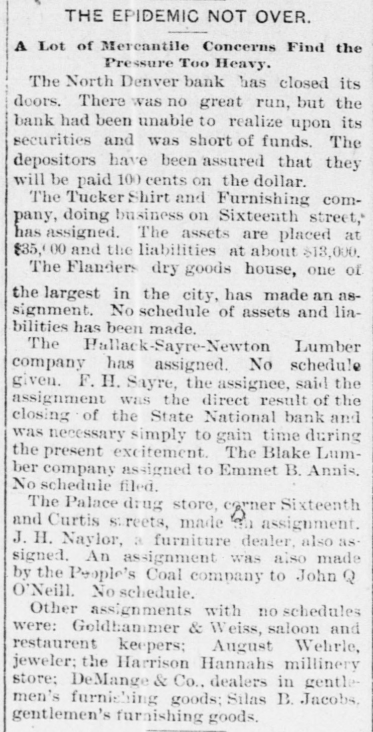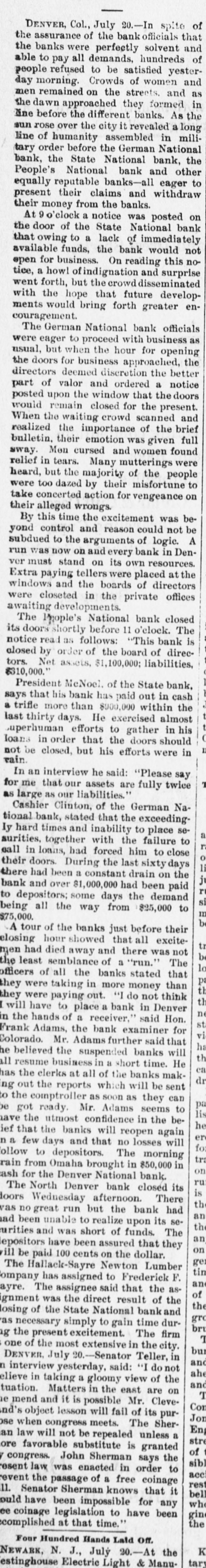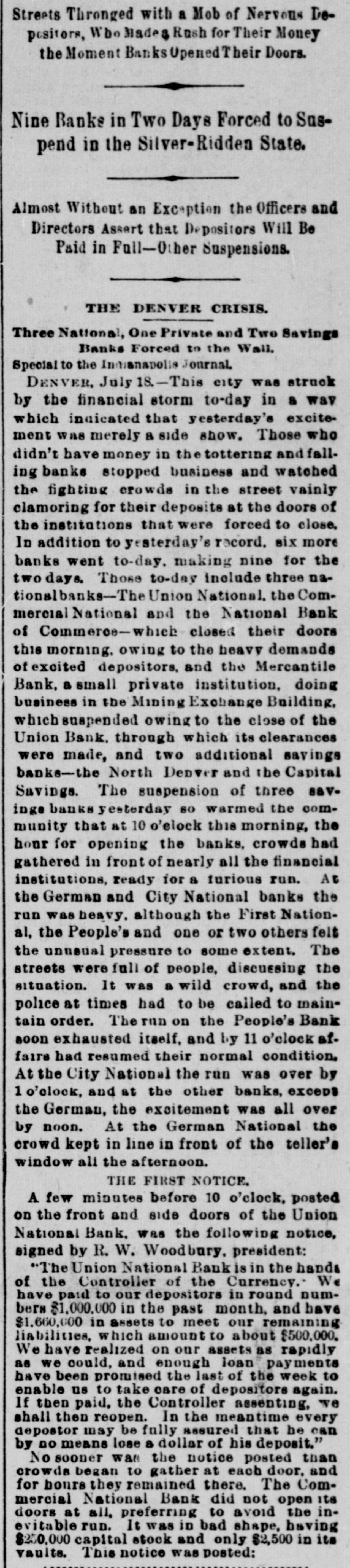 Streets Thronged with a Mob of Nervous Depositors, Who Mades Rush for Their Money the Moment Banks Opened Their Doors. Nine Banks in Two Days Forced to Saspend in the Silver-Ridden State. Almost Without an Exception the Officers and Directors Assert that Depositors Will Be Paid in Full-Other Suspensions THE DENVER CRISIS. Three National, One Private and Two Savings Banks Forced to the Wall. Special to the Indianapolis Journal DENVER, July 18.-This city was struck by the financial storm to-day in a way which indicated that yesterday's excite. ment was merely a side show. Those who didn't have money in the tottering and falling banks stopped business and watched the fighting crowds in the street vainly clamoring for their deposits at the doors of the institutions that were forced to close. In addition to yesterday's record. six more banks went to-day. making nine for the 0 days. Those to-day include three nationalbanks-The Union National. the Commercial National and the National Bank of Commeree-whieh closed their doors this morning, owing to the heavy demands of excited depositors, and the Mercantile Bank, a small private institution, doing business in the Mining Exchange Building, which suspended owing to the close of the Union Bank. through which its clearances were made, and two additional savings banks-the North Denver and the Capital Savings. The suspension of three sav. inge banks yesterday so warmed the community that at 10 o'elock this morning, the hour for opening the banks, crowds had gathered in front of nearly all the financial institutions, ready for a turious run. At the German and City National banks the run was heavy. although the First National, the People's and one or two others felt the unusual pressure to some extent. The streets were full of people, discussing the situation. It was a wild crowd, and the police at times had to be called to maintain order. The run on the People's Bank soon exhausted itself, and by 11 o'clock af. fairs had resumed their normal condition. At the City National the run was over by 1 o'clock, and at the other banks, except the German, the excitement was all over by noon. At the German National the crowd kept in line in front of the teller's window all the afternoon. THE FIRST NOTICE. A few minutes before 10 o'clock, posted on the front and side doors of the Union National Bank. was the following notice, signed by R. W. Woodbury. president: "The Union National Bank is in the hands of the Controller of the Currency. We have paid to our depositors in round numbern $1,000,000 in the past month. and have $1,660,000 in assets to meet our remaining liabilities, which amount to about $500,000. We have realized on our assets as rapidly as we could, and enough loan payments have been promised the last of the week to enable us to take care of depositors again. If then paid. the Controller assenting, we shall then reopen. In the meantime every depostor may be fully assured that he can by DO means lose a dollar of his deposit." No sooner was the notice posted than crowds began to gather at each door. and for hours they remained there. The Commercial National Bank did not open its doors at all. preferring to avoid the inevitable run. It was in bad shape, having $250,000 capital stock and only $2,500 in its vaults. This notice was posted: