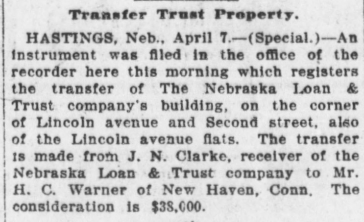 Transfer Trust Property. HASTINGS, Neb., April 7.-(Special.)-An instrument was filed in the office of the recorder here this morning which registers the transfer of The Nebraska Loan & Trust company's building, on the corner of Lincoln avenue and Second street, also of the Lincoln avenue flats. The transfer IS made from J. N. Clarke, receiver of the Nebraska Loan & Trust company to Mr. H. C. Warner of New Haven, Conn. The consideration is $38,000.
