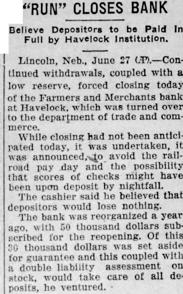"RUN" CLOSES BANK Believe Depositors to be Paid In Full by Havelock Institution. Lincoln, Neb., June 27 (P).-Continued withdrawals, coupled with a low reserve, forced closing today of the Farmers and Merchants bank at Havelock, which was turned over to the department of trade and commerce. While closing had not been anticipated today, it was undertaken, it was announced, avoid the railroad pay day and the possibility that scores of checks might have been upon deposit by nightfall. The cashier said he believed that depositors would lose nothing. The bank was reorganized a year ago, with 50 thousand dollars subscribed for the reopening. Of this 30 thousand dollars was set aside for guarantee and this coupled with a double liability assessment on stock, would take care of all deposits, he ventured.