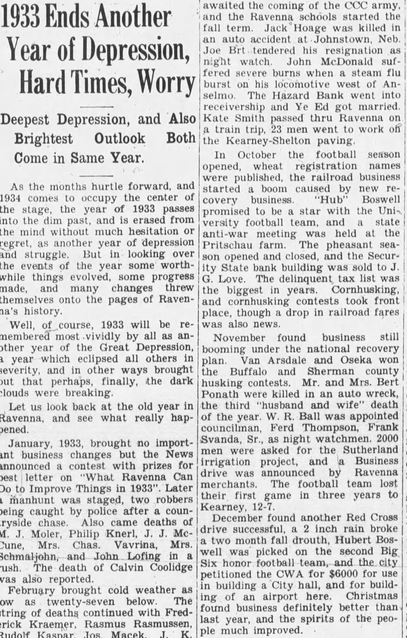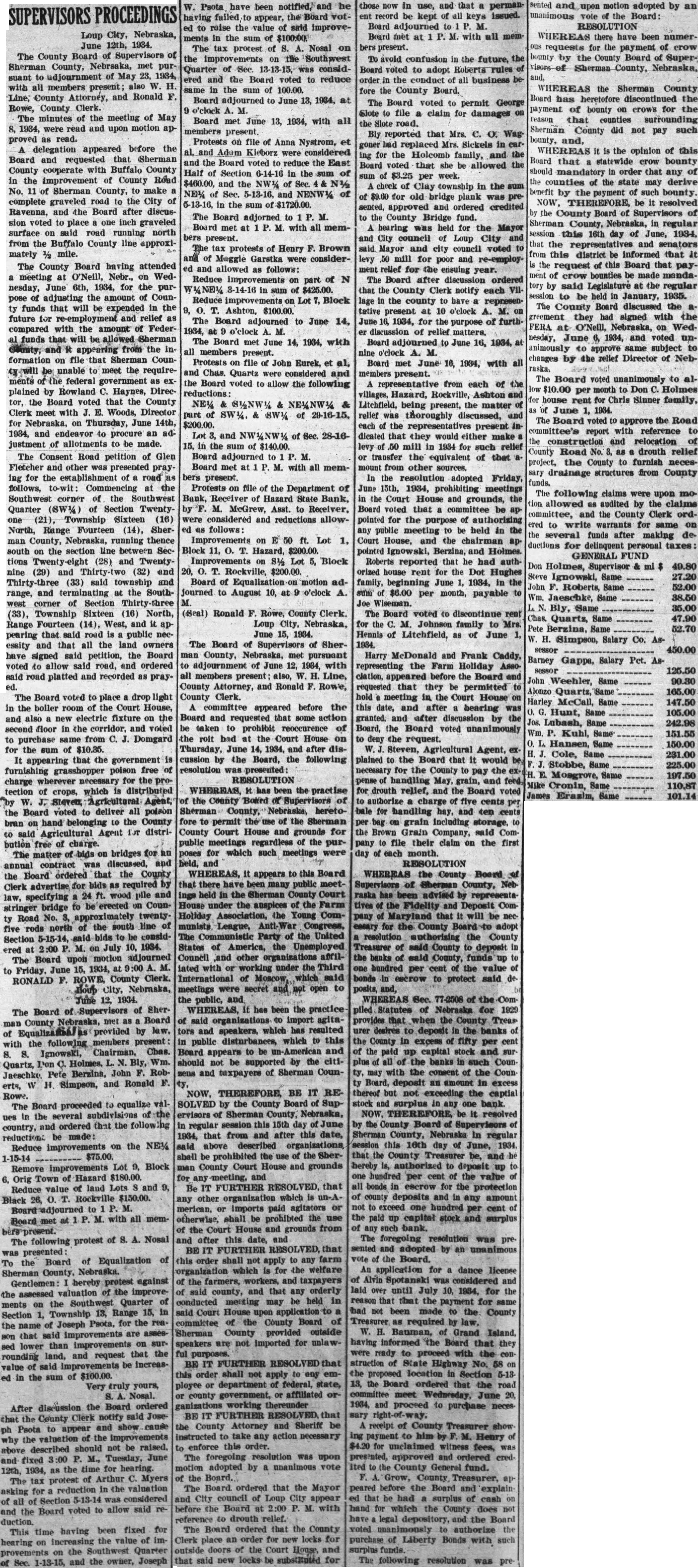 NOW, THEREFORE, BE IT RESOLVED by the County Board of Supervisors of Sherman County, Nebraska, in regular session this 15th day of June 1934, that from and after this date, said above described organizations, shell be prohibited the use of the Sherman County Court House and grounds for meeting, and Be IT FURTHER RESOLVED, that any other organization which is un-American, or imports paid agitators or otherwise, shall be prohibted the use of the Court House and grounds from and after this date, and BE IT FURTHER RESOLVED, that this order shall not apply to any farm organization which is for the welfare of the farmers, workers, and taxpayers of said county, and that any orderly conducted meeting may be held in said Court House upon application to a committee of the County Board of Sherman County provided outside speakers are not imported for unlawful purposes. BE IT FURTHER RESOLVED that this order shall not apply to any employee or department of federal, state, or county government, or affiliated organizations working thereunder BE IT FURTHER RESOLVED, that the County Attorney and Sheriff be instructed to take any action necessary to enforce this order. The foregoing resolution was upon motion adopted by a unanimous vote of the Board. The Board ordered that the Mayor and City council of Loup City appear before the Board at 2:00 P. M. with reference to drouth relief. The Board ordered that the County Clerk place an order for new locks for outside doors of the Court House, and that said new locks be substituted for thereof but not exceeding the captial stock and surplus in any one bank. NOW, THEREFORE, be it resolved by the County Board of Supervisors of Sherman County, Nebraska in regular session this 16th day of June, 1934. that the County Treasurer be, and he hereby is, authorized to deposit up to one hundred per cent of the value of all bonds in escrow for the protection of county deposits and in any amount not to exceed one hundred per cent of the paid up capital stock and surplus of any such bank. The foregoing resolution was presented and adopted by an unanimous vote of the Board. An application for a dance license of Alvin Spotanski was and laid over until July 10, 1934, for the reason that that the payment for same bad not been made to the County Treasurer as required by law. W. H. Bauman, of Grand Island. having informed the Board that they were ready to proceed with the construction of State Highway No. 58 on the proposed location in Section 5-1313, the Board ordered that the road committee meet Wednesday, June 20, 1934, and proceed to purchase necessary right-of-way. A receipt of County Treasurer show ing payment to him by M. Henry of $4.20 for unclaimed witness fees, was presented, approved and ordered credited to the County General fund. F. Grow, County Treasurer, appeared before the Board and explain ed that he had a surplus of cash on hand for which the County does not have legal depository, and the Board voted unanimonsly to authorize the purchase of Liberty Bonds with such surplus funds. The following resolution was pre- sented and motion adopted by an unanimous vote of the Board: RESOLUTION WHEREAS there have been numerous requests for the payment of crow bounty by the County Board of Supervisors of Sherman County, Nebraska, and, WHEREAS the Sherman County Board has heretofore discontinued the payment of bounty on crows for the reason that counties surrounding Sherman County did not pay such bounty, and, WHEREAS it is the opinion of this Board that a statewide crow bounty should mandatory in order that any of the counties of the state may derive benefit by the payment of such bounty. NOW, THEREFORE, be it resolved by the County Board of Supervisors of Sherman County, Nebraska, in regular session this 16th day of June, 1934, that the representatives and senators from this district be informed that it is the request of this Board that payment of crow bounties be made mandatory by said Legislature at the regular session to be held in January, 1935. The County Board discussed the agreement they had signed with the FERA at O'Neill, Nebraska, on Wednesday, June 6, 1934, and voted unanimously to approve same subject to changes by the relief Director of Nebraska. The Board voted unanimously to allow $10.00 per month to Don C. Holmes for house rent for Chris Sinner family, as of June 1, 1934. The Board voted to approve the Road committee's report with reference to the construction and relocation of County Road No. 3, as a drouth relief project, the County to furnish necessary drainage structures from County funds. The following claims were upon motion allowed as audited by the claims committee, and the County Clerk ordered to write warrants for same on the several funds after making deductions for delinquent personal taxes: GENERAL FUND Don Holmes, Supervisor & ml 49.80 Steve Ignowski, Same 27.20 John F. Roberts, Same 52.00 Wm. Jaeschke, Same 38.50 Bly, Same 35.00 Chas. Quartz, Same 47.90 Pete Berzina, Same 52.70 W. H. Simpson, Salary Co. Assessor 450.00 Barney Gappa, Salary Pet. Assessor 125.50 John Weehler, Same 90.30 Alonzo Quartz, Same 165.00 Harley McCall, Same 147.50 O. G. Hunt, Same 105.00 Jos. Lubash, Same 242.98 Wm. P. Kuhl, Same 151.55 0. L. Hansen, Same 150.00 H. Cole, Same 231.00 J. Stobbe, Same 225.00 H. E. Mosgrove, Same 197.50 Mike Cronin, Same 110.87 James Same 101.14