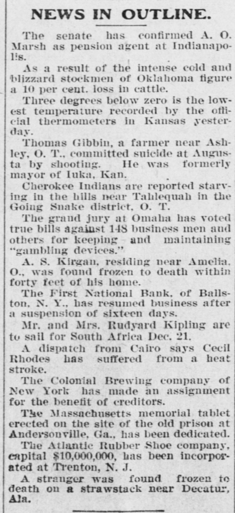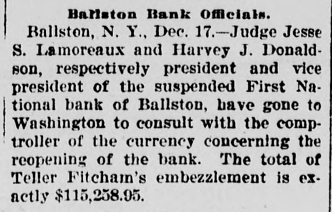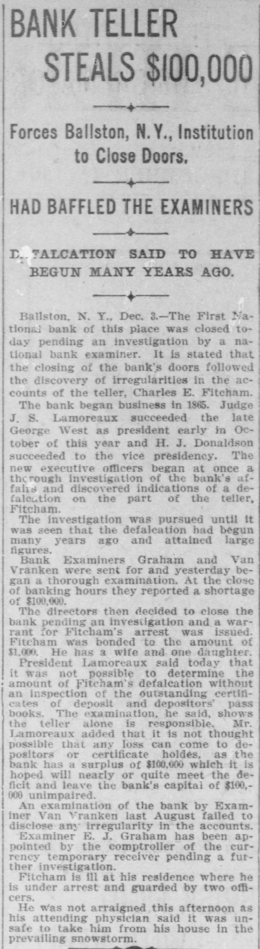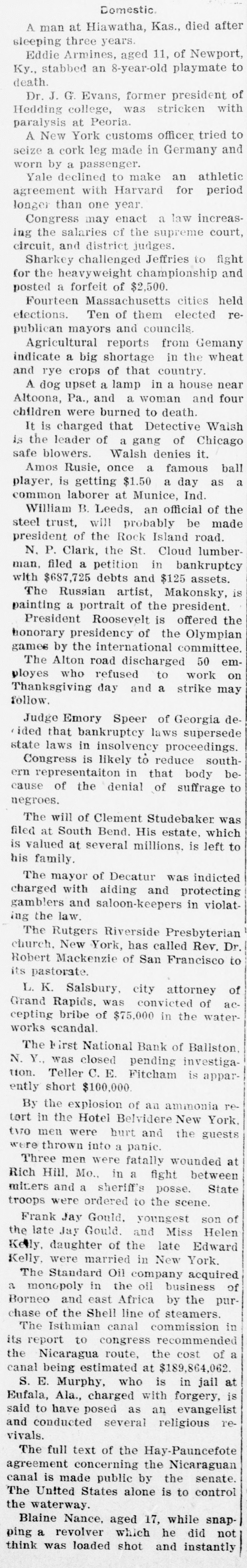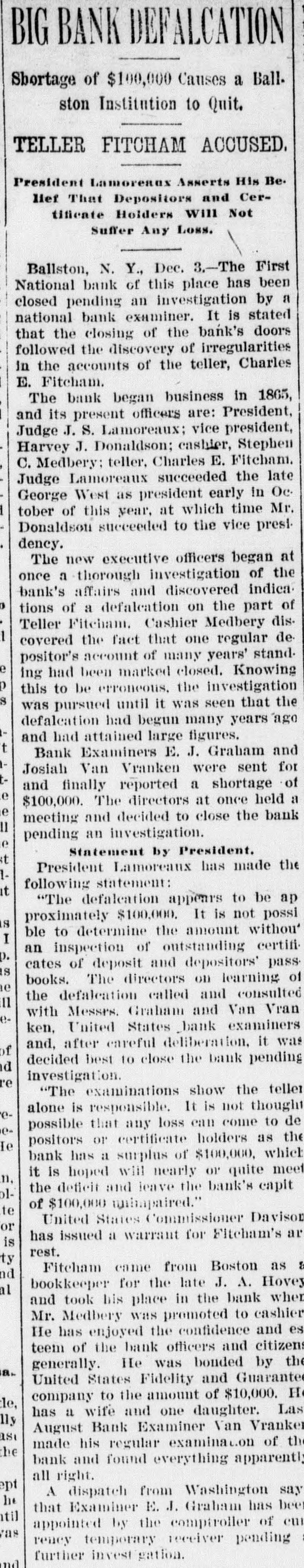 FROM WASHINGTON. [Correspendence of the Alexandria Gasette. Washington, December 3. The President's message left the White House shortly after 11:30 o'clock this morning and started on its journey to the Capitol. Secretary Pruden and Executive Clerk Young were the bearers of the message. All the messages carried to the Capitol were printed. Only two, that for the Senate and that for the House of Representatives, were signed by the President with pen and ink; the others merely bore his printed name. The copies for the House and Senate were each bound in morrocco leather and printed upon heavy bond paper with wide margins. The other copies were placed upon the desks of all the Senators and members and in the hands of the occupants of the press galleries. The First National Bank of Baliston Spa, N. Y., was closed today by a vote of the board of directors upon the discovery of a defalcation by the teller, Charles E. Fitcham, amounting to $100,000. Examiner E. J. Graham, was present in the bank at the time its doors were closed and had been appointed by the Comptroiler of the Currency temporary receiver, pending a further investigation, Representative Hay, of Virginia, chairman of the House democratic caucus, has appointed Mr. Swanson a member of the special committee to consider a number of resolutions rela. tive to the policy of the democratic members of the House, in accordance with the action of the caucus Saturday. Senator Morgan, chairman of the Isthmian canal committee of theSenate, said today that he would call a meeting of his committee on Thursday of this week to consider canal matters. He said that two bills on the subject would be introduced by him. The first of these would be to appropriate sufficient money to secure necessary concessions from Costa Rica and Nicaragua. The second would be to provide for the construction of the canal itself over the Nicaraguan route. One of the most interesting subjects of discussion among the northwestern members of Congress is the prospect of action by Congress for the purpose of preventing consummation of the four hundred million Northern Securities deal. It is declared that some steps to this end will soon be taken. Embarrassment to the republican party is believed to be the inevitable result of the decision of the Supreme Court yesterday in the Philippine cases. On the advice of Senator Aldrich, the House committee on ways and means will, as soon as possible, introduce a joint resolution extending the Dingley rates of tariff to all goods coming from the Philippines. It is reported that in order to secure action at the earliest possible date Speaker Henderson will appoint the new ways and means committee of the House before the Christmas recess. In order to conform to previous decisions of the Supreme Court, the resolution will have to provide, as was done in the Porto Rican case, that the revenues collected both in the Philippines and at United States ports on goods passing between the United States and the Philippines shall be applied to local uses in the Archipelago. They cannot be covered into the United States Treasury. The joint army and navy board who wit. nessed the recent test at Sandy Hook of the Gatheman gun and system of firing high explosives unanimously report against the gun and shows that the entire "system" has proven a failure. The test cost the government $250,000. The annual report of the attorney general was sent to Congress today. He recommends an additional appropriation for the proposed new building for the department of justice. He also recommends that & special division of the department be created to have charge of insular and other territorial affairs and that & sufficient amount be appropriated by Congress for this purpose.