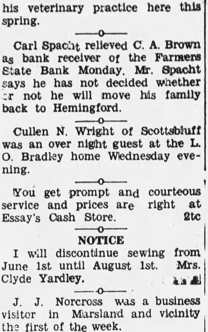 his veterinary practice here this spring. Carl Spacht relieved C. A. Brown as bank receiver of the Farmers State Bank Monday. Mr. Spacht says he has not decided whether or not he will move his family back to Hemingford. Cullen N. Wright of Scottsbluff was an over night guest at the L. O. Bradley home Wednesday evening. You get prompt and courteous service and prices are right at 2tc Essay's Cash Store. NOTICE I will discontinue sewing from June 1st until August 1st. Mrs. Clyde Yardley. J. J. Norcross was a business visitor in Marsland and vicinity the first of the week.