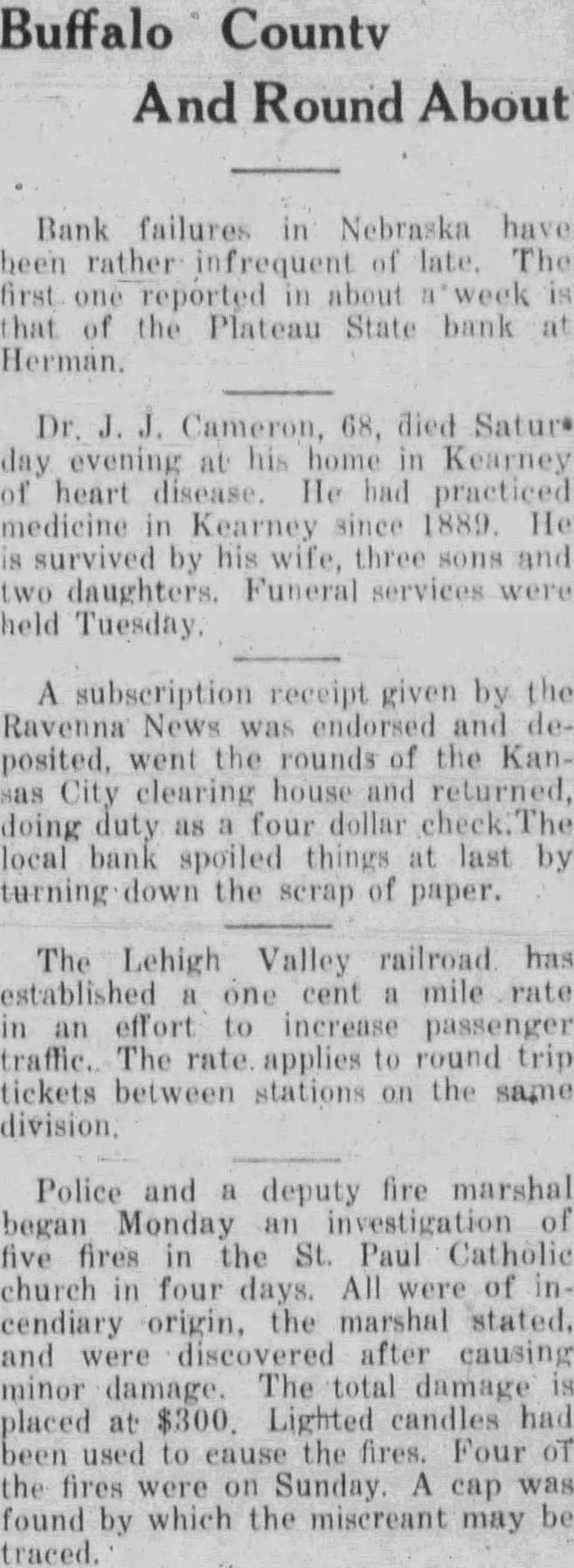 Buffalo Countv And Round About Bank failures in Nebraska have been rather of late. The first one in about week is that of the Plateau State bank at Herman. Dr. J. Cameron, 68, died Satur* day evening at his home in Kearney of heart disease. He had practiced medicine in Kearney since 1889. He is survived by his wife, three sons and two daughters. Funeral services were held Tuesday. A subscription receipt given by the Ravenna News was endorsed and deposited. went the rounds of the Kansas City clearing house and returned, doing duty as four dollar check.The local bank spoiled things at last by turning down the scrap of paper. The Lehigh Valley railroad has established one cent mile rate in an effort to increase passenger traffic. The rate applies to round trip tickets between stations on the same Police and a deputy fire marshal began Monday an investigation of five fires in the St. Paul Catholic church in four days. All were of incendiary origin, the marshal stated. and were discovered after causing minor damage. The total damage placed at $300. Lighted candles had been used to eause the fires. Four of the fires were on Sunday. A cap was found by which the miscreant may be traced.