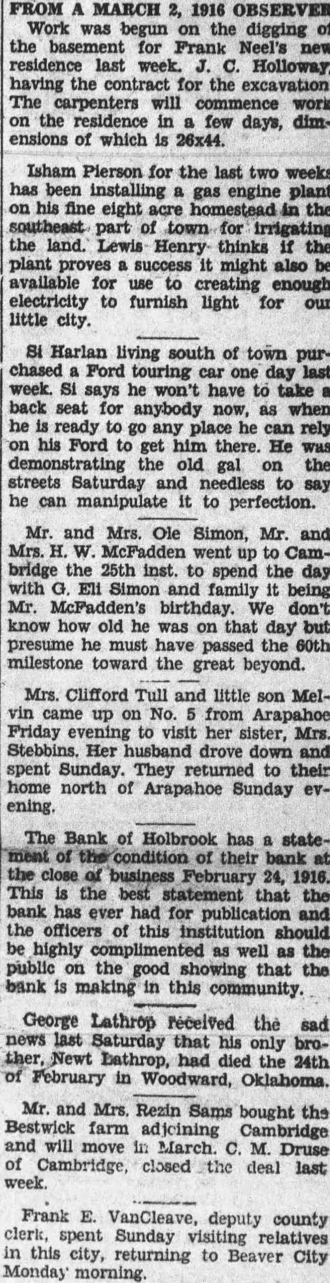 FROM MARCH OBSERVER Work was begun on the digging of the for Frank Neel's residence last week. Holloway. having contract for the excavation. The carpenters commence work on the residence in few days, dimensions of which 26x44. Isham Pierson for the last two weeks has been installing engine plant his fine eight acre homestead the southeast part of irrigating the land. Lewis Henry thinks the plant proves success might also be available for to creating enough electricity to furnish light for our little city. SI Harlan living south of town purchased Ford car day last week. he won't have to take back seat for anybody now, as when he ready go any place he rely on his Ford get him there. He was demonstrating the old gal the streets Saturday and needless to say he can manipulate to perfection. Mr. and Mrs. Ole Simon, Mr. and McFadden went Cambridge the 25th inst. to spend the day with Simon and family being Mr. McFadden's birthday. We don't know how old he was on that but presume he must have passed the 60th milestone toward the great beyond. Mrs. Clifford Tull and little son Melvin came No. from Arapahoe Friday to visit her sister, Mrs. Stebbins. Her husband drove down and spent Sunday. They returned to their home north of Arapahoe Sunday evening. The Bank of Holbrook has stateof their bank close business February 24, 1916. This the that the bank has ever had for publication and the officers of this institution should be highly as well as the public the good that the bank making in this community. George Lathrop received the sad news Saturday that his only brohad died the 24th February in Woodward, Oklahoma. Mr. and Mrs. Rezin Sams bought the Bestwick farm Cambridge and will move in Druse of Cambridge, closed deal last week. Frank VanCleave, deputy county clerk, spent Sunday visiting relatives in this city, returning to Beaver City Monday morning.