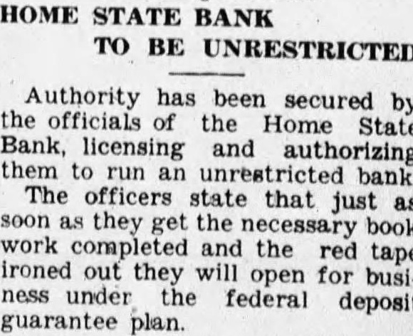 HOME STATE BANK TO BE UNRESTRICTED Authority has been secured by officials Home Bank, licensing authorizing them unrestricted bank. The officers that just they the necessary book work the red ironed out ness under federal deposit guarantee