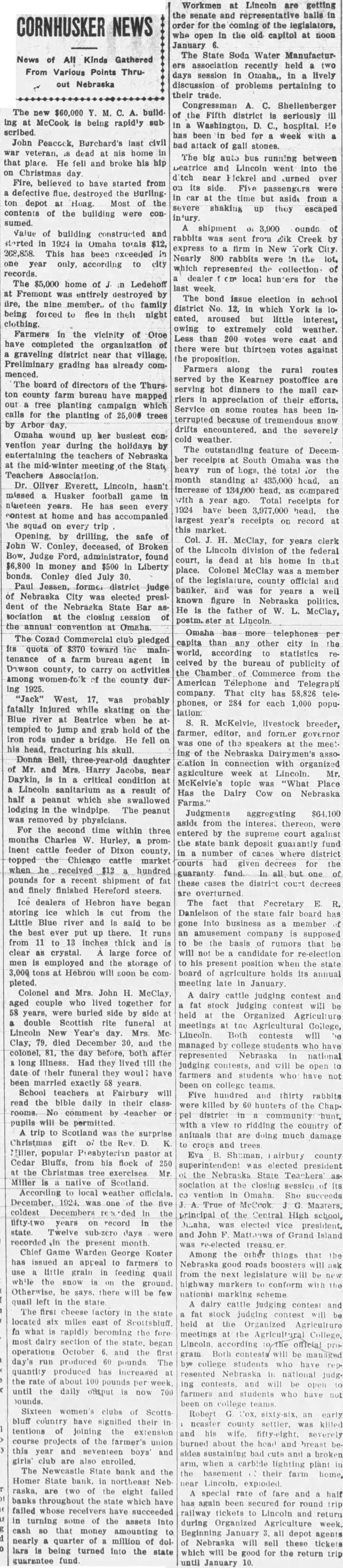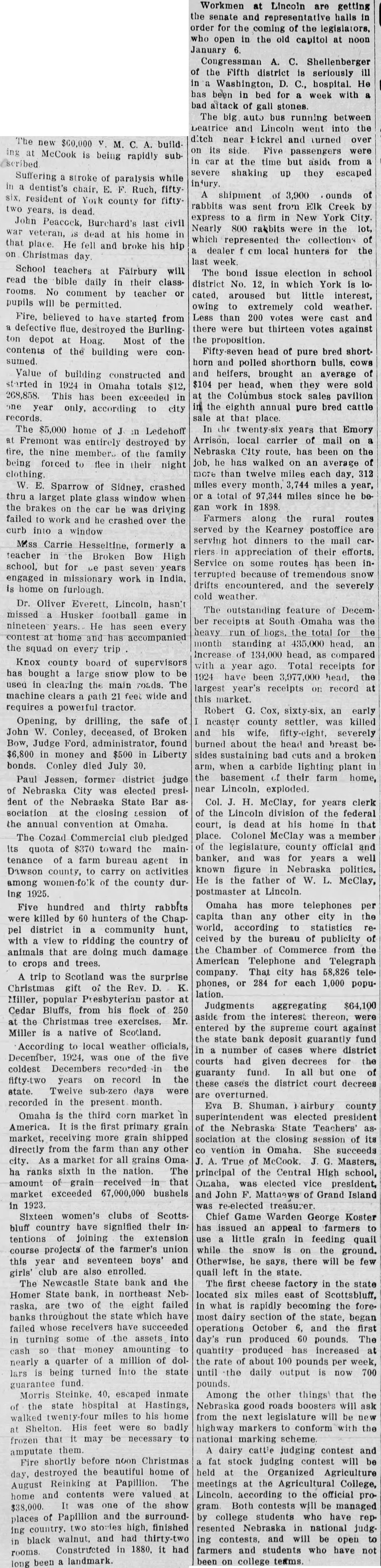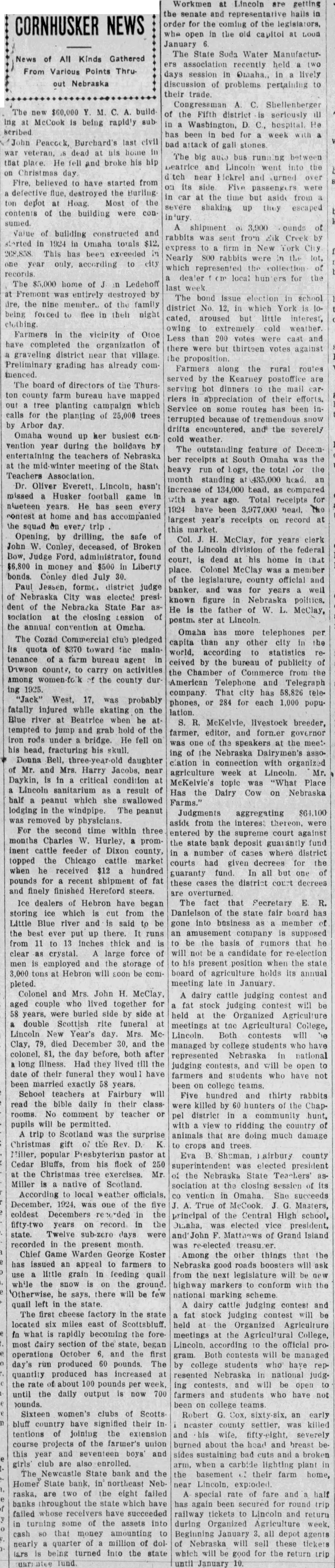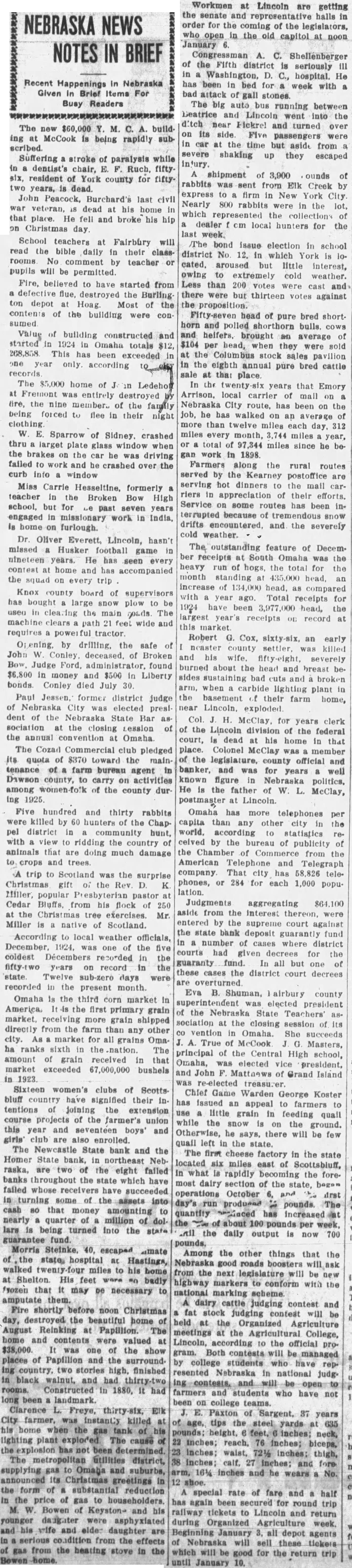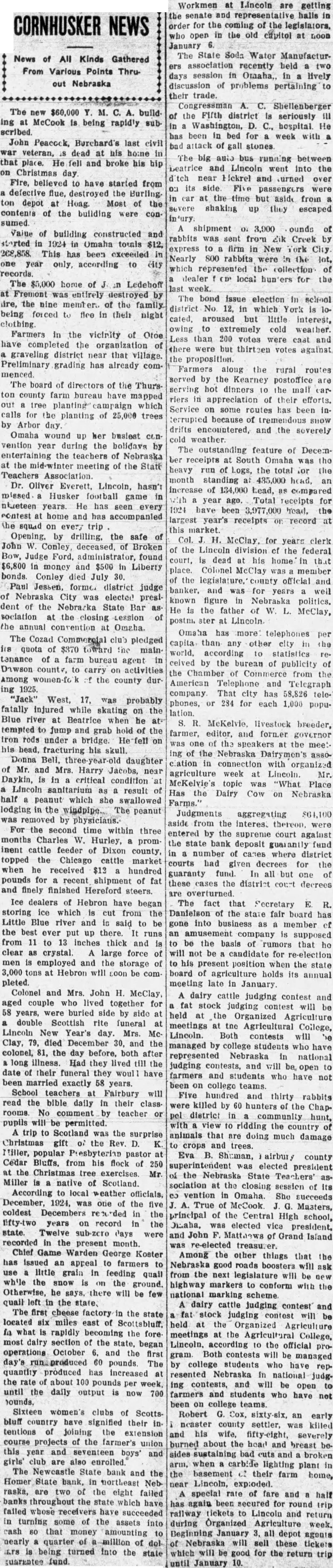 News of All Kinds Gathered From Various Points Thruout Nebraska The $60,000 ing McCook is being rapid'y subscribed. John Peaccek, Burchard's last civil veteran, dead his home that place. He fell and broke his hip on Christmas day. Fire, believed have started from defective flue, destroyed the Burlingdepot Hoag. Most of the contents of the building were con sumed. ounds Value of building constructed and rabbits sent from dik Creek storted in 1924 in Omaha totals $12, express to firm in New York City. 268,858. This has been exceeded Nearly 800 rabbits were the lot, one year only, according to city which represented collection of records. dealer local for the The $5,000 home of Ledehoff week. Fremont was entirely destroyed The bond issue election in school fire, the nine member. of the family district No. 12, in which York being forced to flee in their night cated, aroused but little interest, clothing. owing extremely cold weather. Farmers in the vicinity of Otoe Less than 200 votes were cast and have completed the organization of there were but thirteen votes against graveling district near that village. the proposition. Preliminary grading has already comFarmers along the rural routes menced. served by the Kearney postoffice The board of directors of the Thurshot dinners to the mail ton county farm bureau have mapped riers appreciation of their efforts. out tree planting campaign which Service some routes has been calls for the planting of trees terrupted because tremendous snow drifts and the severely Omaha wound up her busiest concold weather. vention year during the holidays by The outstanding feature of Decementertaining the teachers of Nebraska ber receipts at South Omaha the the meeting the State heavy run of hogs, the total the Teachers month standing 435,000 head, Oliver Everett, Lincoln, hasn't increase of head, as compared missed Husker football game with year ago. Total for receipts years. He has seen every 1924 have been head, the contest home and has accompanied largest year's receipts record the squad on every trip market. by drilling, the safe Col. McClay, for years clerk John Conley, deceased, of Broken of the Lincoln division of the federal Bow, Judge Ford, found court, dead at his home that in money and $500 Liberty place. Colonel McClay member bonds. Conley died 30. the legislature, county official and Paul Jessen, banker, and was for well years Nebraska City was elected presiknown figure Nebraska politics. dent of the Nebraska State Bar He the father of McClay, sociation at the closing Lession at the annual convention Omaha. Omaha has more telephones per The Cozad Commercial club pledged capita than any other city in the Its quota of $370 toward Inc mainworld, according to statistics tenance of farm bureau agent in celved the bureau of publicity county, to carry on activities the Chamber Commerce from the Among the county durAmerican Télephone and Telegraph ing 1925. company. That city has teleWest, 17, was probably phones, 284 for each 1,000 popufatally injured while skating the lation: Blue river Beatrice when McKelvie, livestock breeder, tempted to jump and grab hold of the farmer, editor, and forn.er iron rods under bridge. He fell on one the speakers at the meethis head, fracturing his skull. ing of the Nebraska Donna Bell, daughter clation in connection with organized Mr. and Mrs. Harry near agriculture week Lincoln. Mr. Daykin, in critical condition McKelvie's topic was "What Place Lincoln sanitarium result Has the Dairy Cow on Nebraska half peanut which she swallowed Farms." lodging the windpipe. The peanut Judgments aggregating removed physicians. aside from the interest thereon, were For the second time within three entered by the supreme court against months Charles Hurley, the state bank deposit fund inent cattle feeder of Dixon county, number of cases where district topped cattle market courts had given decrees for the received hundred guaranty fund. all but of pounds for recent shipment of fat these cases the district court decrees and finely finished Hereford steers. overturned. Ice dealers of Hebron have began The fact that Fecretary E. R. storing ice which cut from the Danielson of the state fair board has Little Blue river and said be gone into member the best ever put up there. runs an company supposed from 11 to inches thick and be the basis rumors that he clear crystal. large force will be candidate for re-election employed and the storage to his present position when the state 3,000 tons Hebron will soon be com- board agriculture holds its annual pleted. meeting late in January. Colonel and Mrs. John H. McClay, dairy judging contest and aged couple who lived together for stock judging contest will be years, were buried side side Organized Agriculture double Scottish rite funeral meetings the Agricultural College, Lincoln New Year's Mrs. McLincoln. Both contests Clay, 79, died December 30, and the managed college students have colonel, the day before. both after represented Nebraska in national long illness. Had they lived till the judging and will be open date their funeral they woul farmers and students been married exactly 58 years. been college teams. School teachers Fairbury will Five hundred and thirty rabbits read the bible daily in their classwere killed by 60 hunters the Chapcomment -teacher pel district community pupils will be permitted view ridding the country trip to Scotland the surprise animals that are doing much damage Christmas gift the and trees Miller, popular pastor Eva airbury county Cedar Bluffs, from his flock 250 elected president the Christmas tree exercises the Nebraska State Teachers' Miller native sociation the closing session its According to local weather officials. vention Omaha She 1924, one the Masters, coldest Decembers principal the Central High school, years on record in the Disaha, elected vice president, state Twelve sub-zero days and John of Grand Island recorded the present month. re-elected Chief Game War