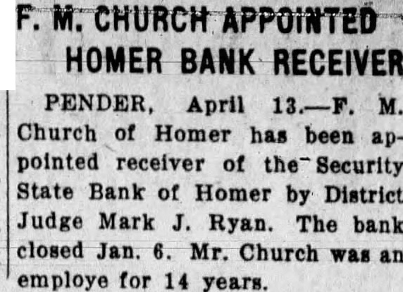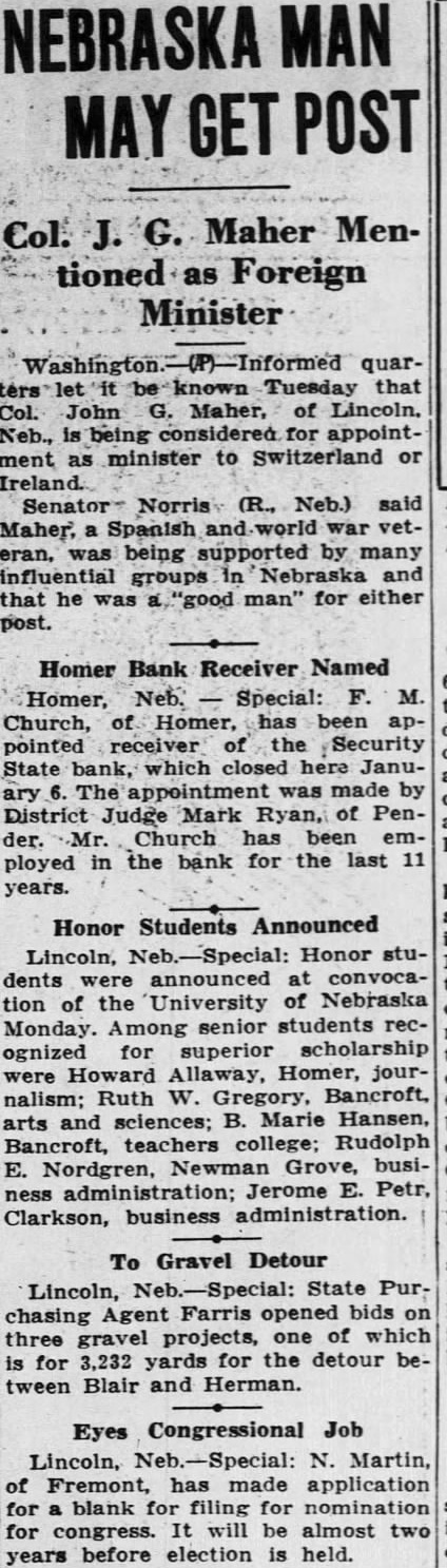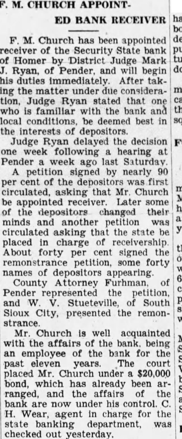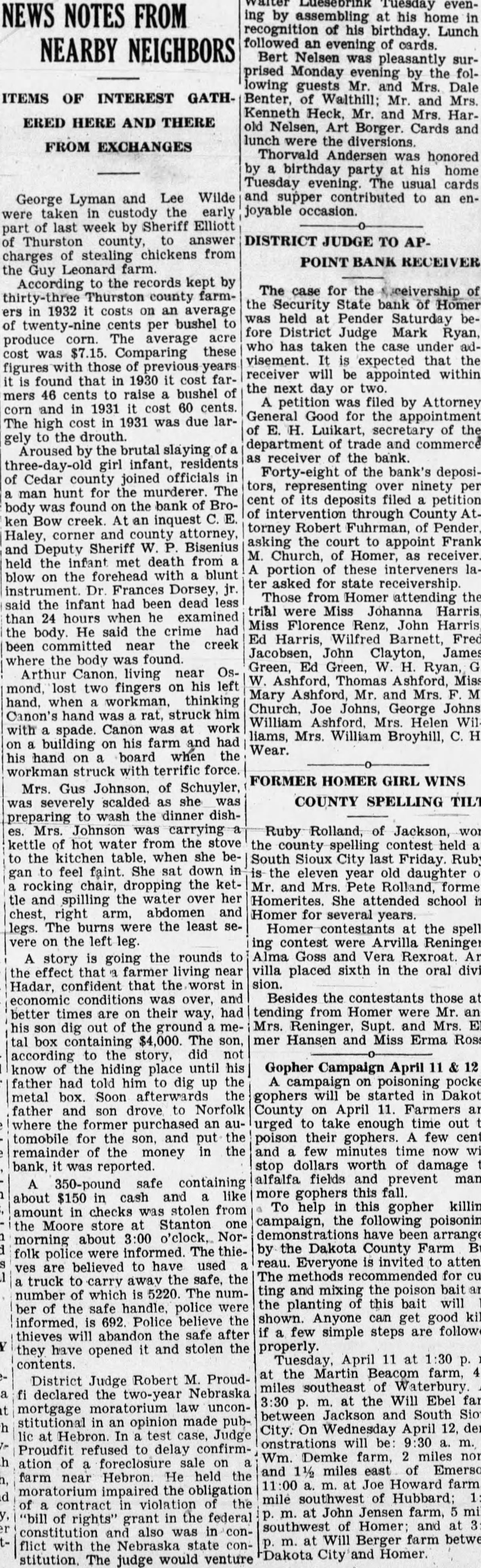 NOTES FROM NEARBY NEIGHBORS ITEMS OF INTEREST GATHERED HERE AND THERE FROM EXCHANGES George Lyman and Lee Wilde supper contributed to an enwere taken in custody early joyable occasion. of last by Sheriff Elliott county, to answer DISTRICT JUDGE TO APof stealing chickens from POINT the Guy farm. According to the records kept by The case for the of farmthe Security State bank of Homer in 1932 costs on an average held Pender Saturday becents per bushel fore District Judge Mark Ryan, produce The average who has taken the case under adwas Comparing these visement. expected that figures those of receiver will be appointed within found that in 1930 cost farthe next day or two. 46 cents to raise bushel of petition was filed by Attorney and in 1931 60 cents. Good for the appointment The high cost in 1931 was due larH. Luikart, of to the drouth. department trade and commerce Aroused the brutal slaying receiver the bank. infant, residents of the bank's deposiCedar joined officials county ninety per hunt for the The man of its deposits filed body was found the bank through County ken Bow creek. inquest torney Robert Fuhrman, of Pender, Haley, corner and county attorney, asking the court to Frank Sheriff W. Bisenius and Deputy Church, of Homer, receiver. the infant met death from portion of these the forehead with blunt blow asked for state receivership. instrument. Dr. Frances Dorsey, Those from Homer attending the said the infant had been dead trial were Miss Johanna Harris, than hours when examined Renz, John Harris, the He said the crime had Ed Harris, Wilfred Barnett, Fred been committed near the creek Jacobsen, John James where the body found Green, Ed Green, Ryan, Arthur Canon, living near Ashford, Thomas Ashford, mond, lost two fingers on his Mary Ashford, Mr. and Mrs. hand. when thinking Church, Joe Johns, George Johns, Canon's hand struck William Helen Canon was at work spade. liams, Mrs. William Broyhill, his farm and had building Wear. hand board when workman struck with force. FORMER HOMER GIRL Mrs. Gus of Schuyler, scalded COUNTY SPELLING TILT severely wash the dinner dishpreparing Johnson carrying Ruby Rolland, of Jackson, won hot water from the the county spelling contest held at the kitchen table, when she South Sioux last City Friday Ruby feel faint. She sat down the eleven year old daughter rocking dropping the Mrs. former and Rolland, tle and spilling the water her Homerites. She attended school in chest, right abdomen Homer several years. The burns were the least Homer contestants the spellon the left leg. contest Reninger, the rounds Goss and Vera story going the effect farmer living near placed sixth in the oral Hadar, confident the worst sion. economic conditions was over, Besides the contestants those better times their way, had tending Homer Mr. of the ground Reninger, Supt. and Mrs. son dig box son, Hansen and Miss Erma Ross. to the did know the hiding place until his Gopher Campaign April had him dig up the pocket metal Soon the gophers be started Dakota father drove to County April the an urged take enough time out tomobile for the and put poison their gophers. few cents the the and now will money bank, was reported. stop dollars worth of damage alfalfa fields prevent many 350-pound containing gophers this fall. about $150 cash and this gopher killing amount in checks was stolen from campaign, the poisoning the Moore store Stanton one 3:00 o'clock, Normorning about the Dakota County Farm The thiepolice were Everyone invited attend. believed to have used The recommended for cuttruck awav the safe, the carry and mixing the poison bait and 5220. The num- ting number which the planting this bait the safe police were believe the shown. Anyone can get good 692. Police few simple steps are followed thieves will abandon the safe after and stolen the properly. they have opened Tuesday, April 11 at contents. the Martin Beacom farm, District Judge Robert M. Proudmiles southeast Waterbury. declared the Nebraska the Will Ebel law between Jackson South Sioux opinion made pubCity. On Wednesday April demtest Judge onstrations refused to delay Wm. Demke farm, miles ation and miles east of Emerson: farm near Hebron. He held the Joe Howard farm, impaired the obligation mile southwest of contract the John Jensen farm, rights" grant in the federal southwest and and at Will Berger farm between flict state Dakota City Homer. The judge would venture