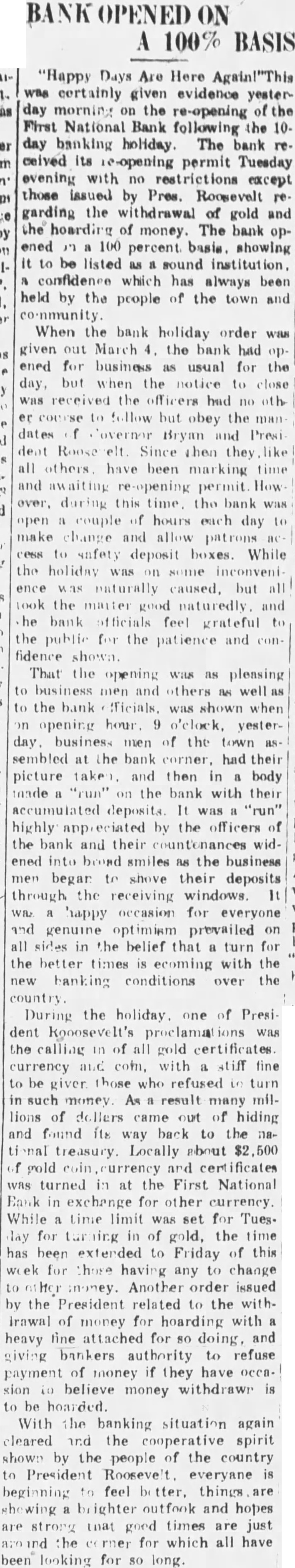 100% BASIS "Happy Days Are Here was certainly given evidence yesterday morning the re-opening of the First National Bank following the 10day banking holiday. The bank its re-opening permit Tuesday evening with no restrictions except those issued by Pres. Roosevelt garding the withdrawal of gold and the hoarding of money. The bank ened 100 percent basis. showing to be listed sound institution, confidence which has always been held by the people of the town and co-nmunity. When the bank holiday order given March the bank had ened for business usual for the day, but when the notice received the had but obey the man dates Bryan and President Roose Since then all others have been and awaiting permit How over, during this time the bank open couple hours each day make change and allow patrons cess to sufety deposit boxes. While the holiday inconvenience naturally caused. but the matter good naturedly and he bank officials feel grateful the public for the patience and fidence That the opening was as pleasing to business men and others well the ficials. was shown when opening hour o'clock, yesterday business men of the town sembled at the bank corner, had picture taken, and then in body made the bank with their accumulated deposits. It "run" highly by the officers of the bank and their countonances widened broad smiles as the business men began shove their deposits through the receiving windows. happy occasion for everyone and genuine optimism prevailed on all sides in the belief that turn for the better times ecoming with the banking conditions over the During the holiday. one of Presi dent was the calling in of all gold currency and com, with stiff fine to be giver those who refused turn in such money As result many millions of dollers came out of hiding and found its way back to the natreasury. Locally about $2,500 gold coin currency and certificates was turned at the First National Bank in exchange for other currency While time limit was set for Tues. in of gold, the time has been extended to Friday of this for those having any to change Another order issued by the President related to the withof money for hoarding with heavy fine attached for doing, and giving bankers authority to refuse payment of money if they have occasion believe money to be With the banking situation again cleared and the cooperative spirit shown by the people of the country to President everyane beginning feel brighter outfook and hopes strong that good times are just the for which all have been looking for so long.