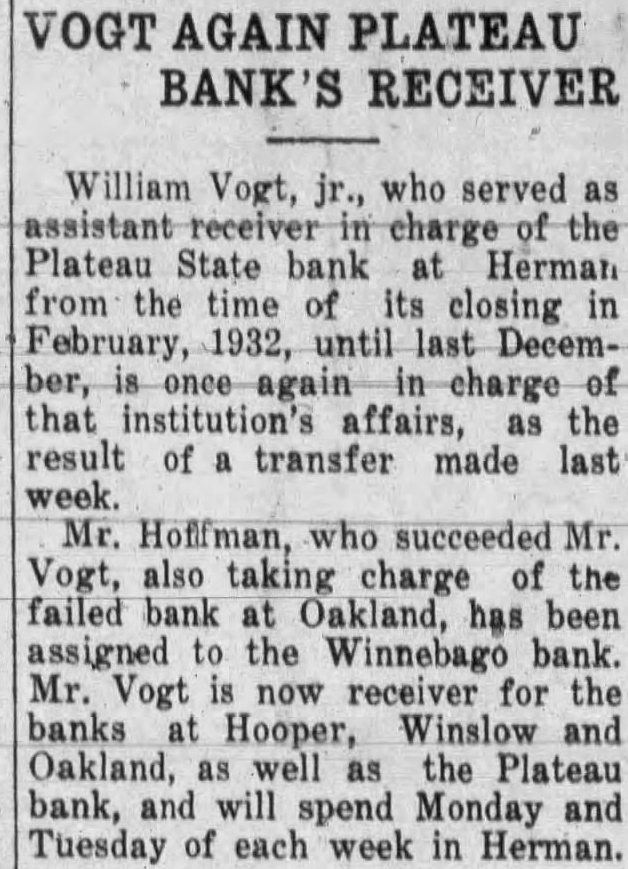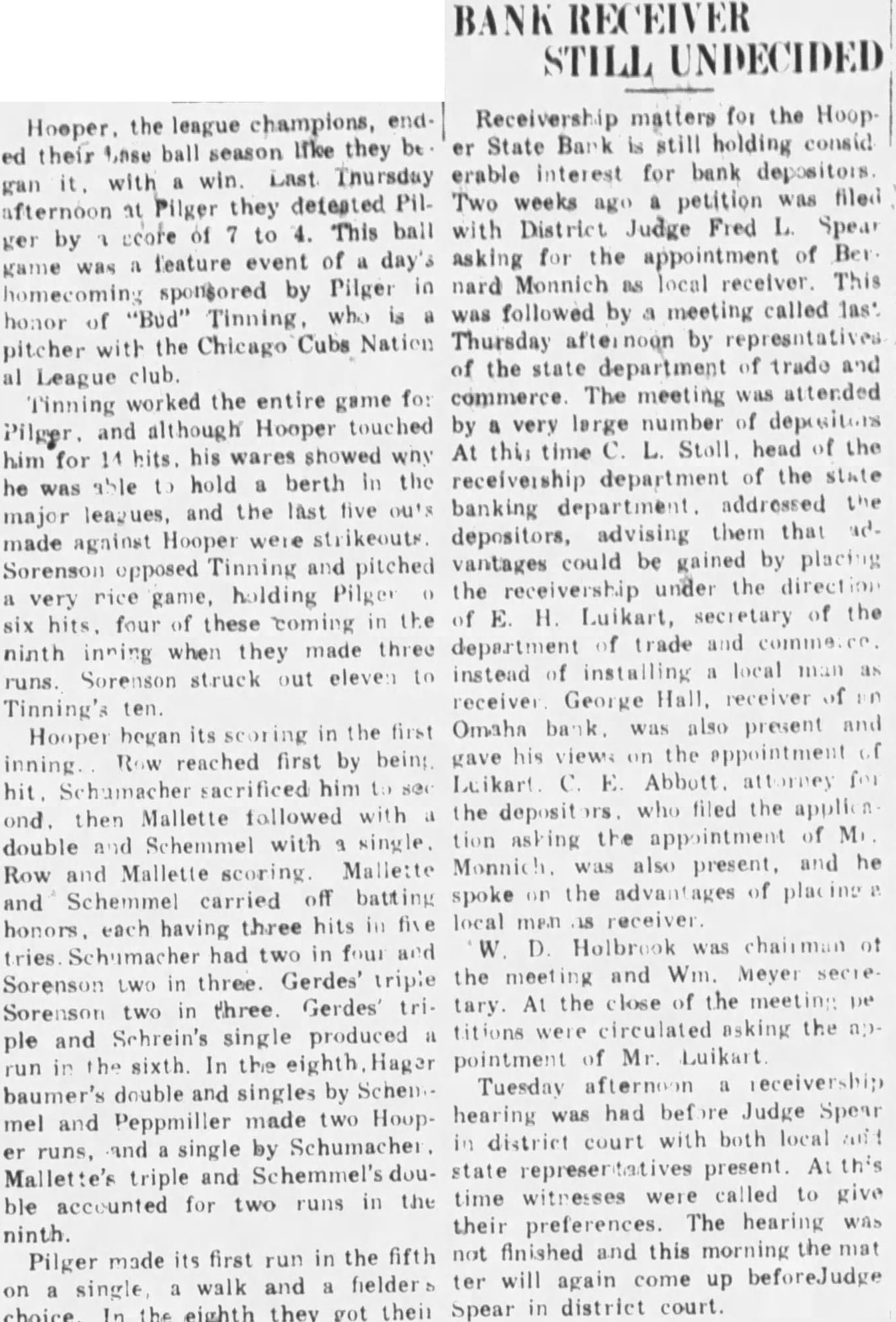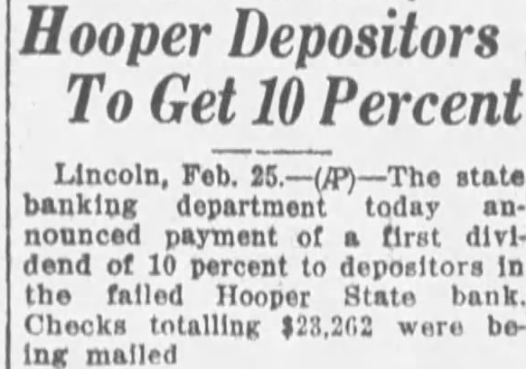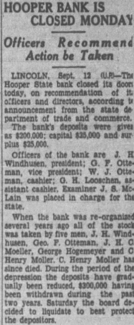 HOOPER BANK IS CLOSED MONDAY Officers Recommend Action be Taken LINCOLN. Sept. 12 (U.R)-Tht Hooper State bank closed its doon today, on of officers and directors, from the state partment of trade and The bank's deposits were gives as $200,000; capital $25,000 and sur plus $25,000. Officers of the bank are Windhusen, president; man, vice president: Ottesistant cashier, Examiner J. Mc. Lain was placed in charge for the When the bank was re-organized years ago all the was taken by five men, H. Windhusen, Geo. F. Otteman, J. H. Moeller, George Hogemeyer and Henry Moller. Henry Moller has since died. During the period of the depression the have gradually been reduced, $300,000 having been the past two years. the board decided liquidate to best protect the depositors.
