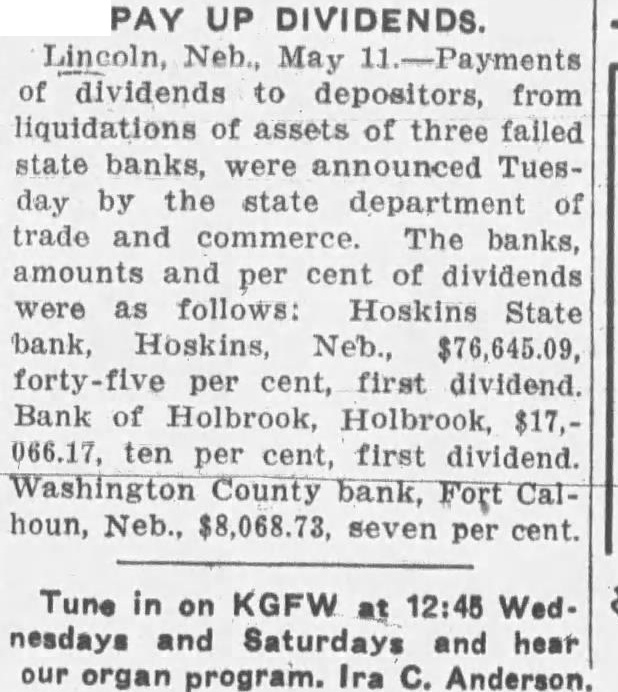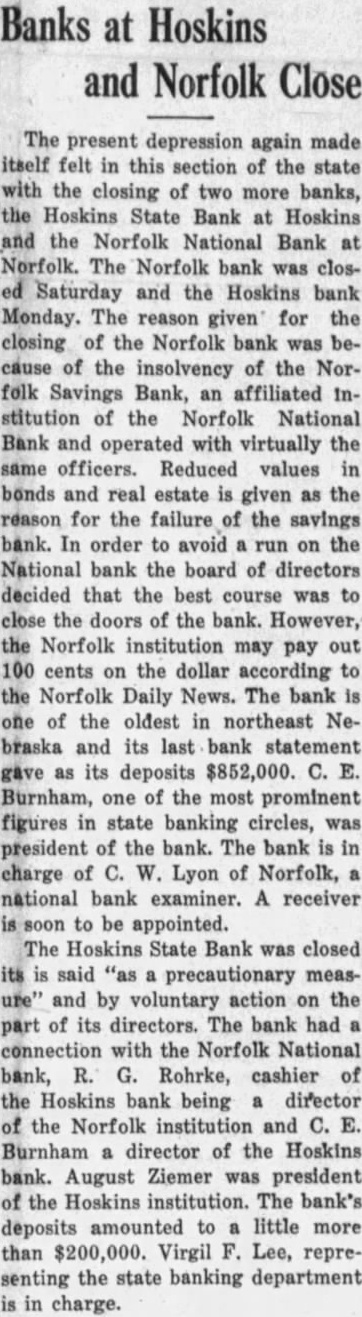 Banks at Hoskins and Norfolk The depression made present again itself felt in this section of the state with the closing of two more banks, the Hoskins State Bank at Hoskins and the Norfolk National Bank Norfolk. The Norfolk bank was closSaturday and the Hoskins bank Monday. The reason given for the closing of the Norfolk bank was because of the insolvency of the Norfolk Savings Bank, an affiliated stitution of the Norfolk National Bank and operated with virtually the same officers. Reduced values in bonds and real estate is given as the reason for the failure of the savings bank. In order to avoid on the National bank the board of directors decided that the best course was to close the doors of the bank. However, the Norfolk institution may pay out 100 cents on the dollar according to the Norfolk Daily News. The bank one of the oldest in northeast braska and its last bank statement gave its deposits $852,000. Burnham, one of the most prominent figures in state banking circles, president of the bank. The bank in charge of Lyon of Norfolk, national bank examiner. A receiver to be appointed. The Hoskins State Bank was closed said "as precautionary measand by voluntary action on the part of its directors. The bank had connection with the Norfolk National bank, R. G. Rohrke, cashier of the Hoskins bank being director of the Norfolk institution and Burnham director of the Hoskins bank. August Ziemer was president of the Hoskins institution. The bank's deposits amounted to little more than Virgil Lee, representing the state banking department in charge.