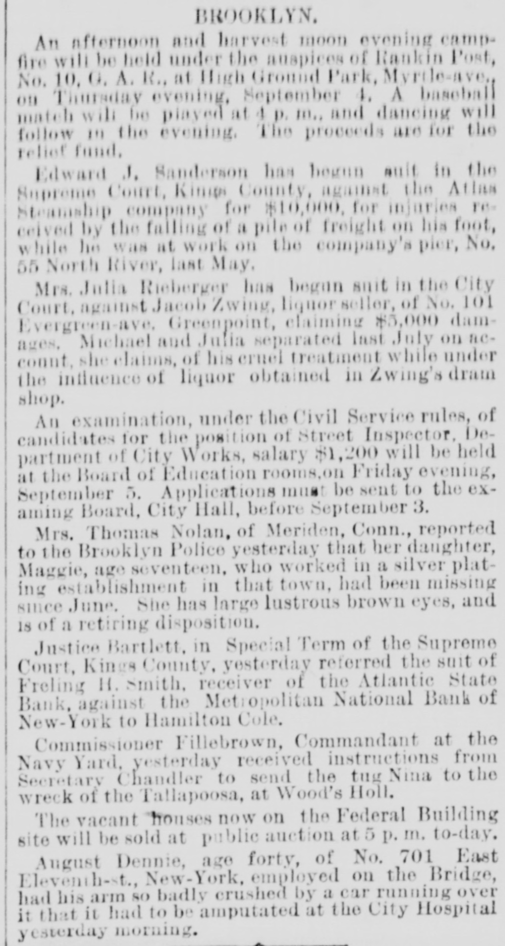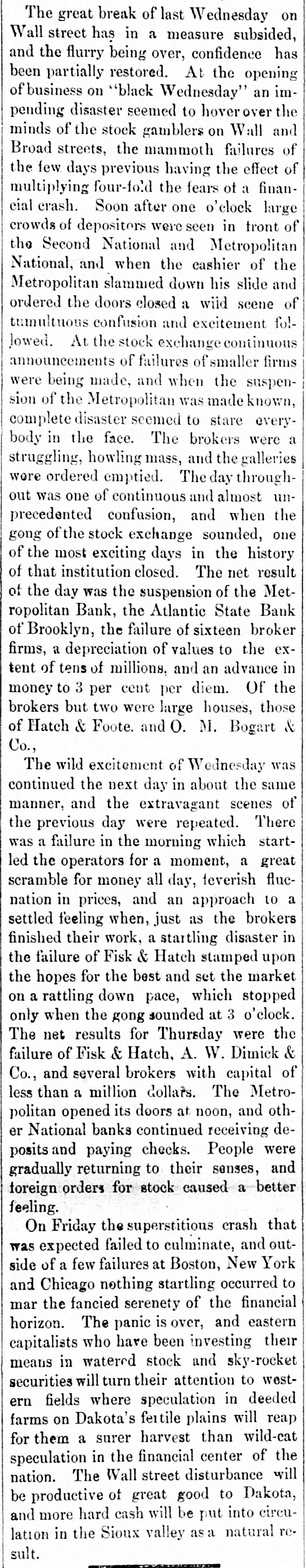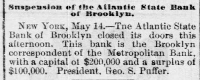 iams, Hatch & Foote, and Donnell, Lawson & Simpson. The failure of Hatch & Foote was precipitated by the Phoenix Bank refusing to certifv checks. The Metropolitan Bank has suspended, and the doors are closed. George I. Sency is President. Secretary of the Treasury Folger is in town, and has telegraphed to Washington ordering the immediate payment of the 127th call for bonds. If necessary, he will order another call for $11,000,000. Three lines of depositors are formed and demand their money at the Second National Bank. It is feared the bank will stop. The Atlantic State Bank, of Brooklyn, closed its doors this afternoon. This bank is the Brooklvn correspondent of the Metropolitan Bank. Capital, $6,200,000 surplus, $6,100,000; President, George Peiffer. INTENSE AND GENERAL EXCITEMENT. NEW YORK, May 14th.-Not in years has there been such intense and general excitement on Wall street as there was this morning when it became known that Hatch & Foote, and O. M. Bogart & Co., two of the oldest and stanchest firms on the street, had suspended. The excitement reached fever heat, and crowds rushed from all directions to Wall street. The scene there was indiscribable. Thousands of brokers and business men, with pallid faces, blocked up the streets and roadways. In front of Hatch & Foote's offices such a throng gathered that the police were called to clear the sidewalks. The galleries in the Stock Exchange were packed with a mass of humanity five rows deep, while on the floor below brokers clustered around the President's desk and listened to the announcement of failures. which were greeted with wild shouts, and taken up by the crowd in the streets. At the office of I. & S. Wormser your reporter was informed. that they were in no way affected by the general panic. They said the failure of Hatch & Foote would have a terrible effect. and the whole trouble was undoubtedly due to the Marine Bank failure and the complications arising from Grant & Ward's assignment. There is no telling when the bottom will be reached. Your reporter next called on Hatch & Foote, a member of which firm said: We suspended because our customers failed to respond to our call for aid. I cannot say whether we will resume or not, and can give you no idea of the extent of the failure. The general depression in the stock market has caused us, like others, to go under." As your reporter reached O. M. Bogart's office, corner of Pine street and Broadway, the iron doors of the Metropolitan Bank, which is overhead, were just being drawn. An excited crowd came tearing round from Wall street, and it was soon known that the bank had been obliged to suspend. Admission was denied newspaper men by the doorkeeper, who said no statement could as yet be made. The senior member of the firm of O. M. Bogart said to your reporter Yes, we have failed, and I fear the failure is a bad one. The prospects are very slim of ever being able to resume. We lost an immense amount of money the past few days, and this, with a lot of bad debts and the refusal of customers to come to our aid, caused our suspension. THE METROPOLITAN BANK AND THE CLEARING-HOUSE. The Metropolitan Bank was $500,000 debtor to the Clearing-house this morning. George Q. Seney, President, was partner in Nelson, Robinson Co. Seney's sons were also partners. In last week's statement to the Clearing-house the Metropolitan Bank figured as follows: Loans, $10,977,000 specie, $1,779,000; legal tender, $491,000 deposits, $8,425,000. FOLGER'S HOPEFUL VIEW. 1 P. M.-Secretary Folger has just said The breek is due to reckless speculation by a few persons. The situation is not inherently weak. I do not anticipate an extensive panic. I shall do all in my power to restore confidence." O. M. BOGART & CO. NEW YORK, May 14th.-The firm of O. M. Bogart & Co., has long been known as one of the most important among note brokers. In the failure of Duncan, Sherman & Co., for whom they were heavy indorsers, they lost much money, but survived