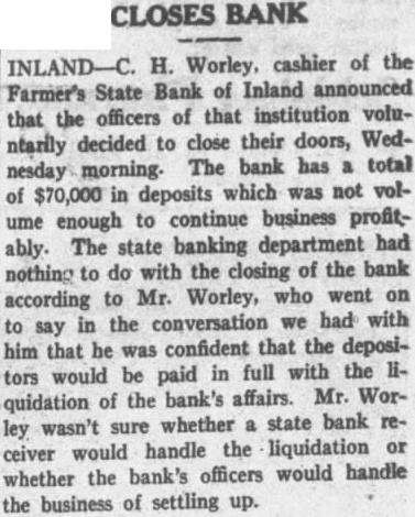 CLOSES BANK INLAND-C. H. Worley, cashier of the Farmer's State Bank of Inland announced that the officers of that institution voluntarily decided to close their doors, Wednesday morning. The bank has a total of $70,000 in deposits which was not volume enough to continue business profitably. The state banking department had nothing to do with the closing of the bank according to Mr. Worley, who went on to say in the conversation we had with him that he was confident that the depositors would be paid in full with the liquidation of the bank's affairs. Mr. Worley wasn't sure whether a state bank receiver would handle the liquidation or whether the bank's officers would handle the business of settling up.