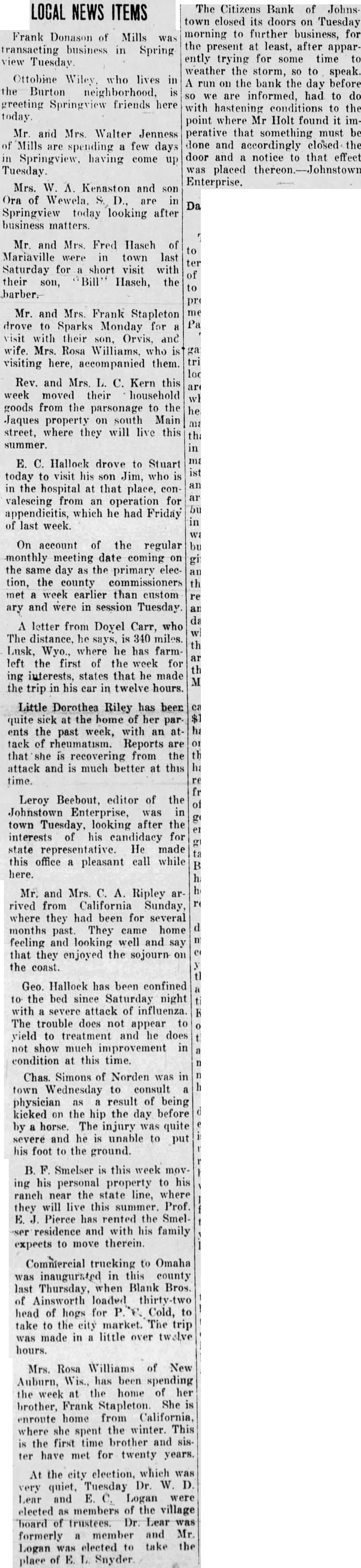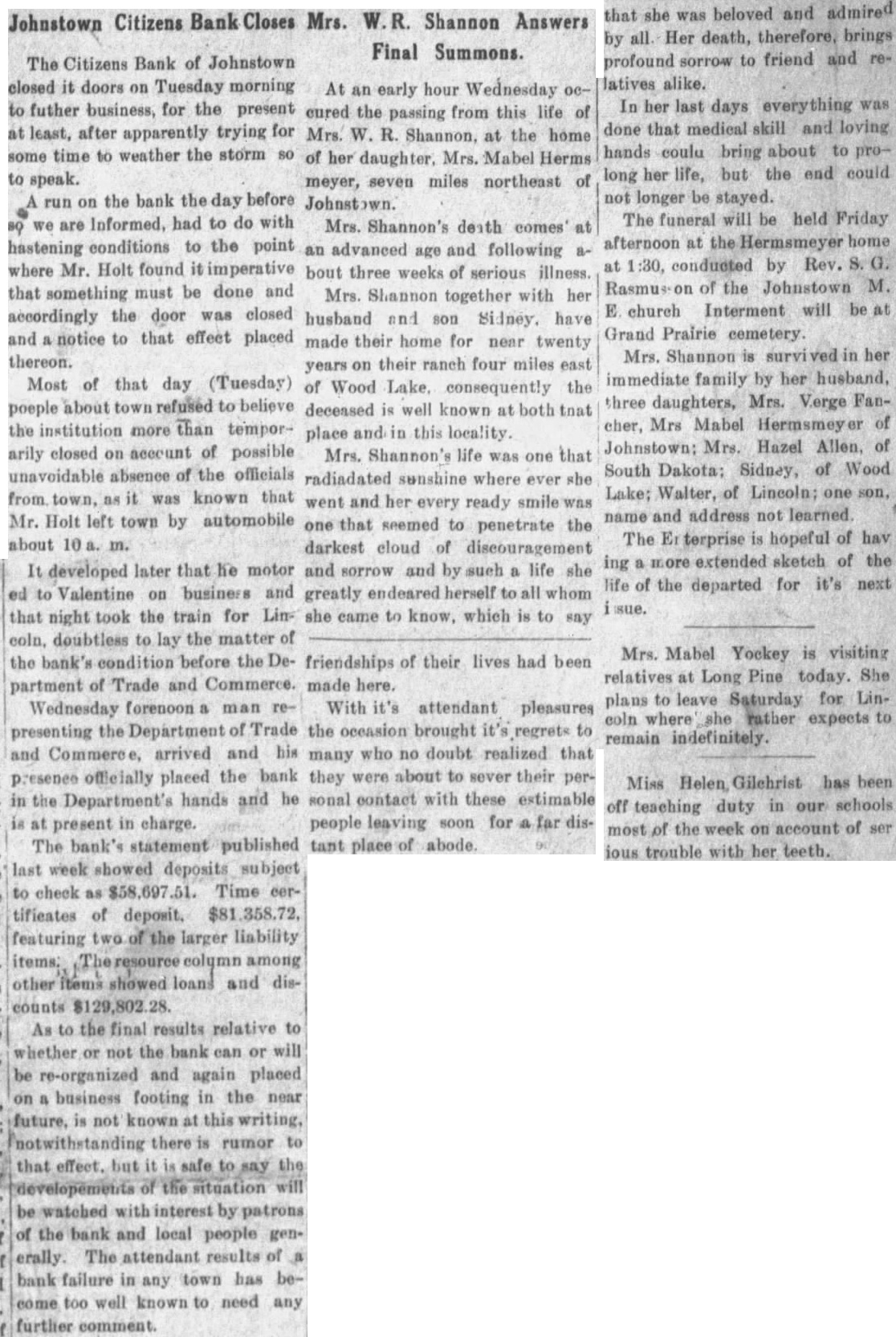 Johnstown Citizens Bank Closes Mrs. W.R. Shannon Answers Final Summons. The Citizens Bank of Johnstown closed it doors on Tuesday morning to futher business, for the present at least, after apparently trying for some time to weather the storm so to speak. A run on the bank the day before so we are Informed, had to do with hastening conditions to the point where Mr. Holt found it imperative that something must be done and accordingly the door was closed and notice to that effect placed thereon. Most of that day (Tuesday) poeple about town refused to believe the institution more than temporarily closed on account of possible unavoidable absence of the officials from town, as it was known that Mr. Holt left town by automobile about 10 a. m. It developed later that he motor ed to Valentine on business and that night took the train for Lincoln, doubtless to lay the matter of the bank's condition before the Department of Trade and Commerce. Wednesday forenoon a man representing the Department of Trade presence officially placed the bank in the Department's hands and he is at present in charge. The bank's statement published last week showed deposits subject to check as $58,697.51 Time cerfeaturing two of the larger liability items: resource column among other items showed loans and discounts $129,802.28 As to the final results relative to whether or not the bank can or will be re-organized and again placed on a business footing in the near future, is not known at this writing, notwithstanding there is rumor to that effect. but it is safe to say the developements of the situation will be watched with interest by patrons of the bank and local people generally. The attendant results of a bank failure in any town has become too well known to need any further comment. At an early hour Wednesday occured the passing from this life of Mrs. W. R. Shannon, at the home of her daughter, Mrs. Mabel Herms meyer, seven miles northeast of Johnstown. Mrs. Shannon's death comes at an advanced age and following about three weeks of serious illness. Mrs. Shannon together with her husband and son Sidney. have made their home for near twenty years on their ranch four miles east of Wood Lake, consequently the deceased is well known at both toat place and in this locality. Mrs. Shannon's life was one that radiadated sunshine where ever she went and her every ready smile was one that seemed to penetrate the darkest cloud of discouragement and sorrow and by such a life she greatly endeared herself to all whom she came to know, which is to say that she was beloved and admired by all. Her death, therefore, brings profound sorrow to friend and relatives alike. In her last days everything was done that medical skill and loving hands coulu bring about to prolong her life, but the end could not longer be stayed. The funeral will be held Friday afternoon at the Hermsmeyer home at 1:30, conducted by Rev. S. G. Rasmus on of the Johnstown M. E church Interment will be at Grand Prairie cemetery. Mrs. Shannon is survived in her immediate family by her husband, three daughters, Mrs. Verge Fancher, Mrs Mabel Hermsmey of Johnstown; Mrs. Hazel Allen, of South Dakota; Sidney, of Wood Lake: Walter, of Lincoln; one son, name and address not learned. The Et terprise is hopeful of hav ing a more extended sketch of the life of the departed for it's next sue. friendships of their lives had been made here. With it's attendant pleasures the oceasion brought it's regrets to they were about to sever their personal contact with these estimable people leaving soon for a far distant place of abode. Mrs. Mabel Yockey is visiting relatives at Long Pine today. She plans to leave Saturday for Lincoln where she rather expects to remain indefinitely. Miss Helen, Gilchrist has been off teaching duty in our schools most of the week on account of ser ious trouble with her teeth.