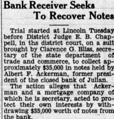 Trial started at Lincoln Tuesday before District Judge B. Chapin ths district on brought by Clarence Bliss, secreof the state of trade and to collect in notes Albert Ackerman, former presiof the closed bank of Julian. The action alleges that Ackerman and mortgage of company which he is secretary, acted to tect their own interests by withdrawing worth of notes from the bank.