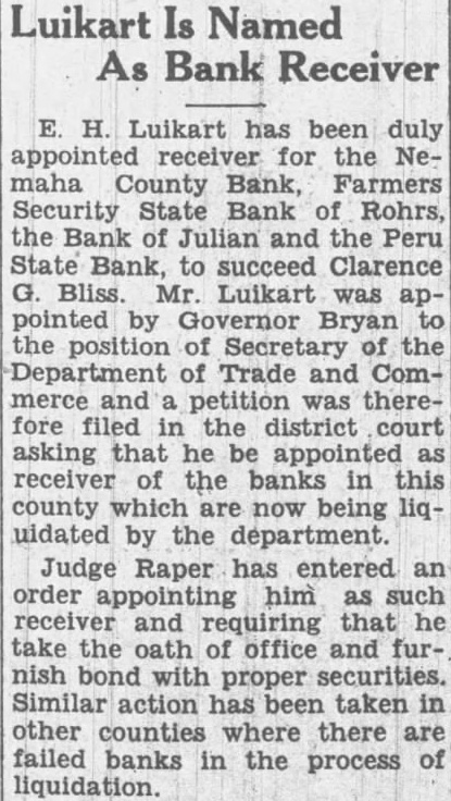 Luikart has been duly appointed receiver for the maha County Bank, Farmers Security State Bank of Rohrs, the Bank of Julian and the Peru State Bank, to succeed Clarence Bliss. Luikart was pointed by Governor Bryan the position of Secretary of the Department of Trade and merce and was fore filed the district asking that he be appointed receiver the banks in this county which are being uidated by the department. Judge Raper has entered order appointing him receiver and requiring that he take the oath of office and furbond with proper Similar action has been taken in other counties where there failed banks in the process liquidation.