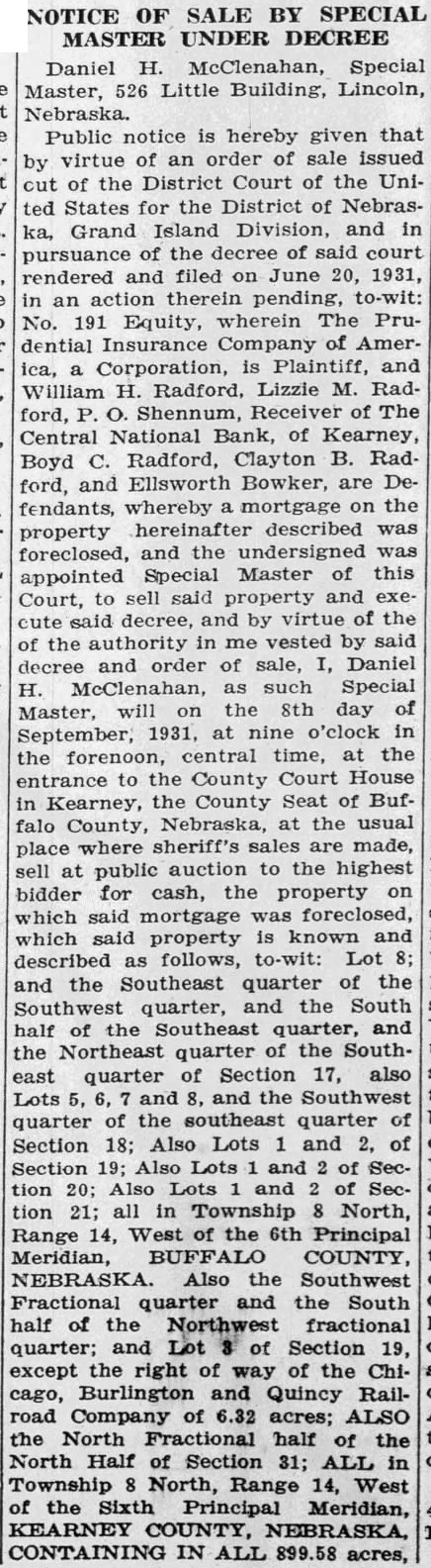 corded by the said defendants Benjamin Armitage and Helen Armitage, his wife, 80 received by the said Grace Coffey and Belle McFerren, defendants, are sisters of the defendant Benjamin A. Armitage, for the fraudulent purpose of cheating, hindering, and defrauding plaintiff in the collecting of his judgments. That George Coffey is the husband of Grace P. Coffey. You are required to answer said petition on Monday the 5th day of March, 1928, or said petition will be taken as true and rendered Dated January 20th, 1928. M. ROSS, As Receiver of City National Bank In Kearney, Plaintiff. j21f18 John Miller & E. L. Randall, Attys. NOTICE TO DEFENDANTS. To Marguerite S. Gildner and Elmer J. defendants: You will take notice that M. Ross, as of The Central National Bank of Nebraska, has begun in the district court of Buffalo county, Nebraska, against you the object and prayer of which is to foreclose mortgage dated March 25, 1924, given by you to S. Donnell and recorded in book 109, page 302, of the mortgage records of Buffalo counNebraska, securing note of $2,and Interest and taxes, and conveying tract of land in the southeast quarter of the quarter of section (35), in Township nine (9) north, Range sixteen (16), west of the sixth principal meridian, in Buffalo county, Nebraska, and heretofore known as the south 130 feet of Block One (1), in Frank's second addition in the city of Kearney, and for the sale of said lands to satisfy the debt and taxes paid in the sum of $701.80 and interest and costs plaintiff default in the conditions of said mortgage are required petition on Monday the 12th day of March, 1928, or said petition will be taken as true and judgment entered thereon. as receiver of The Central National Bank of Kearney, Plaintiff. j26w4 Nye and Nye, Attys. NOTICE TO CREDITORS. In the County Court of Buffalo County, the matter of the of Joseph Kapps, Public hereby given that the creditors of said estate will meet the executor of said estate before said court in the court house in said county on the 4th day of April, 1928, o'clock m., for the purpose of presenting their claims against said estate for examination, adjustment and allowance. Four from the 25th day of 1927, are creditors to file this court their said claims, and all not filed within said time will be barred. Dated this 16th day of January, 1928. (Seal.) J. M. EASTERLING. j17w4 County Judge. Kodak finishing. Midwest Camera Shop CHATTEL MORTGAGE SALE. Notice is given by virtue of chattel dated November 1926, duly filed in the office the clerk of Logan county, Nebraska, executed by Tappan, to secure payment of $382.04, upon which there now due $275.56, default having been made in payment, and no suit or other proceedings at law having been instituted to recover said debt any part thereof. it will sell the property to-wit: One Star Coupe, 1926, factory number L8335, formerly 14L1542, at public auction at 1816 Central Kearney, Nebraska, on the 21st day of February 1928, at o'clock FEDERAL FINANCE COMPANY, j30t20 Mortgagee.