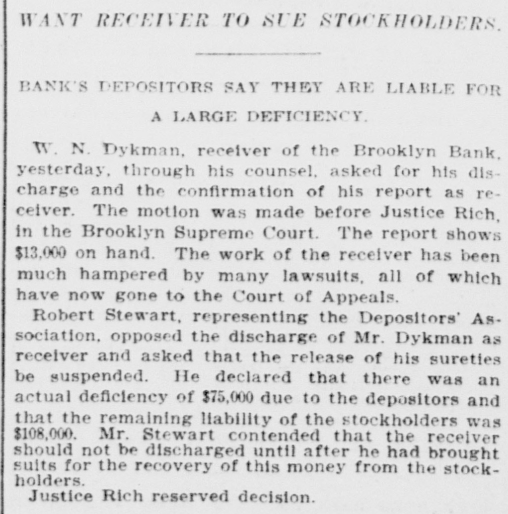WANT RECEIVER TO SUE STOCKHOLDERS BANK'S DEPOSITORS SAY THEY ARE LIABLE FOR A LARGE DEFICIENCY W. N. Dykman, receiver of the Brooklyn Bank. yesterday, through his counsel, asked for his dlscharge and the confirmation of his report as receiver. The motion was made before Justice Rich, in the Brooklyn Supreme Court. The report shows $13,000 on hand. The work of the receiver has been much hampered by many lawsuits, all of which have now gone to the Court of Appeals. Robert Stewart, representing the Depositors' Association, opposed the discharge of Mr. Dykman as receiver and asked that the release of his sureties be suspended. He declared that there was an actual deficiency of $75,000 due to the depositors and that the remaining liability of the stockholders was $108,000. Mr. Stewart contended that the receiver should not be discharged until after he had brought suits for the recovery of this money from the stockholders. Justice Rich reserved decision.