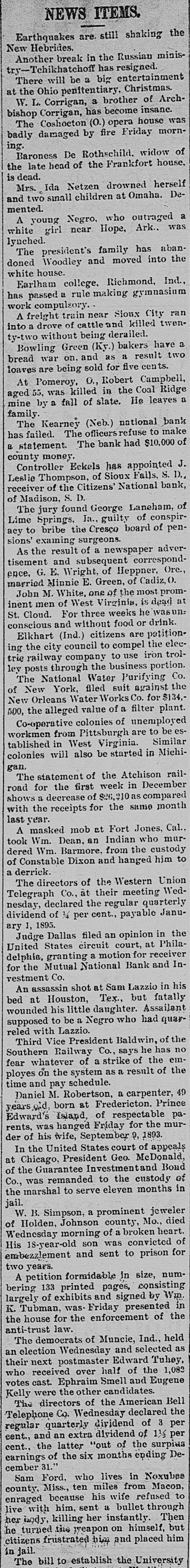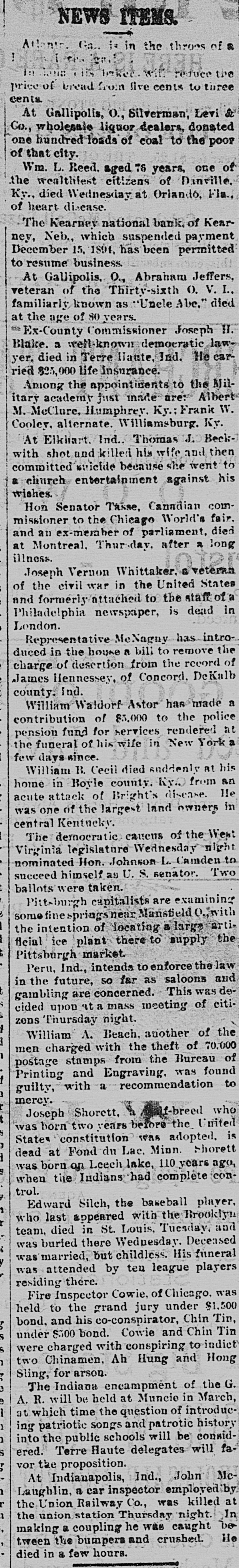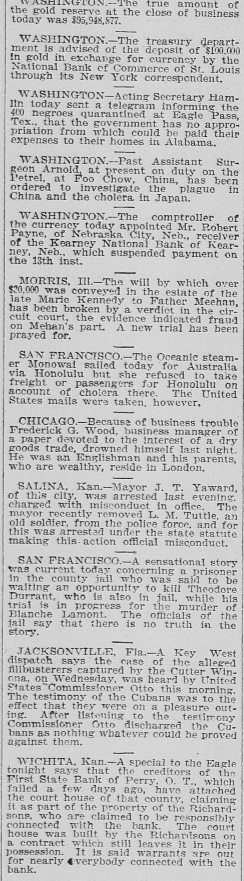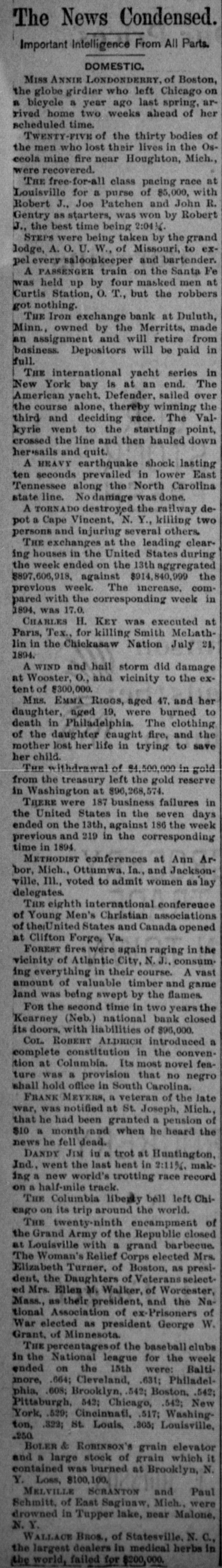 The News Condensed. Important Intelligence From All Parts. DOMESTIC. MISS ANNIE LONDONDERRY, of Boston, the globe girdier who left Chicago on a bicycle a year ago last spring, arrived home two weeks ahead of her scheduled time. TWENTY-FIVE of the thirty bodies of the men who lost their lives in the Osceola mine fire near Houghton, Mich., were recovered. THE free-for-all class pacing race at Louisville for a purse of $5,000, with Robert J., Joe Patchen and John R. Gentry as starters, was won by Robert J., the best time being 2:04 %. STEPS were being taken by the grand lodge, A. O. U. W., of Missouri, to expel levery saloonkeeper and bartender. A PASSENGER train on the Santa Fe was held up by four masked men at Curtis Station, O. T., but the robbers got nothing. THE Iron exchange bank at Duluth, Minn, owned by the Merritts, made an assignment and will retire from basiness. Depositors will be paid in full. THE international yacht series in New York bay is at an end. The American yacht. Defender, sailed over the course alone, thereby winning the third and deciding race. The Valkyrie went to the starting point, crossed the line and then hauled down her'sails and quit. A HEAVY earthquake shock lasting ten seconds prevailed in lower East Tennessee along the North Carolina state line. No damage was done. A TORNADO destroyed the railway depot a Cape Vincent, N. Y., killing two persons and injuring several others. THE exchanges at the leading clearing houses in the United States during the week ended on the 13th aggregated $897,606,918, against $914,840,999 the previous week. The increase, compared with the corresponding week in 1894, was 17.0. CHARLES H. KEY was executed at Paris, Tex., for killing Smith Mebathlin in the Chickasaw Nation July 21, 1894. A WIND and hail storm did damage at Wooster, O., and vicinity to the extent of $300,000. MRS. EMMA RIGGS, aged 47, and her daughter, aged 19, were burned to death in Philadelphia. The clothing of the daughter caught fire, and the mother lost her in trying to save her child. THE withdrawal of $4,500,000 in gold from the treasury left the gold reserve in Washington at $96,268,574. THERE were 187 business failures in the United States in the seven days ended on the 13th, against 186 the week previous and 219 in the corresponding time in 1894. METHODIST conferences at Ann Arbor, Mich., Ottumwa, Ia., and Jacksonville, III., voted to admit women as lay delegates. THE eighth international conference of Young Men's Christian associations of the/United States and Canada opened at Clifton Forge, Va. FOREST fires were again raging in the vicinity of Atlantic City, N. J., consuming everything in their course. A vast amount of valuable timber and game land was being swept by the flames. FOR the second time in two years the Kearney (Neb.) national bank closed its doors, with liabilities of $96,000. CoL. ROBERT ALDRICH introduced a complete constitution in the convention at Columbia. Its most novel fenture was a provision that no negro shall hold office in South Carolina. FRANK MEYERS, a veteran of the late war, was notified at St. Joseph, Mich., that he had been granted a pension of $10 a month and when he heard the news he fell dead. DANDY JIM in a trot at Huntington, Ind. went the last heat in 2:11%. making a new world's trotting race record on a half-mile track. THE Columbia liberty bell left Chicago on its trip around the world. THE twenty-ninth encampment of the Grand Army of the Republic closed at Louisville with a grand barbecue. The Woman's Relief Corps elected Mrs. Elizabeth Turner, of Boston, as president. the Daughters of Veterans selected Mrs. Ellen M, Walker, of Worcester, Mass., as their president, and the National Association of ex-Prisoners of War elected as president George W. Grant, of Minnesota. THE percentagesof the baseball clubs in the National league for the week ended on the 15th were: Baltimore, 664; Cleveland, 631; Philadelphia, 608; Brooklyn, 542; Boston, .542; Pittsburgh, 543: Chicago, .542; New York, 529; Cincinnati, .517; Washington, 323; St. Louis, .305; Louisville, -250 BOLER & ROBINSON'S grain elevator and a large stock of grain which it contained was burned at Brooklyn, N. Y. Loss, $100,100. MELVILLE SCRANTON and Paul Schmitt, of East Saginaw, Mich., were drowned in Tupper lake, near Malone, N.Y.