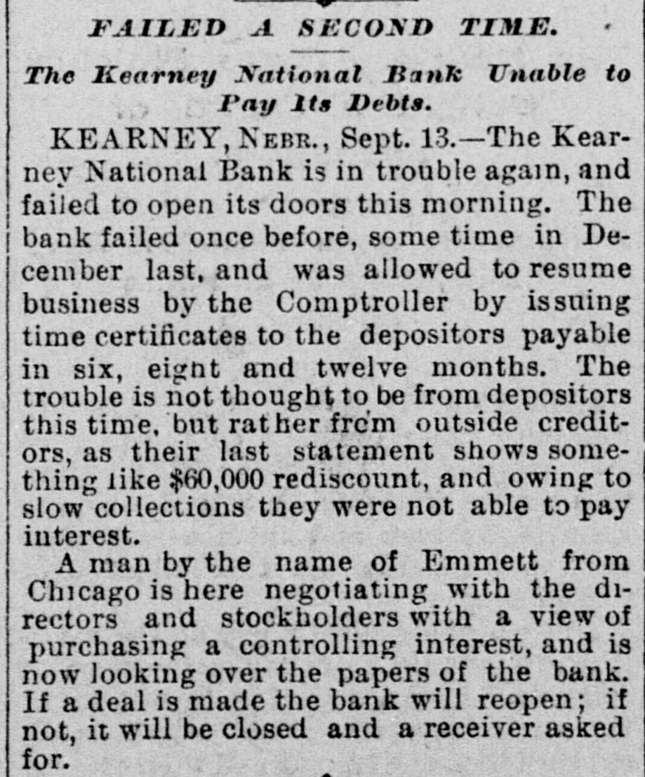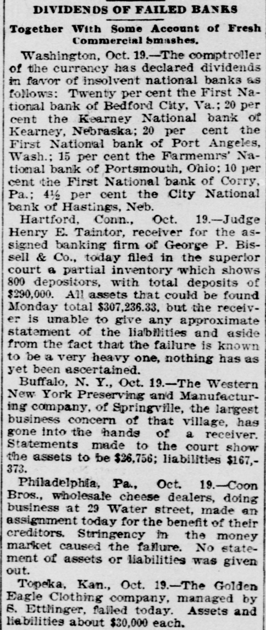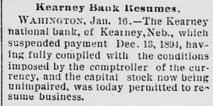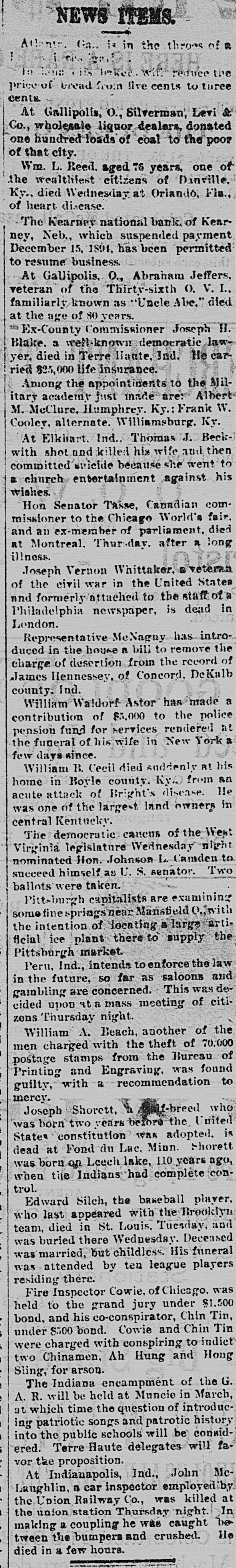 The News Condensed. Important Intelligence From All Parts. DOMESTIC. MISS ANNIE LONDONDERRY, of Boston, the globe girdier who left Chicago on a bicycle a year ago last spring, arrived home two weeks ahead of her scheduled time. TWENTY-FIVE of the thirty bodies of the men who lost their lives in the Osceola mine fire near Houghton, Mich., were recovered. THE free-for-all class pacing race at Louisville for a purse of $5,000, with Robert J., Joe Patchen and John R. Gentry as starters, was won by Robert J., the best time being 2:04 %. STEPS were being taken by the grand lodge, A. O. U. W., of Missouri, to expel levery saloonkeeper and bartender. A PASSENGER train on the Santa Fe was held up by four masked men at Curtis Station, O. T., but the robbers got nothing. THE Iron exchange bank at Duluth, Minn, owned by the Merritts, made an assignment and will retire from basiness. Depositors will be paid in full. THE international yacht series in New York bay is at an end. The American yacht. Defender, sailed over the course alone, thereby winning the third and deciding race. The Valkyrie went to the starting point, crossed the line and then hauled down her'sails and quit. A HEAVY earthquake shock lasting ten seconds prevailed in lower East Tennessee along the North Carolina state line. No damage was done. A TORNADO destroyed the railway depot a Cape Vincent, N. Y., killing two persons and injuring several others. THE exchanges at the leading clearing houses in the United States during the week ended on the 13th aggregated $897,606,918, against $914,840,999 the previous week. The increase, compared with the corresponding week in 1894, was 17.0. CHARLES H. KEY was executed at Paris, Tex., for killing Smith Mebathlin in the Chickasaw Nation July 21, 1894. A WIND and hail storm did damage at Wooster, O., and vicinity to the extent of $300,000. MRS. EMMA RIGGS, aged 47, and her daughter, aged 19, were burned to death in Philadelphia. The clothing of the daughter caught fire, and the mother lost her in trying to save her child. THE withdrawal of $4,500,000 in gold from the treasury left the gold reserve in Washington at $96,268,574. THERE were 187 business failures in the United States in the seven days ended on the 13th, against 186 the week previous and 219 in the corresponding time in 1894. METHODIST conferences at Ann Arbor, Mich., Ottumwa, Ia., and Jacksonville, III., voted to admit women as lay delegates. THE eighth international conference of Young Men's Christian associations of the/United States and Canada opened at Clifton Forge, Va. FOREST fires were again raging in the vicinity of Atlantic City, N. J., consuming everything in their course. A vast amount of valuable timber and game land was being swept by the flames. FOR the second time in two years the Kearney (Neb.) national bank closed its doors, with liabilities of $96,000. CoL. ROBERT ALDRICH introduced a complete constitution in the convention at Columbia. Its most novel fenture was a provision that no negro shall hold office in South Carolina. FRANK MEYERS, a veteran of the late war, was notified at St. Joseph, Mich., that he had been granted a pension of $10 a month and when he heard the news he fell dead. DANDY JIM in a trot at Huntington, Ind. went the last heat in 2:11%. making a new world's trotting race record on a half-mile track. THE Columbia liberty bell left Chicago on its trip around the world. THE twenty-ninth encampment of the Grand Army of the Republic closed at Louisville with a grand barbecue. The Woman's Relief Corps elected Mrs. Elizabeth Turner, of Boston, as president. the Daughters of Veterans selected Mrs. Ellen M, Walker, of Worcester, Mass., as their president, and the National Association of ex-Prisoners of War elected as president George W. Grant, of Minnesota. THE percentagesof the baseball clubs in the National league for the week ended on the 15th were: Baltimore, 664; Cleveland, 631; Philadelphia, 608; Brooklyn, 542; Boston, .542; Pittsburgh, 543: Chicago, .542; New York, 529; Cincinnati, .517; Washington, 323; St. Louis, .305; Louisville, -250 BOLER & ROBINSON'S grain elevator and a large stock of grain which it contained was burned at Brooklyn, N. Y. Loss, $100,100. MELVILLE SCRANTON and Paul Schmitt, of East Saginaw, Mich., were drowned in Tupper lake, near Malone, N.Y.