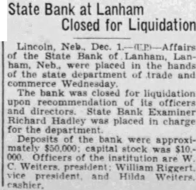 State Bank at Lanham Closed for Liquidation Lincoln, Neb., Dec Affairs of the State Bank of Lanham, Lanham, Neb., were placed in the hands of the state department of trade and The bank was closed for liquidation upon of its officers and directors. State Bank Examiner Richard Hadley was placed in charge for the department Deposits of the bank were approxi$50,000 capital stock was $10.000 Officers of the institution are W C. Weiters president William Riggert vice and Hilda