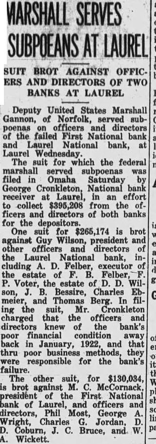 FILES EQUITY SEEKING ACCOUNTING FROM BANK OFFICERS Receiver Charges Bad Banking in Suit Against Officers of Laurel Banks. bankand charges that they did not ing conduct their banks in accordance national banking act, are tained in suit in equity filed by ceiver George Cronkleton against ficers and directors of the First tional bank of Laurel, Nebr., and the Laurel National bank in federal court here today. Cronkleton asks for an accounting from officers of the First National and from Laurel National, claiming that most these assets were lost through improper handling the officials. Capital stock of both institutions admittedly impaired before they closed their doors, Cronkleton charand the reserve had dwindled ges, nothing. The Laurel National closMay 1927 and the First tional February 1928. Those named in the suit follow: the Laurel Wilson, Johnson, Thomas Berge, Voter. Wilson, Bessire, Charles Ebmeier and Felber, who executor for John Felber. deceased. First D. Coburn, Phil Most, Wickett, Charles Jordan and George Wright. BILL REPORTED Feb. The army housing bill passed by the house last May was favorably ported Friday by the senate military