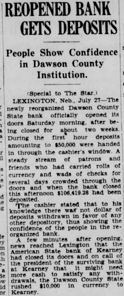 REOPENED BANK GETS DEPOSITS People Show Confidence in Dawson County Institution. (Special to The Star.) LEXINGTON, Neb., July 27-The newly reorganized Dawson County State bank officially opened its doors Saturday morning. after being closed for about two weeks. During the first hour deposits amounting to $50,000 were handed in through the cashier's window A steady stream of patrons and friends who had carried rolls of currency and wads of checks for several days crowded through the doors and when bank closed this afternoon $106,419.28 had been deposited. The cashier stated that to his knowledge there was not dollar of deposits withdrawn in favor of any other depository, thus showing the confidence of the people in the reorganized bank A few minutes after opening. news reached Lexington that the American State bank of Kearney had closed its doors and on call of the president of the surviving bank at Kearney that might need more cash to satisfy any withdrawals, the Dawson County State to rushed $10,000 in currency