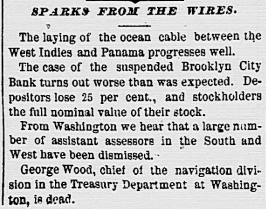 SPARKS FROM THE WIRES. The laying of the ocean cable between the West Indies and Panama progresses well. The case of the suspended Brooklyn City Bank turns out worse than was expected. Depositors lose 25 per cent., and stockholders the full nominal value of their stock. From Washington we hear that a large number of assistant assessors in the South and West have been dismissed. George Wood, chief of the navigation division in the Treasury Department at Washington, is dead.