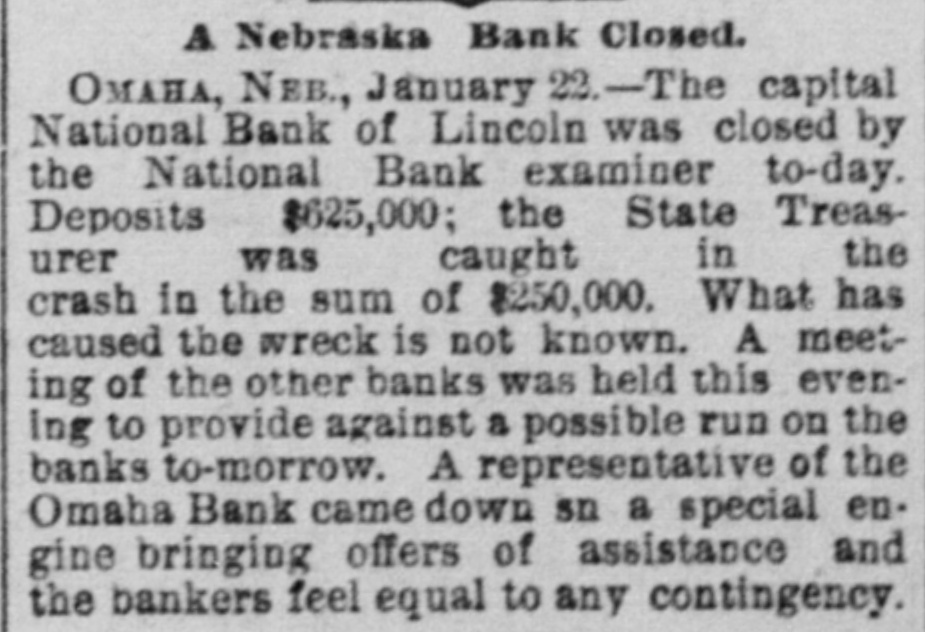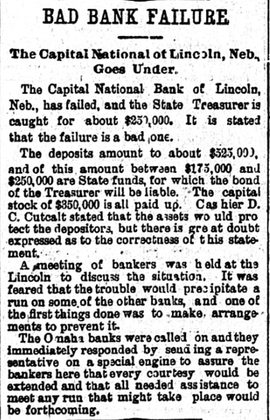 BAD BANK FAILURE The Capital National of Lincoln, Neb, Goes Under. The Capital National Bank of Lincoln, Neb., has failed, and the State Treasurer is caught for about $251,000. It is stated that the failure is a bad one. The deposits amount to about $523,000. and of this amount between $173,000 and $250,000 are State funds, for which the bond of the Treasurer will be liable. The capital stock of $350,000 is all paid up. Cas hier D. C. Cutcalt stated that the assets wo uld pro tect the depositors, but there is gre at doubt expressed as to the correctness of t his state ment. A meeting of bankers was h eld at the Lincoln to discuss the situation. It was feared that the trouble would precipitate a run on some of the other banks, and one of the first things done was to make, arrange ments to prevent it. The o naha banks were called on and ithey immediately responded by send ing a representative on a special engine to assure the bankers here that every courtesy would be extended and that all needed assistance to meet any run that might take place would be forthcoming.