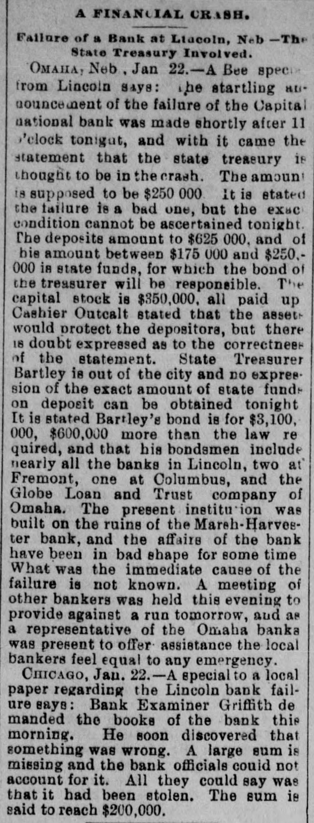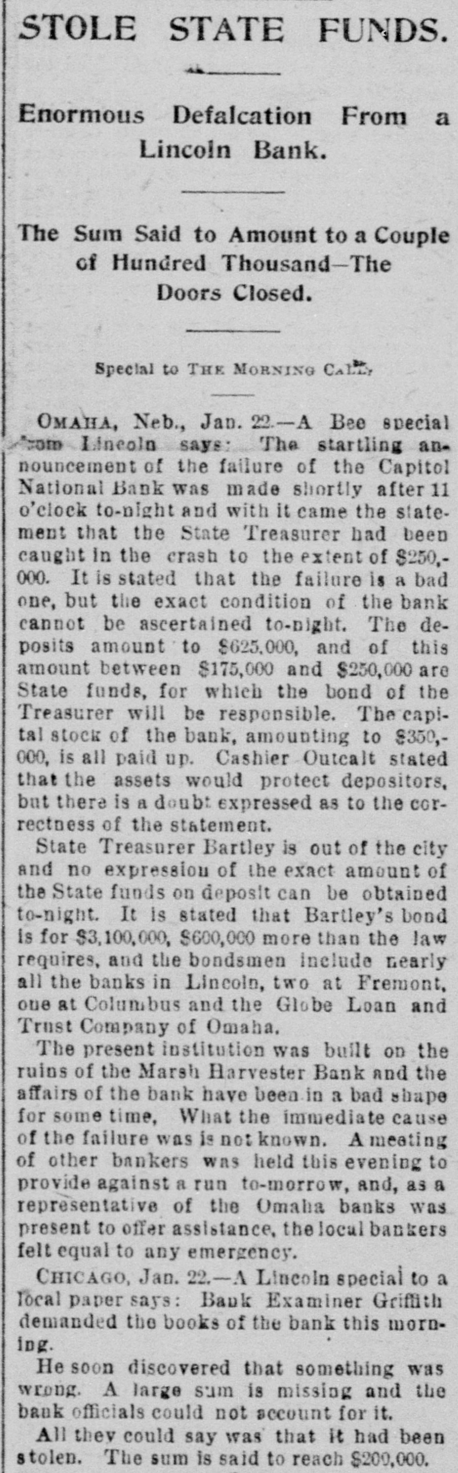 STOLE STATE FUNDS. Enormous Defalcation From a Lincoln Bank. The Sum Said to Amount to a Couple of Hundred Thousand-The Doors Closed. Special to THE MORNING CALD OMAHA, Neb., Jan. 22.-A Bee special com Lincoln says: The startling an. nouncement of the failure of the Capitol National Bank was made shortly after 11 o'clock to-night and with it came the statement that the State Treasurer had been caught in the crash to the extent of $250.000. It is stated that the failure is a bad one, but the exact condition of the bank cannot be ascertained to-night. The deposits amount to $625,000, and of this amount between $175,000 and $250,000 are State funds, for which the bond of the Treasurer will be responsible. The capital stock of the bank, amounting to $350,000, is all paid up. Cashier Outcalt stated that the assets would protect depositors, but there is a doubt expressed as to the correctness of the statement. State Treasurer Bartley is out of the city and no expression of the exact amount of the State funds on deposit can be obtained to-night. It is stated that Bartley's bond is for $3,100,000, $600,000 more than the law requires, and the bondsmen include nearly all the banks in Lincoln, two at Fremont, one at Columbus and the Globe Loan and Trust Company of Omaha, The present institution was built on the ruins of the Marsh Harvester Bank and the affairs of the bank have been in a bad shape for some time, What the immediate cause of the failure was is not known. A meating of other bankers was held this evening to provide against a run to-morrow, and, as a representative of the Omaha banks was present to offer assistance, the local bankers felt equal to any emergency. CHICAGO, Jan. 22.-A Lincoln special to a Tocal paper says: Bank Examiner Griffth demanded the books of the bank this morning. He soon discovered that something was wrong. A large sum is missing and the bank officials could not account for it. All they could say was that it had been stolen. The sum is said to reach $200,000.