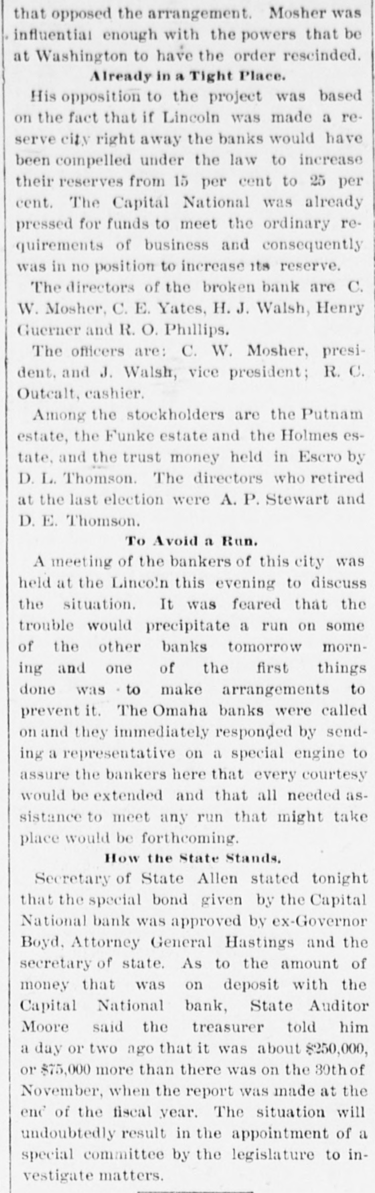 that opposed the arrangement Mosher was influential enough with the powers that be at Washington to have the order rescinded. Already in a Tight Place. His opposition to the project was based on the fact that if Lincoln was made a reserve city right away the banks would have been compelled under the law to increase their reserves from 15 per cent to 25 per cent. The Capital National was already pressed for funds to meet the ordinary requirements of business and consequently was in no position to increase its reserve. The directors of the broken bank are C. W. Mosher, C. E. Yates, H. J. Walsh, Henry Guerner and R. O. Phillips. The officers are: C. W. Mosher, president. and J. Walsh, vice president; R. C. Outcalt, cashier. Among the stockholders are the Putnam estate, the Funke estate and the Holmes estate. and the trust money held in Escro by D. L. Thomson. The directors who retired at the last election were A. P. Stewart and D. E. Thomson. To Avoid a Run. A meeting of the bankers of this city was held at the Lincoln this evening to discuss the situation. It was feared that the trouble would precipitate a run on some of the other banks tomorrow morning and one of the first things done was . to make arrangements to prevent it. The Omaha banks were called on and they immediately responded by sending a representative on a special engine to assure the bankers here that every courtesy would be extended and that all needed assistance to meet any run that might take place would be forthcoming. How the State Stands. Secretary of State Allen stated tonight that the special bond given by the Capital National bank was approved by ex-Governor Boyd. Attorney General Hastings and the secretary of state. As to the amount of money that was on deposit with the Capital National bank, State Auditor Moore said the treasurer told him a day or two ago that it was about $250,000, or $75,000 more than there was on the 30th of November, when the report was made at the end of the fiscal year. The situation will undoubtedly result in the appointment of a special committee by the legislature to investigate matters.