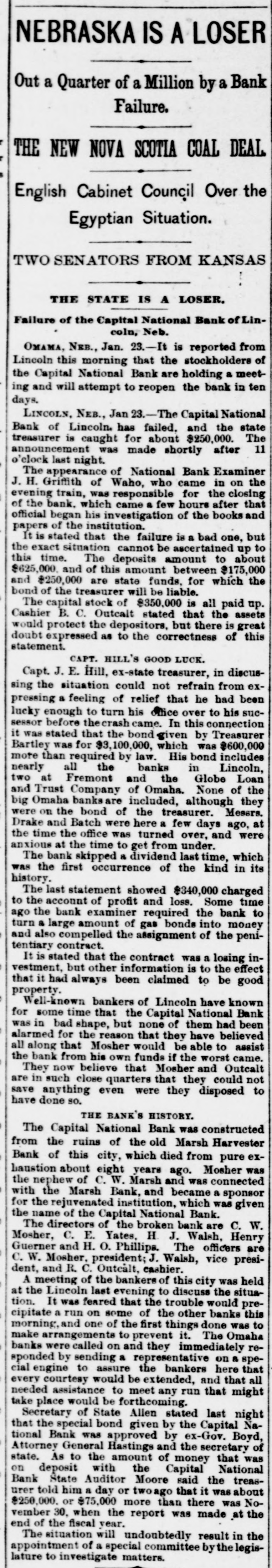 NEBRASKA IS A LOSER Out a Quarter of a Million bya Bank Failure. THE NEW NOVA SCOTIA COAL DEAL English Cabinet Council Over the Egyptian Situation. TWO SENATORS FROM KANSAS THE STATE IS A LOSER. Failure of the Capital National Bank of Lincoln, Neb. OMAMA, NEB., Jan. 23.-It is reported from Lincoln this morning that the stockholders of the Capital National Bank are holding a meeting and will attempt to reopen the bank in ten days. LINCOLN. NEB., Jan 23.-The Capital National Bank of Lincoln. has failed, and the state The treasurer is caught for about $250,000. 11 announcement was made shortly after 'clock The appearance last night. of National Bank Examiner the J. H. Griffith of Waho, who came in on evening train, was responsible for the closing that of the bank. which came a few hours after and official began his investigation of the books papers of the institution. It is stated that the failure is a bad one, but the exact situation cannot be ascertained up to this time. The deposits amount to about $625,000. and of this amount between $175,000 the and $250,000 are state funds. for which bond of the treasurer will be liable. The capital stock of $350,000 is all paid up. Cashier B. C. Outcalt stated that the assets would protect the depositors, but there is great this doubt expressed as to the correctness of statement. CAPT. HILL'S GOOD LUCK. Capt. J. E. Hill, ex-state treasurer, in discussing the situation could not refrain from exa feeling of relief that he had been to turn his office over to sucbefore the crash came. In this sessor lucky pressing enough connection Treasurer his it that the bond given by was for $3,100,000, which was more than by law. His bond Bartley was stated required includes $600,000 all the banks in Lincoln, nearly two at Fremont and the Globe Loan and Trust Company of Omaha. None of the Omaha banks are included, although they were big on the bond of the treasurer. Mesers. Drake and Batch were here a few days ago, at the time the office was turned over, and were anxious at the time to get from under. The bank skipped a dividend last time, which was the first occurrence of the kind in its history. The last statement showed 340,000 charged to the account of profit and loss. Some time the bank examiner required the bank to ago turn a large amount of gas bonds into money and also compelled the assignment of the penitentiary It is stated contract. that the contract was a losing investment, but other information is to the effect that it had always been claimed to be good property. Well-known bankers of Lincoln have known time that the Capital National Bank bad but none of them for the reason that they alarmed was for in some shape, have able had believed assist been all along that Mosher would be to the bank from his own funds if the worst came. They now believe that Mosher and Outcalt in such close quarters that they could not have done so. are save anything even were they disposed to THE BANK'S HISTORY. The Capital National Bank was constructed ruins of the old Marsh Harvester of this city, which died pure from Bank the from Mosher exlaustion about eight years ago. was of C. W. Marsh and was connected the Marsh Bank, and became a sponsor institution, was for the with the nephew rejuvenated which given the of the Capital National Bank. of the broken bank are c. E. Yates. H J. Mosher, The name directors Walsh, Henry C. are W. Guerner and H. O. Phillips. The officers C. W. Mosher. president; Walsh, vice president, and R. C. Outcalt, cashier. A meeting of the bankers of this city was held the Lincoln last evening to discuss the situaat It was feared that the trouble would prea run on some of the and one of the first things done was to morning, tion. cipitate other The banks Omaha this make arrangements to prevent it. banks were called on and they immediately responded by sending a representative on special engine to assure the bankers here that all courtesy would be extended, and that might every needed assistance to meet any run that take place would be forthcoming. Secretary of State Allen stated last night that the special bond given by the Capital NaBank was approved by Boyd, General Hastings and the of to the amount of money Attorney state. tional As ex-Gov. secretary that was deposit with the Capital National on Bank State Auditor Moore said the treastold him a day or twoago that it was about urer $250,000. or $75,000 more than there was No- the vember 30. when the report was made at end of the fiscal year. The situation will undoubtedly result in the appointment of a special committee by the legislature to investigate matters.