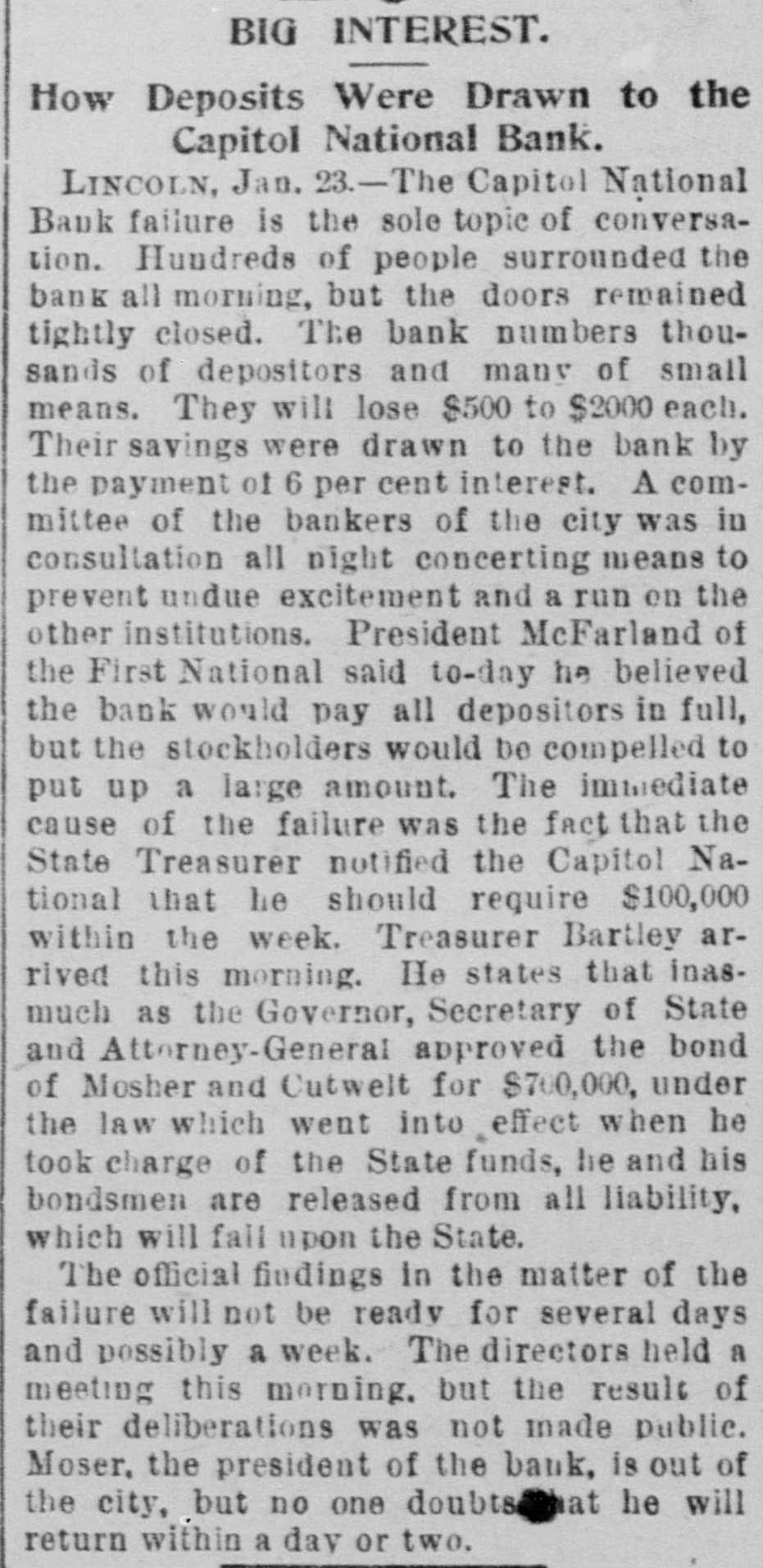BIG INTEREST. How Deposits Were Drawn to the Capitol National Bank. LINCOLN, Jan. 23.-The Capitol National Bank failure is the sole topic of conversation. Hundreds of people surrounded the bank all morning, but the doors remained tightly closed. The bank numbers thousands of depositors and many of small means. They will lose $500 to $2000 each. Their savings were drawn to the bank by the payment of 6 per cent interest. A committee of the bankers of the city was in consultation all night concerting means to prevent undue excitement and a run en the other institutions. President McFarland of the First National said to-day he believed the bank would pay all depositors in full, but the stockholders would be compelled to put up a large amount. The immediate cause of the failure was the fact that the State Treasurer notified the Capitol National that he should require $100,000 within the week. Treasurer Bartley arrived this morning. He states that inasmuch as the Governor, Secretary of State and Attorney-General approved the bond of Mosher and Cutwelt for $700,000, under the law which went into effect when he took charge of the State funds, he and his bondsmen are released from all liability, which will fall upon the State. The official findings in the matter of the failure will not be ready for several days and possibly a week. The directors held a meeting this morning. but the result of their deliberations was not made public. Moser, the president of the bank, is out of at he will the city, but no one doubts return within a day or two.