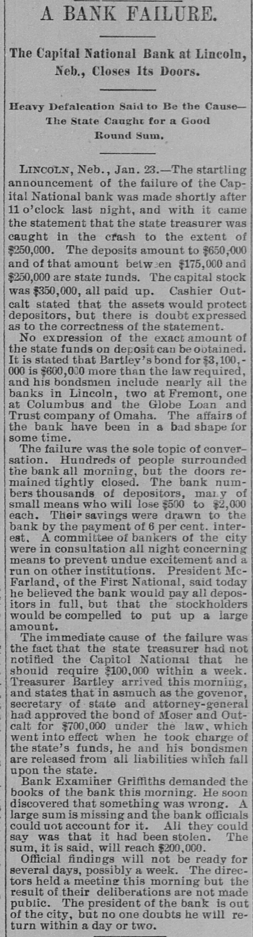 A BANK FAILURE. The Capital National Bank at Lincoln, Neb., Closes Its Doors. Heavy Defalcation Said to Be the CauseThe State Caught for a Good Round Sum. LINCOLN, Neb., Jan. 23.-The startling announcement of the failure of the Capital National bank was made shortly after 11 o'clock last night, and with it came the statement that the state treasurer was caught in the crash to the extent of $250,000. The deposits amount to $650,000 and of that amount between $175,000 and $250,000 are state tunds. The capital stock was $350,000, all paid up. Cashier Outcalt stated that the assets would protect depositors, but there is doubt expressed as to the correctness of the statement. No expression of the exact amount of the state funds on deposit can be obtained. It is stated that Bartley's bond for $3,100,000 is $600,000 more than the law required, and his bondsmen include nearly all the banks in Lincoln, two at Fremont, one at Columbus and the Globe Loan and Trust company of Omaha. The affairs of the bank have been in a bad shape for some time. The failure was the sole topic of conversation. Hundreds of people surrounded the bank all morning, but the doors remained tightly closed. The bank numbers thousands of depositors, maly of small means who will lose $500 to $2,000 each. Their savings were drawn to the bank by the payment of 6 per cent. interest, A committee of bankers of the city were in consultation all night concerning means to prevent undue excitement and a run on other institutions. President McFarland, of the First National, said today he believed the bank would pay all depositors in full, but that the stockholders would be compelled to put up a large amount. The immediate cause of the failure was the fact that the state treasurer had not notified the Capitol National that he should require $100,000 within a week. Treasurer Bartley arrived this morning, and states that in asmuch as the govenor, secretary of state and attorney-general had approved the bond of Moser and Outcalt for $700,000 under the law, which went into effect when he took charge of the state's funds, he and his bondsmen are released from all liabilities which fall upon the state. Bank Examiner Griffiths demanded the books of the bank this morning. He soon discovered that something was wrong. A large sum is missing and the bank officials could not account for it. All they could say was that it had been stolen. The sum, it is said, will reach $200,000. Official findings will not be ready for several days, possibly a week. The directors held a meeting this morning but the result of their deliberations are not made public. The president of the bank is out of the city, but no one doubts he will return within a day or two.