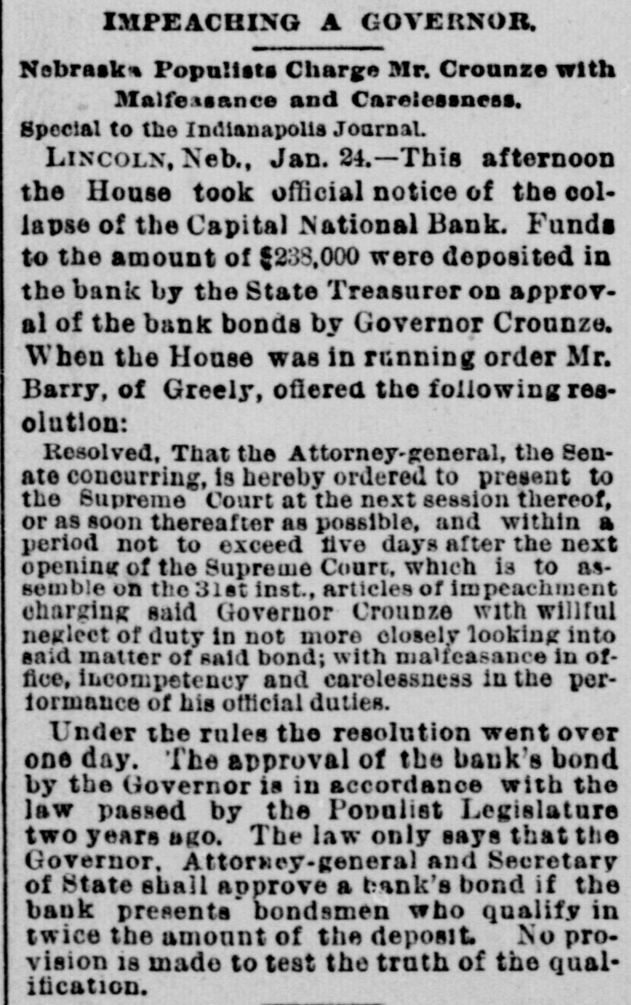 IMPEACHING A GOVERNOR. Nebraska Populists Charge Mr. Crounze with Malfessance and Carelessness. Special to the Indianapolis Journal. LINCOLN, Neb., Jan. 24.-This afternoon the House took official notice of the collapse of the Capital National Bank. Funds to the amount of $238,000 were deposited in the bank by the State Treasurer on approval of the bank bonds by Governor Crounze. When the House was in running order Mr. Barry, of Greely, offered the following resolution: Resolved, That the Attorney-general, the Senate concurring, is hereby ordered to present to the Supreme Court at the next session thereof, or as soon thereafter as possible, and within a period not to exceed five days after the next opening of the Supreme Court, which is to assemble on the 31stinst., articles of im peachment charging said Governor Crounze with willful neglect of duty in not more closely looking into said matter of said bond; with malfeasance in office, incompetency and carelessness in the performance of his official duties. Under the rules the resolution went over one day. The approval of the bank's bond by the Governor is in accordance with the law passed by the Populist Legislature two years ago. The law only says that the Governor. Attorsey-general and Secretary of State shall approve a bank's bond if the bank presents bondsmen who qualify in twice the amount of the deposit. No provision is made to test the truth of the qualitication.
